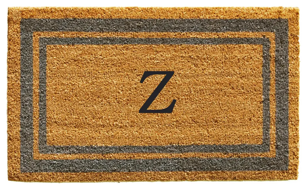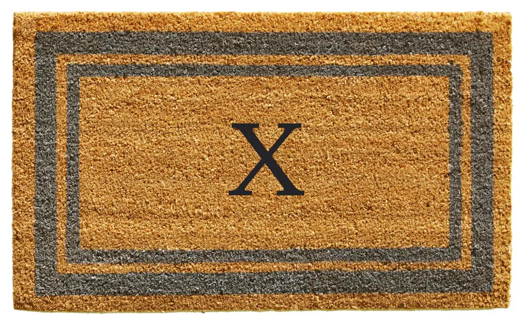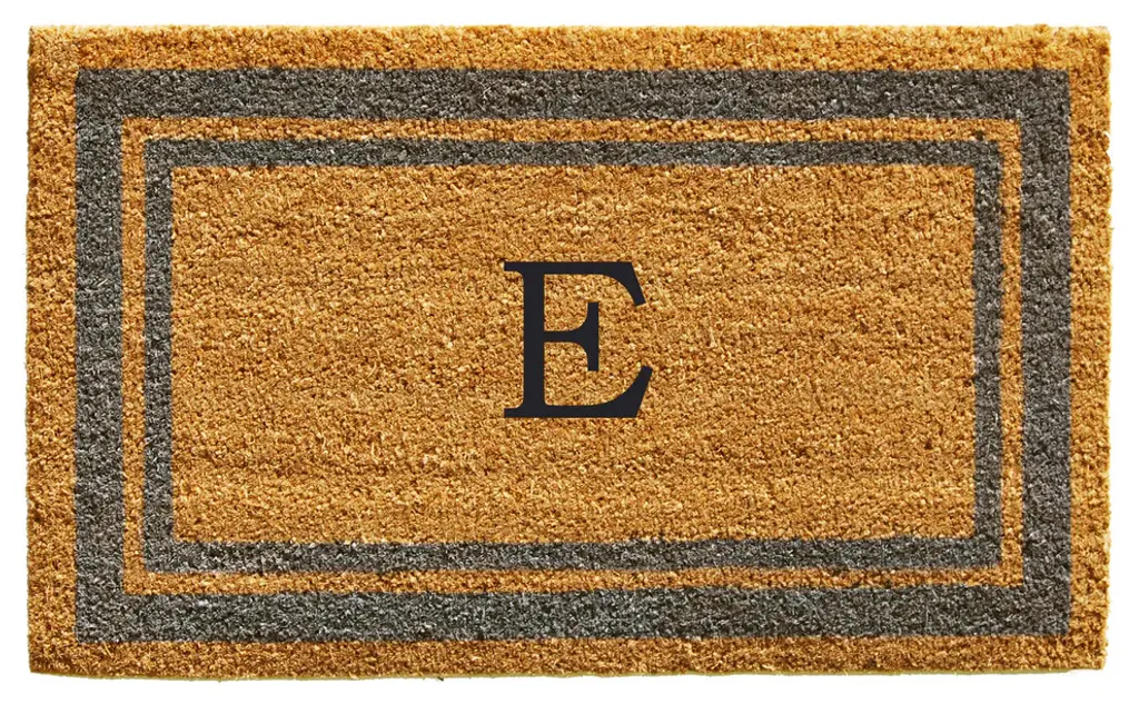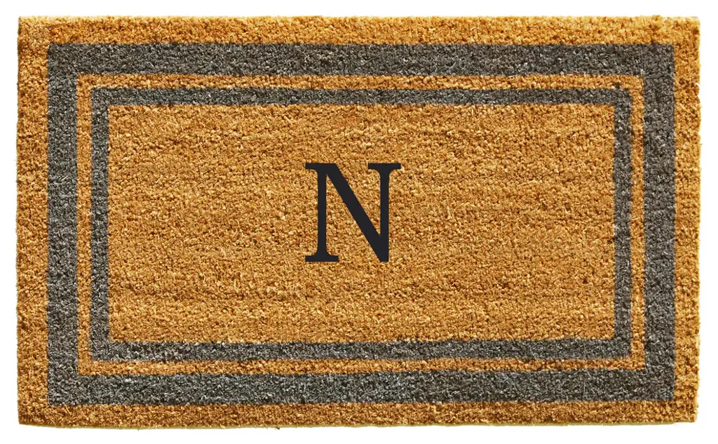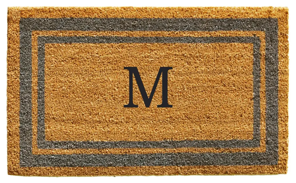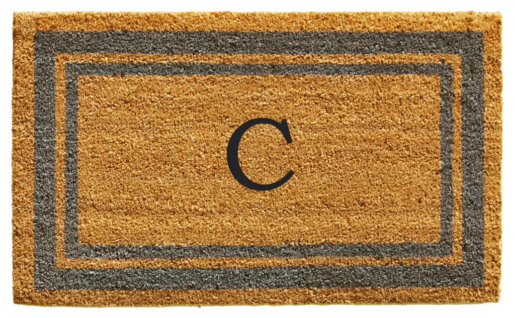 Brighten your entry with this beautiful over-sized monogrammed doormat. Made of natural coir, a durable fiber that scrapes shoe bottoms clean, this doormat has a prominent double border that encases your initial and is vinyl backed to help prevent movement when walked on. Weather tolerant and colorfast, coir doormats absorb moisture, retain their shape and do not mat down regardless of the traffic. Vacuum, shake or lightly hose clean and allow to dry.