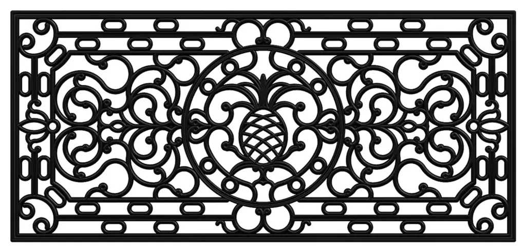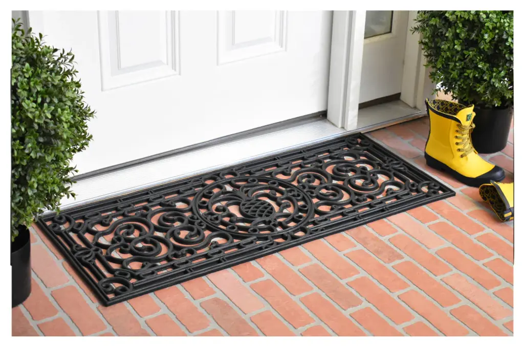 Over-sized to provide more coverage, this beautiful doormat is made of 100% rubber and is impervious to the elements of weather. Detailed scroll that emulates wrought iron, this heavy-duty mat makes a gorgeous addition to any porch or patio area. Hose clean.