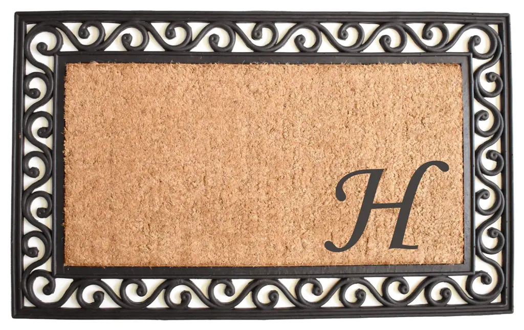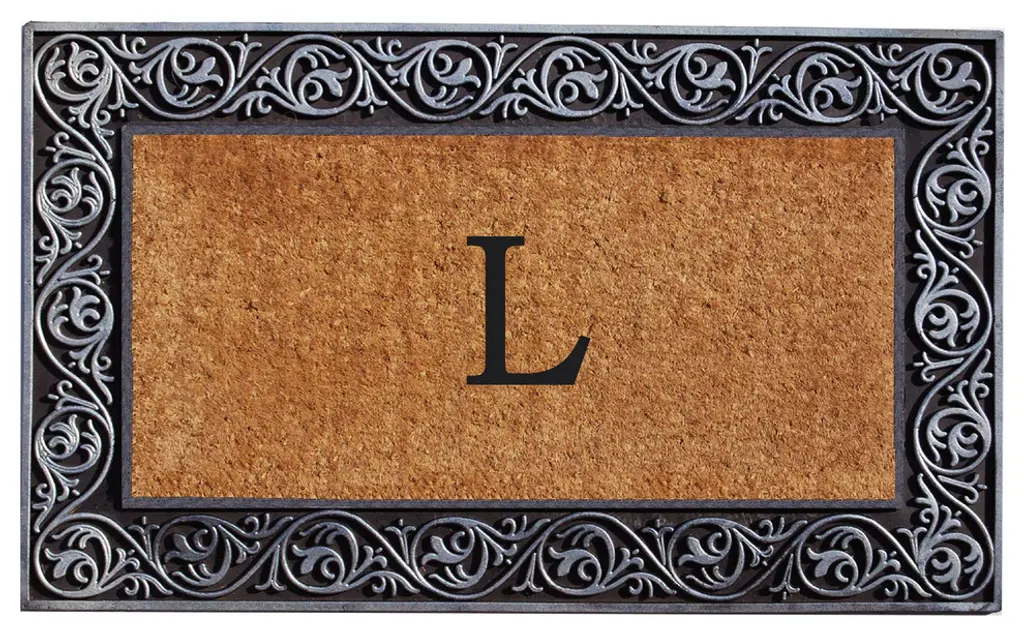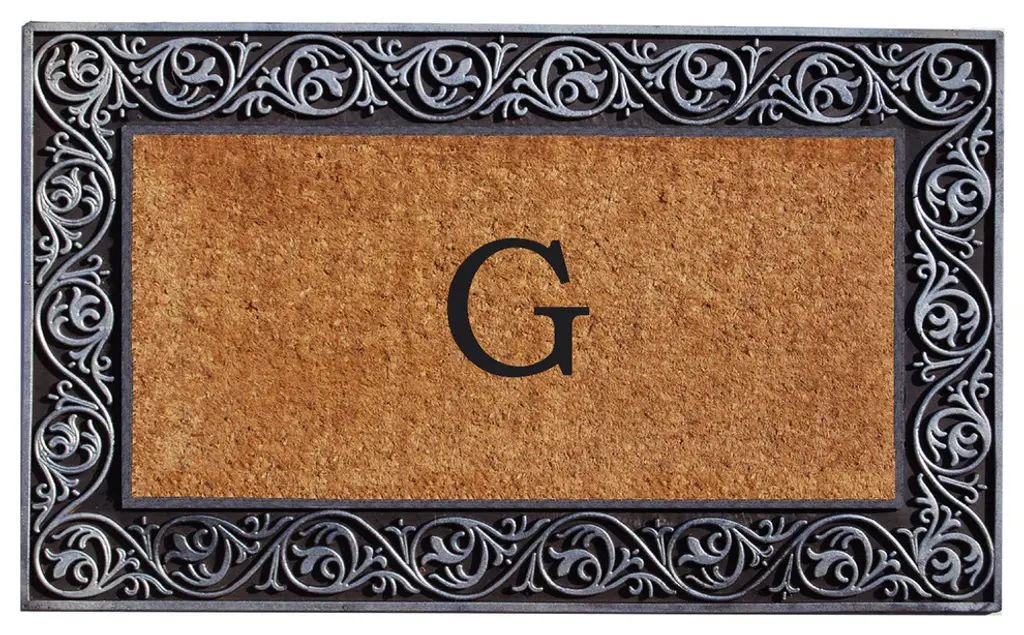 Durable and so impressive, this monogrammed doormat makes a beautiful addition to any home entryway. Made of heavy-duty silver rubber and natural coir that scrapes shoes clean and absorbs moisture. Vacuum, sweep or lightly hose clean and allow to dry.