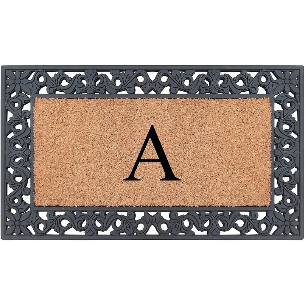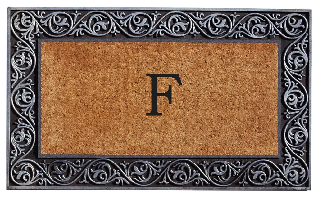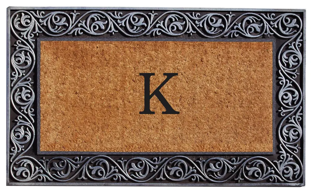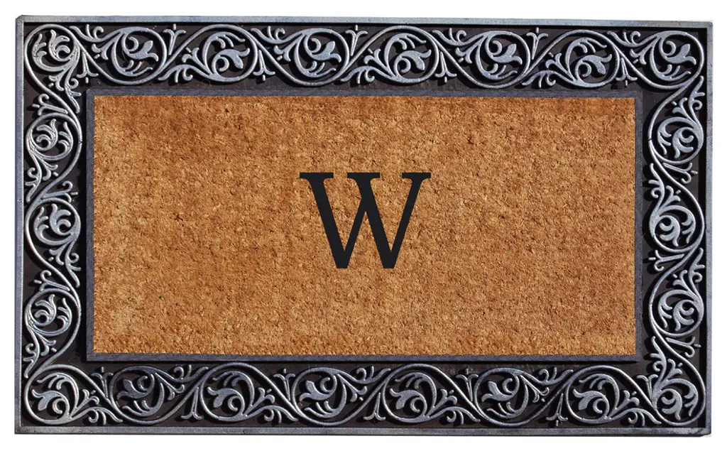 Durable and so impressive, this monogrammed doormat makes a beautiful addition to any home entryway. Made of heavy-duty silver rubber and natural coir that scrapes shoes clean and absorbs moisture. Vacuum, sweep or lightly hose clean and allow to dry.