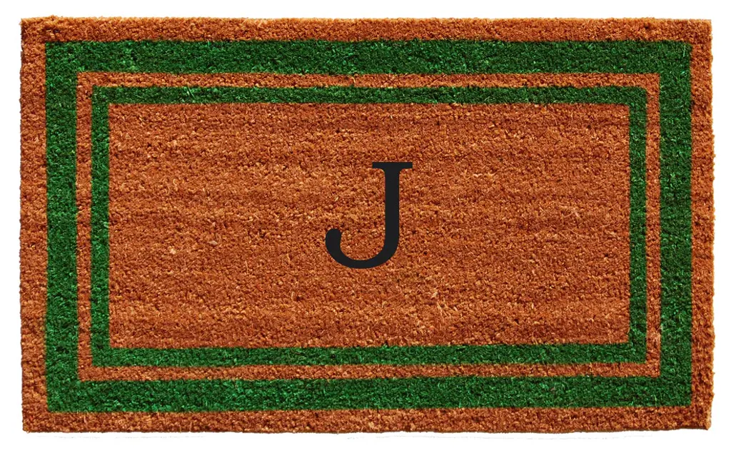Brighten your entry with this beautiful over-sized monogrammed doormat. Made of natural coir, a durable fiber that scrapes shoe bottoms clean, this doormat has a prominent double border that encases your initial and is vinyl backed to help prevent movement when walked on. Weather tolerant and colorfast, coir doormats absorb moisture, retain their shape and do not mat down regardless of the traffic. Vacuum, shake or lightly hose clean and allow to dry.