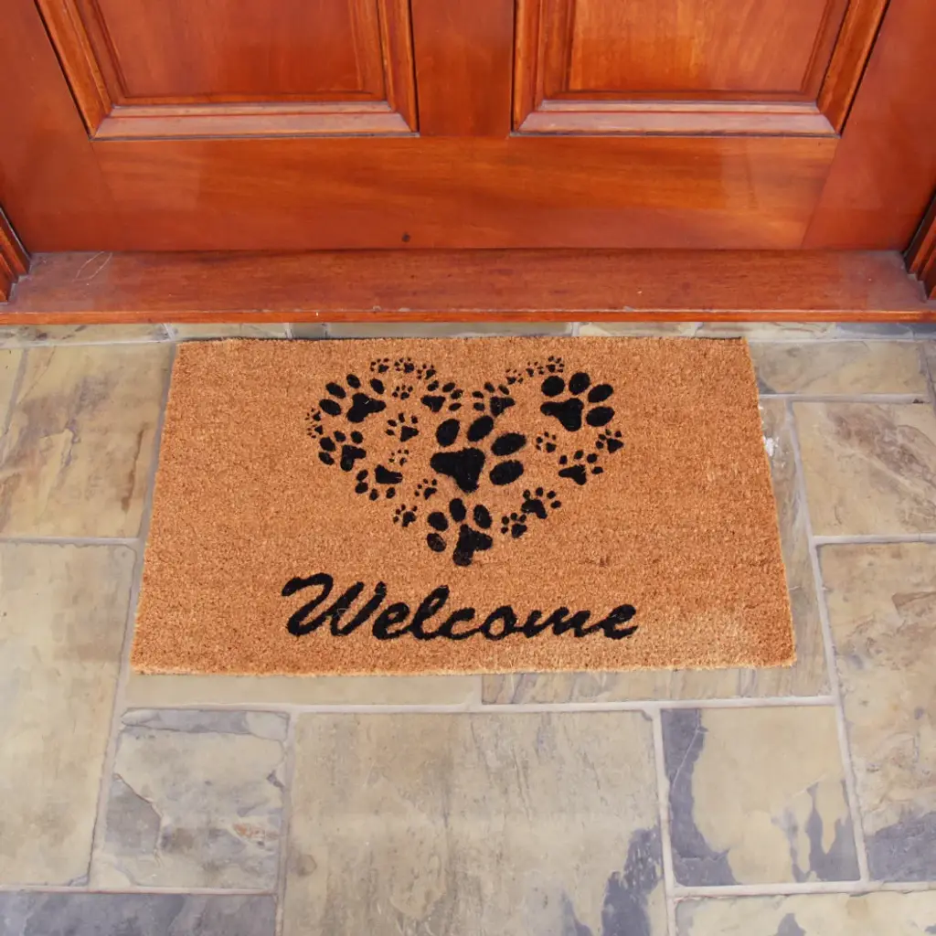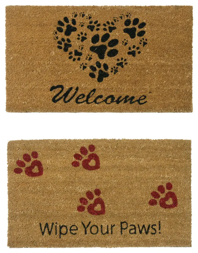 The Rubber-Cal Adorable "Doggie Door Mat" Kit is perfect for dog lovers, or pet lovers in general! These cute welcome mats are designed with adorable paw prints that are sure to catch the eye of any animal lover. Included in this endearing doggie door mat kit are two 18" x 30" residential door mats: the "Heart Shaped Paws Welcome Mat" and the "Wipe Your Paws! Doormat". The "Heart Shaped Paws" adorable doggie door mat features a unique heart-shaped paw that is created entirely of paws. This fun welcome mat will let everyone know that pets are welcome in your home! The "Wipe Your Paws!" doggie door mat features adorable red, heart-shaped paws that trail across the mat above the inscription "Wipe Your Paws!" that helps remind your two-legged and four-legged friends alike to wipe their feet and paws before entering! This doggie door mat kit is ideal for a pet owner, or an animal lover in general, to decorate their home in cute, animal friendly decor. It is no secret that humans and pets alike trail in dirt, debris, and moisture. Thankfully, these cute welcome mats are made of resilient coir fibers that are coarse and flexible enough to thoroughly remove dirt, debris, and moisture that are trapped in hard-to-reach areas of footwear. Coir fibers are also highly resistant to the damaging effects of environmental factors, such as UV rays, ozone, oxygen, and moisture, allowing these residential door mats to remain functional and decorative for years in the outdoors. Although, coir is able to absorb moisture, it will not retain any of the liquid absorbed which allows it to remain functional even in the face of excessive moisture. These all-weather dog welcome mats are also highly durable. Residential door mats are often subjected to foot traffic on a daily basis which increases chances of matting. Coir fibers will not become matted and will return to its original plush form, even when put under extreme weight for extended periods of time.