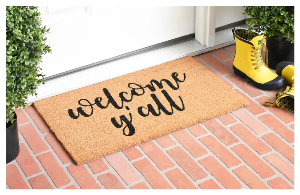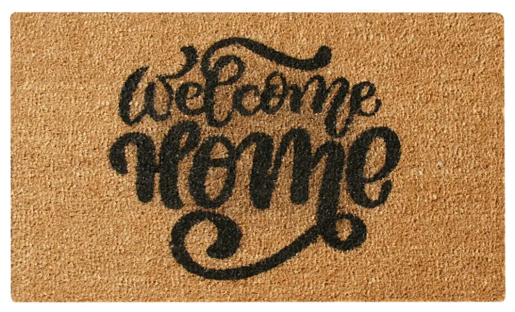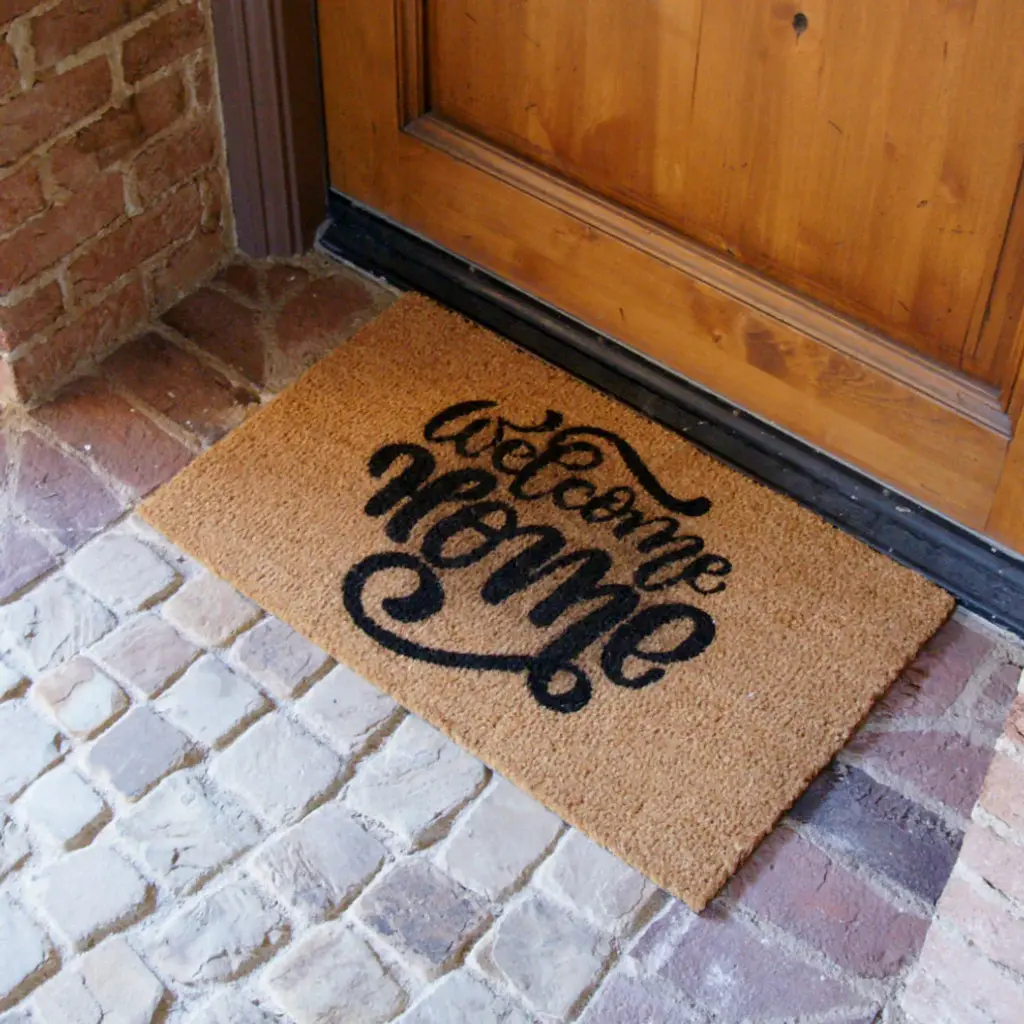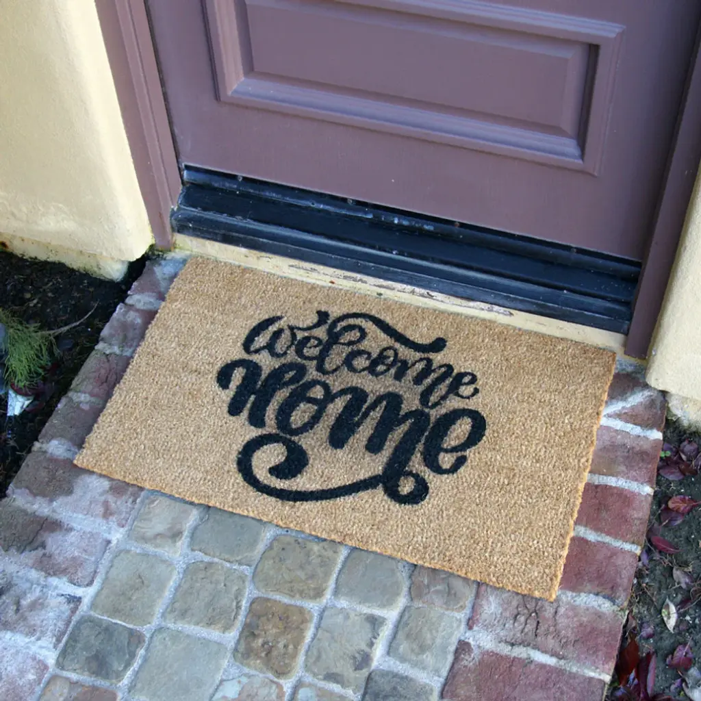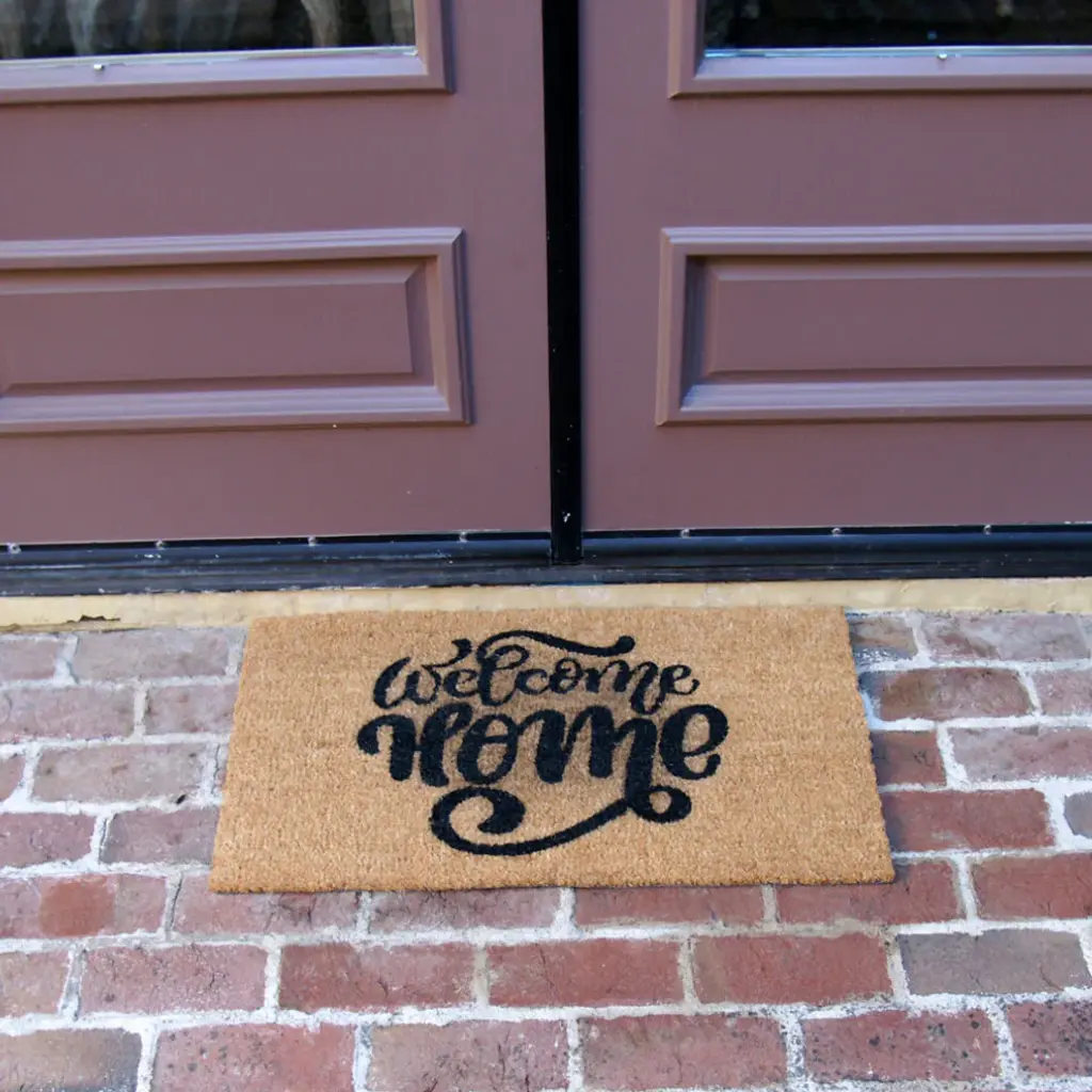 Rubber-Cal�s �Cute and Curvy� welcome home doormat is an excellent complement to any home entrance. This natural coir doormat features a natural-colored background with �welcome home� printed in a bold, yet curvy script. Like all of our welcome home doormats, this mat is decorated using a heavy-duty emulsion paint, similar to the kind used on the walls of buildings. This waterproof paint resists abrasions with ease, so your guests can wipe their feet on the coir doormat without worry. And since this welcome rug is made from coir fiber, you can count on it to show extreme durability and resilience. Coir is a naturally sourced material that comes from coconut shells, and as a result coco matting can handle intense physical conditions. From abrasions and moisture to ozone, UV rays, and extreme temperatures, there isn�t much this welcome home mat cannot handle. The material is also quick-dying and resists the development of mildew and mold, so you can feel good about leaving this home doormat on your patio all season long. In addition to durability and weather resistance, coir fiber is also perfect for a boot and shoe scraper. The short, rough bristles of the coco doomat can easily reach into shoe soles to pull out any dirt, debris, or excess moisture. This unwanted filth becomes trapped on the doormat, just below its surface, where they stay until the mat can be cleaned. And luckily, cleaning a coir fiber mat is incredibly easy. Simply the welcome coir mat outdoors and give it a good shake to remove dirt and debris. If any stubborn filth wants to stick around, a vacuum can be used to achieve an even deeper cleaning.
