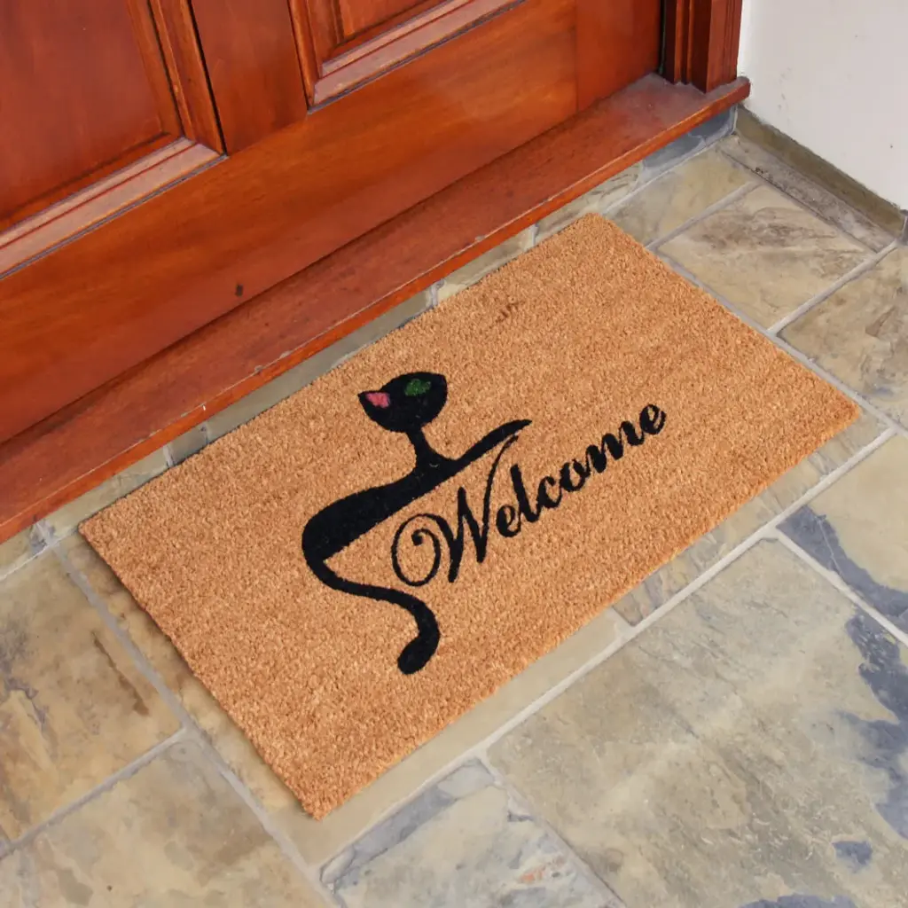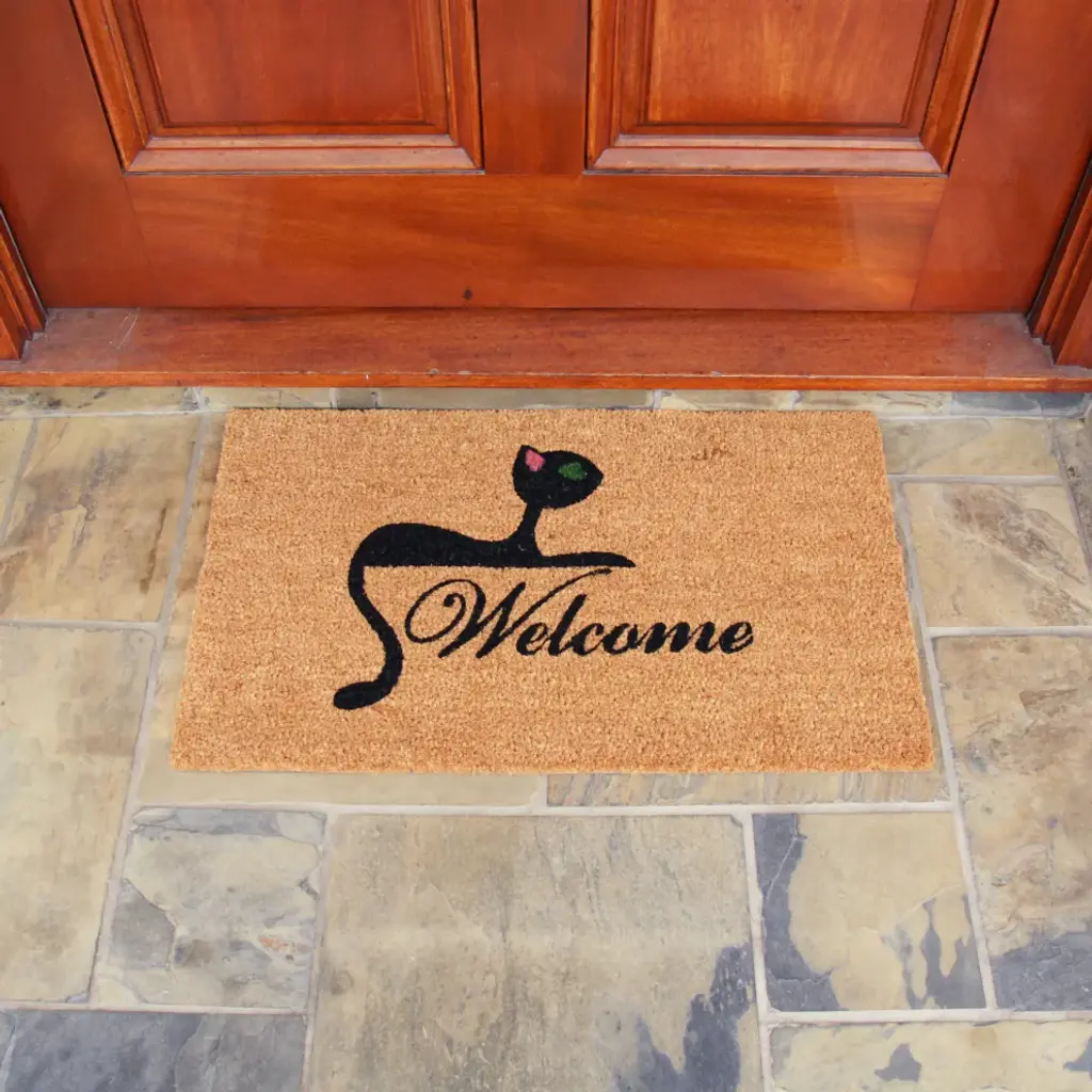 The Rubber-Cal Cute "Little Kitty-Cat" Doormat Kit is the perfect set of cute doormats for cat lovers anywhere. These cat door mats are 18" x 30" making them the perfect size for any standard sized doorway around your home, not just the front doorway. This little kitty-cat doormat kit includes the "Heart Shaped Paws" and the "Kitty Cat" cute doormats, both of which are painted with their own unique design. The unique heart made up of paw prints and the image of an elegant black cat with piercing green eyes are both great decoration ideas for cat lovers! The surfaces of the mats included in this little kitty-cat doormat kit are made up of natural coir fibers which work to prevent environmental damage as well as help promote a safe and clean interior floor. Coir is harvested from the husks of coconuts where their primary function is to protect the fruit inside from environmental harm. Due to these properties of natural coir, a coconut fiber doormat is able to resist degradation and aging brought on by harsh UV rays, ozone, oxygen, and moisture. These fibers are also rough and flexible, allowing them to efficiently squeeze into the hard-to-reach spaces of shoe soles allowing them to thoroughly clean shoes. Not only does dirt and debris create a messy and unattractive interior floor, but it also creates hazards that may lead to dangerous slip and fall accidents. Create a safe interior floor and add a touch of cat-friendly decor to any standard sized door around your home with Rubber-Cal''s Cute "Little Kitty-Cat" Doormat Kit!