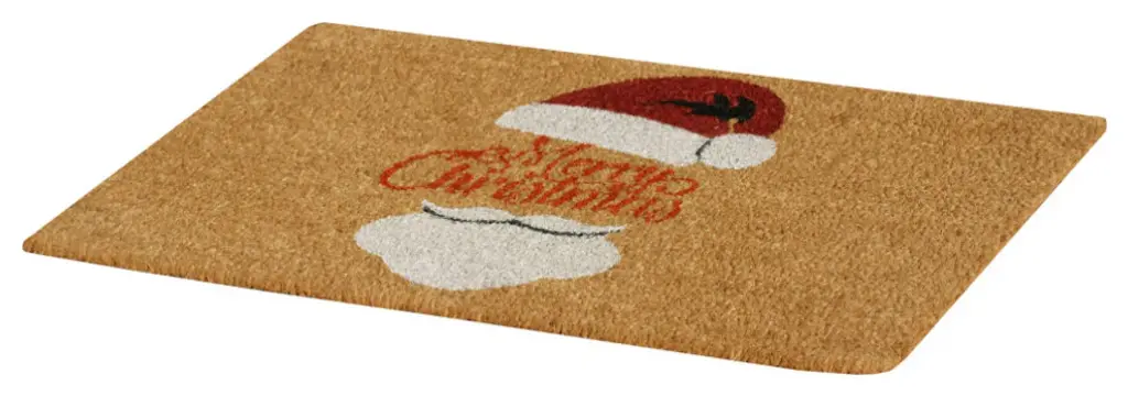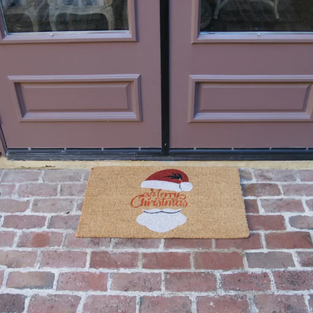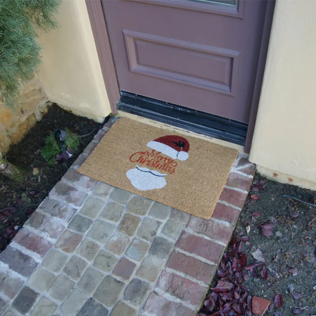 Rubber-Cal''s "Santa''s Favorite" Christmas doormat is a festive design to complement the holiday decorations of any home! Whether your home is abundant in Christmas decor or kept to a minimum, you can''t be fully prepared for the season without a fun and colorful holiday welcome mat! Santa''s Favorite is a sweet and simple coir mat design, depicting the iconic beard and hat belonging to good old St. Nick. Applied in long-lasting emulsion paint, the design reads "Merry Christmas" to spread holiday cheer to each of your visitors. The paint is waterproof to ensure it does not bleed, so you can leave this home welcome mat out on your porch without worry! The Christmas mat is also made from natural coir fiber to help it withstand harsh outdoor conditions. Coco matting is incredibly durable and resilient, with resistances to ozone, UV rays, extreme temperatures, and virtually any year-round weather conditions. The material is non-absorbent, fast-drying, and resists the development of mildew and mold, so you can feel good about leaving this Christmas welcome mat on your doorstep all season long. Coir bristles are also ideal for scraping dirt and debris from shoes. When someone wipes their feet on this coco doormat, the rigid bristles will reach into the grooves of their shoe soles to pull out mud and moisture, which are then trapped below the surface of the mat. The filth stays trapped on the holiday doormat until you are ready to clean it, preventing the dirt from being tracked indoors or onto another pair shoes. Our decorative Christmas doormats are also backed with a tough layer of PVC, which contains the moisture that is wiped from shoes and prevents it from spilling out onto the porch. The durable backing also enhances traction beneath the outdoor doormat to prevent any unwanted slipping that may occur when someone wipes their feet.