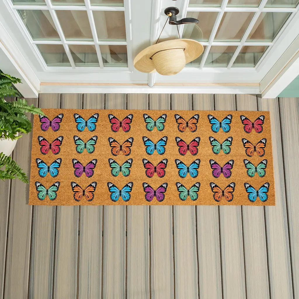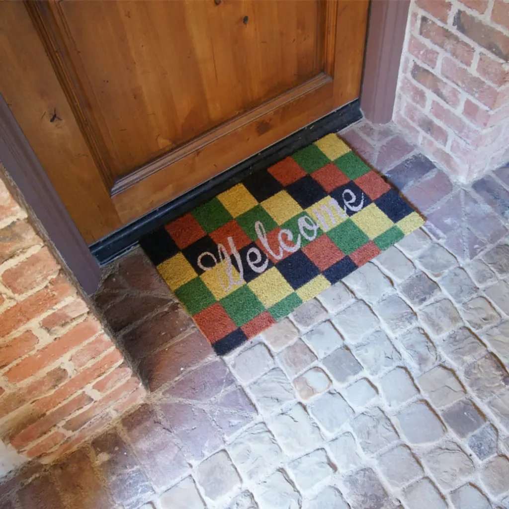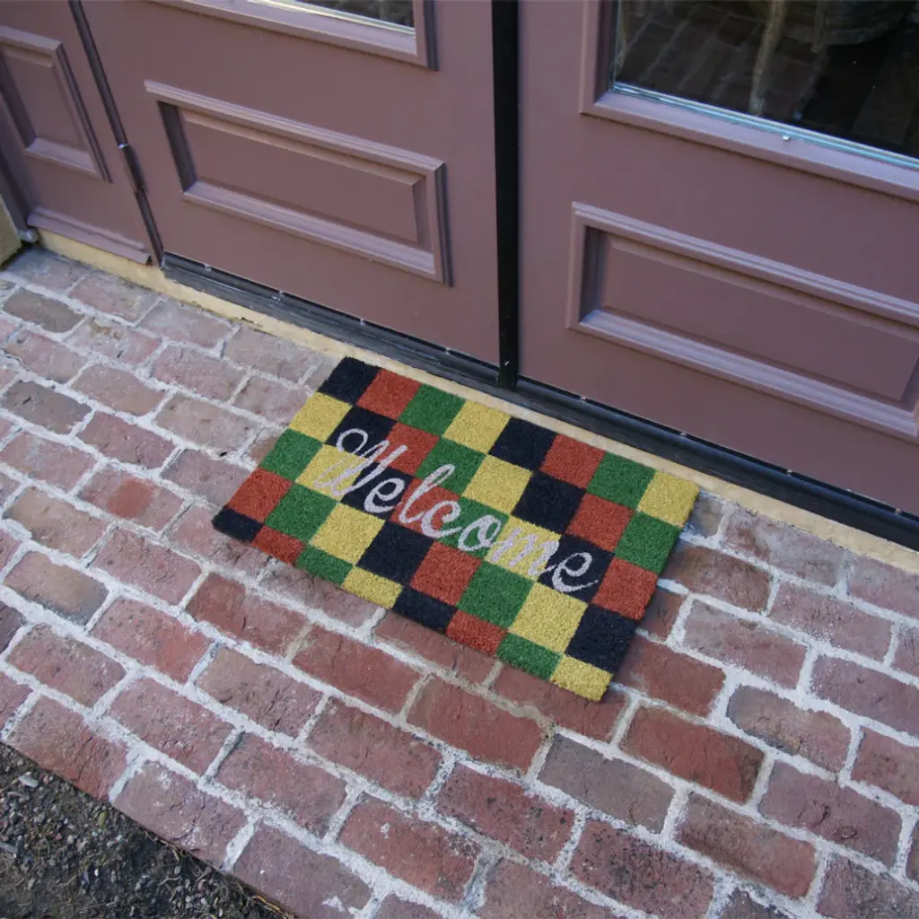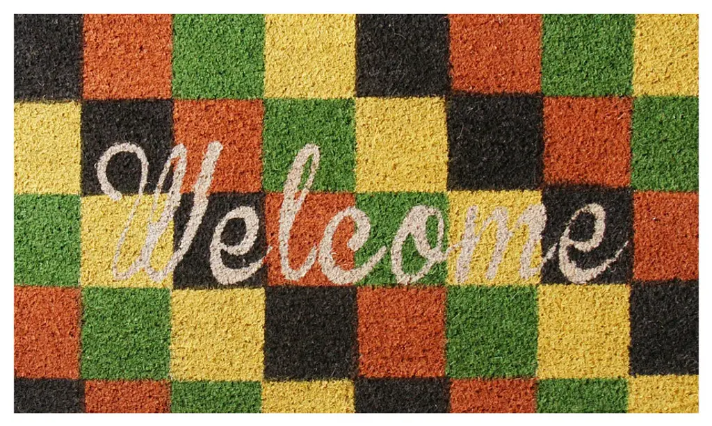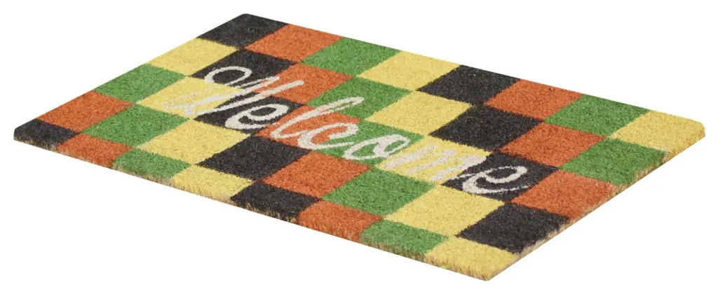 Rubber-Cal�s �Colors of Autumn� is a colorful fall welcome mat with a checkerboard design. This seasonal doormat evokes feelings of autumn with its rich, warm colors, and it is sure to complement your home�s holiday d�cor. Like all of our stylish doormats, �The Colors of Autumn� is decorated using a heavy-duty emulsion paint to ensure a long-lasting design. This high-quality paint is resistant to moisture and abrasions, so it will not bleed, fade, or be rubbed off when someone wipes their feet on the mat. The coir welcome mat is also extremely durable in itself. Made from natural coir fiber and backed with PVC, this fall doormat offers excellent shoe-scraping capabilities and year-round weather resistance. Coir is a natural material derived from coconut shells, and as a result coir fiber doormats are as durable and resilient as their source. Coco doormats easily withstand abrasions, moisture, ozone, UV rays, and extreme temperatures both hot and cold. The material dries quickly and cannot develop mildew or mold, so you can feel good about leaving this autumn doormat on your porch all season long. When your guests wipe their feet on this natural doormat, the rough coir bristles will remove any dirt and debris from the soles of their shoes. Unwanted filth gets trapped on the coir entrance mat, just below its surface, and stays there until the mat is cleaned. This prevents the dirt from being tracked onto another pair of shoes�or worse�into your clean home. When your outside doormat starts to look dingy, it is incredibly easy to clean. Simply take the mat outdoors and give it a vigorous shake, or use a vacuum to achieve an even deeper cleaning. Whether your home is abundant in autumnal decoration or instead kept to a minimum, this colorful doormat is sure to complement your home and charm your guests each time that they visit.