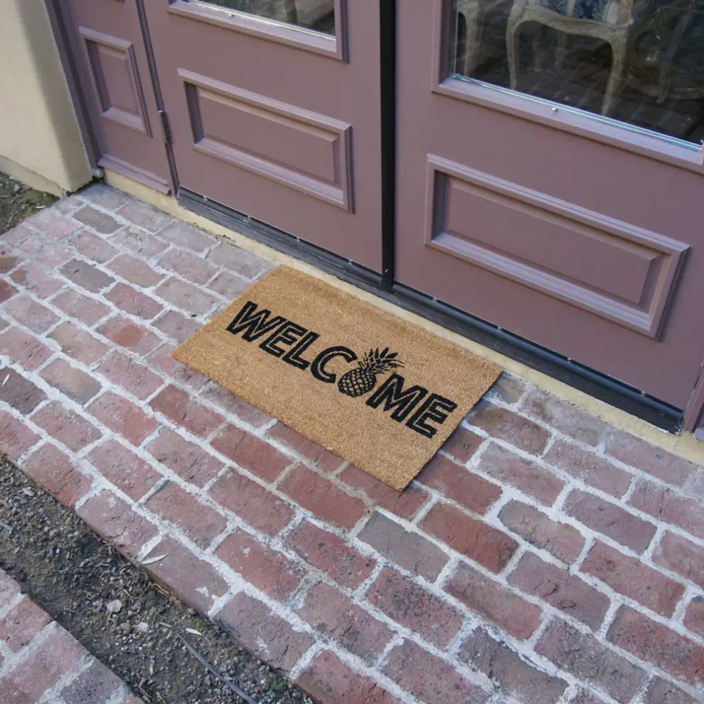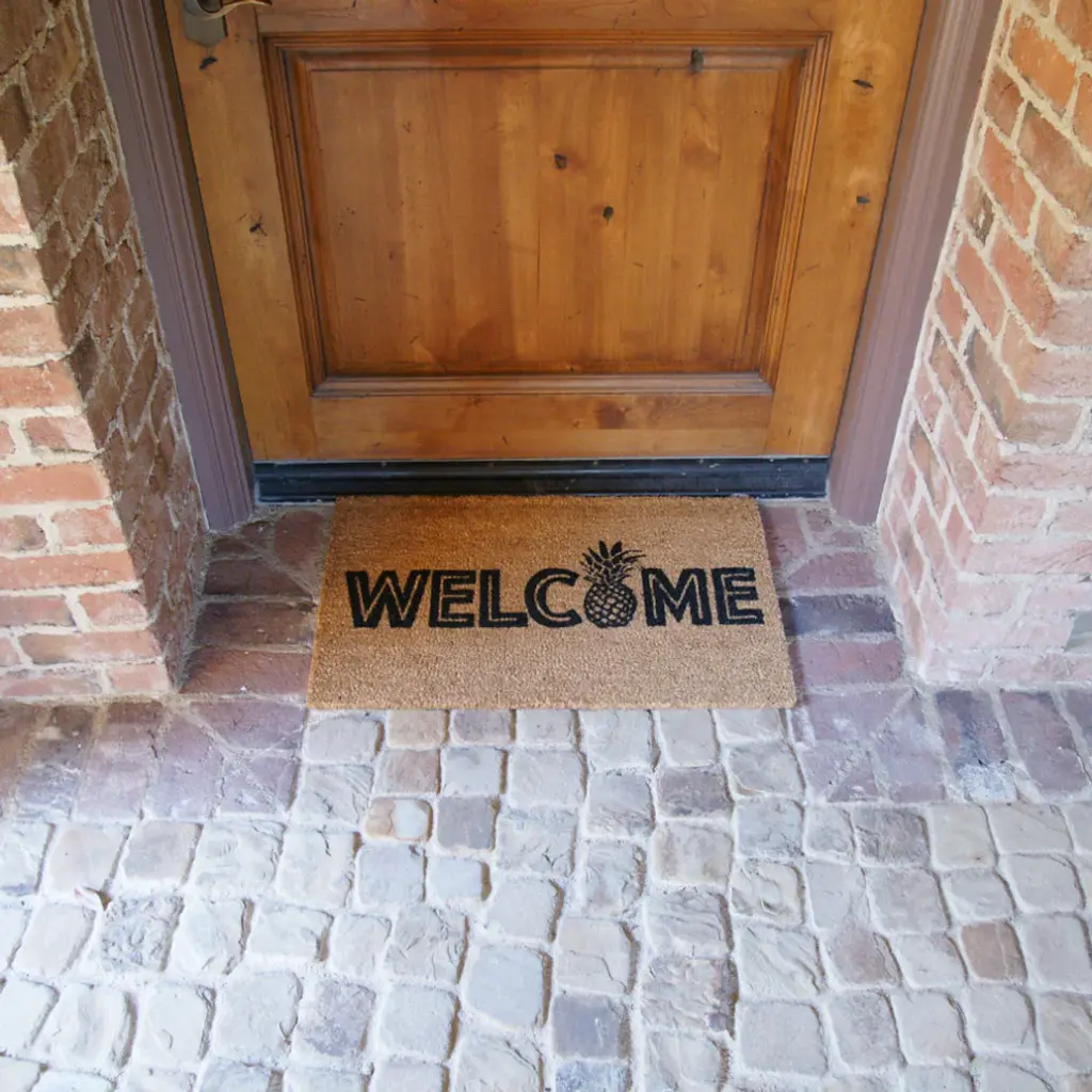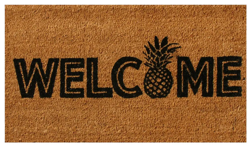 Rubber-Cal�s �Welcome to the Luau� is a high-quality front doormat that gives your home entrance a touch of island flair. This residential doormat features a naturally-colored base with a bold message of �welcome� that looks fit for a party on a tropical island! Complete with a pineapple in place of the letter �O,� this playful natural coir doormat is sure to complement the aesthetic of any island-loving home. And there is no need to worry about the design bleeding, fading, or wearing away from repeated use. Like all of our stylish welcome mats, this pineapple doormat is decorated using a heavy-duty, waterproof emulsion paint to ensure a long-lasting design. This home welcome mat is also made from natural coir fiber and backed with PVC to offer competitive levels of durability and outdoor resistance. Because coir matting comes from coconut shells, you can expect it to endure moisture, ozone, UV, and extreme temperatures all with ease. The material dries quickly and cannot develop of mildew and mold, so this pineapple outdoor doormat can be left on the porch for long periods of time with little or no maintenance. Coir is also what makes this welcome coir doormat an excellent boot and shoe scraper, as the rigid bristles can easily pull mud and moisture from the soles of shoes. When someone wipes their feet on this pineapple mat, dirt, debris, and any other unwanted filth becomes trapped within the surface of the mat. The coir fiber mat keeps the filth trapped to prevent it from being tracked onto another pair of shoes or�worse�into the house. Instead it stays trapped on the coco mat until you are ready to clean it, and cleaning is simple! When your pineapple front door mat starts to look dingy, just take it outdoors and give it a good shake to remove dirt and debris. If any stubborn dirt tries to stick around, you can achieve a deeper cleaning with a vacuum.