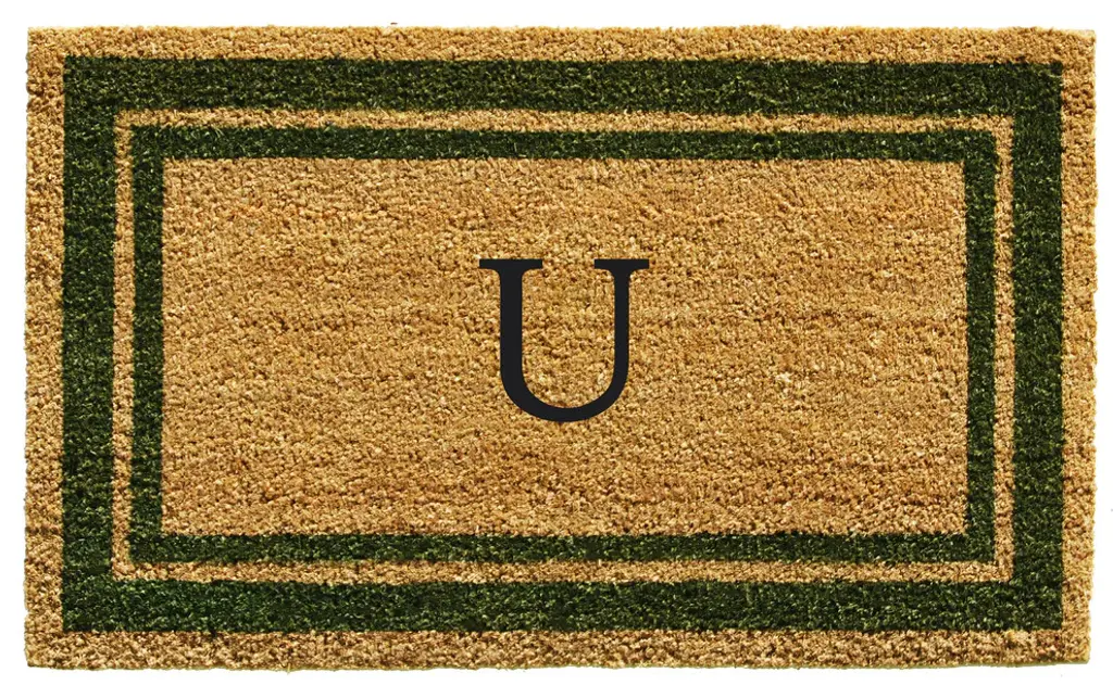 Brighten your home entry with this beautiful monogrammed doormat. Made of natural coir, a durable fiber that scrapes shoe bottoms clean, this doormat has a prominent double border that encases your initial and is vinyl backed to help prevent movement when walked on. Weather tolerant and colorfast, coir doormats absorb moisture, retain their shape and do not mat down regardless of the traffic. Vacuum, shake or lightly hose clean and allow to dry.