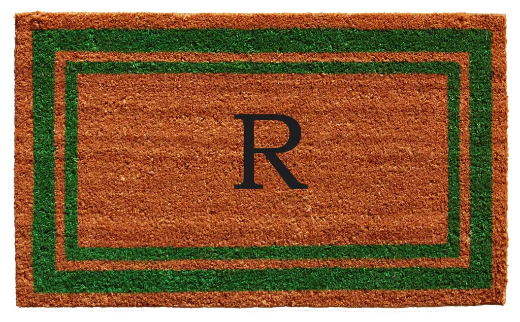 Brighten your entry with this beautiful over-sized monogrammed doormat. Made of natural coir, a durable fiber that scrapes shoe bottoms clean, this doormat has a prominent double border that encases your initial and is vinyl backed to help prevent movement when walked on. Weather tolerant and colorfast, coir doormats absorb moisture, retain their shape and do not mat down regardless of the traffic. Vacuum, shake or lightly hose clean and allow to dry.