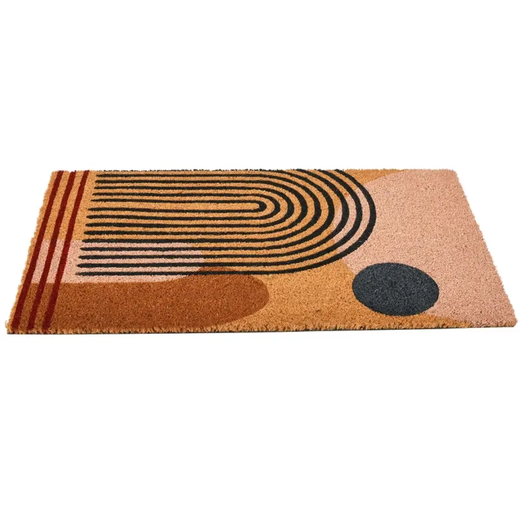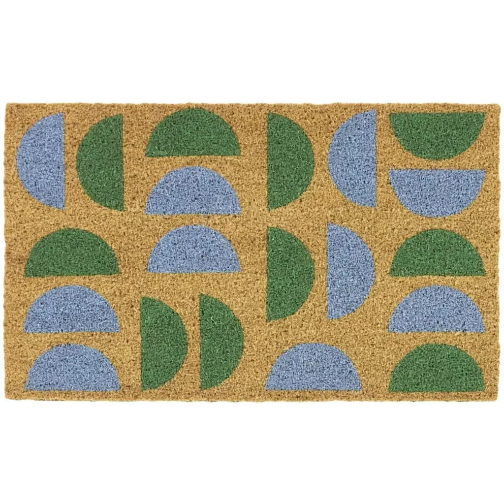 Modern Boho Natural Coir Indoor/Outdoor Doormat or Entryway Mat with Non-Slip PVC Backing featuring a Unique Curved Geometric Design; Multi-color on Natural Coir; Add layers of pattern and color to your doorstep with a boho-inspired geometric doormat