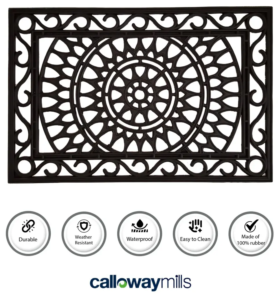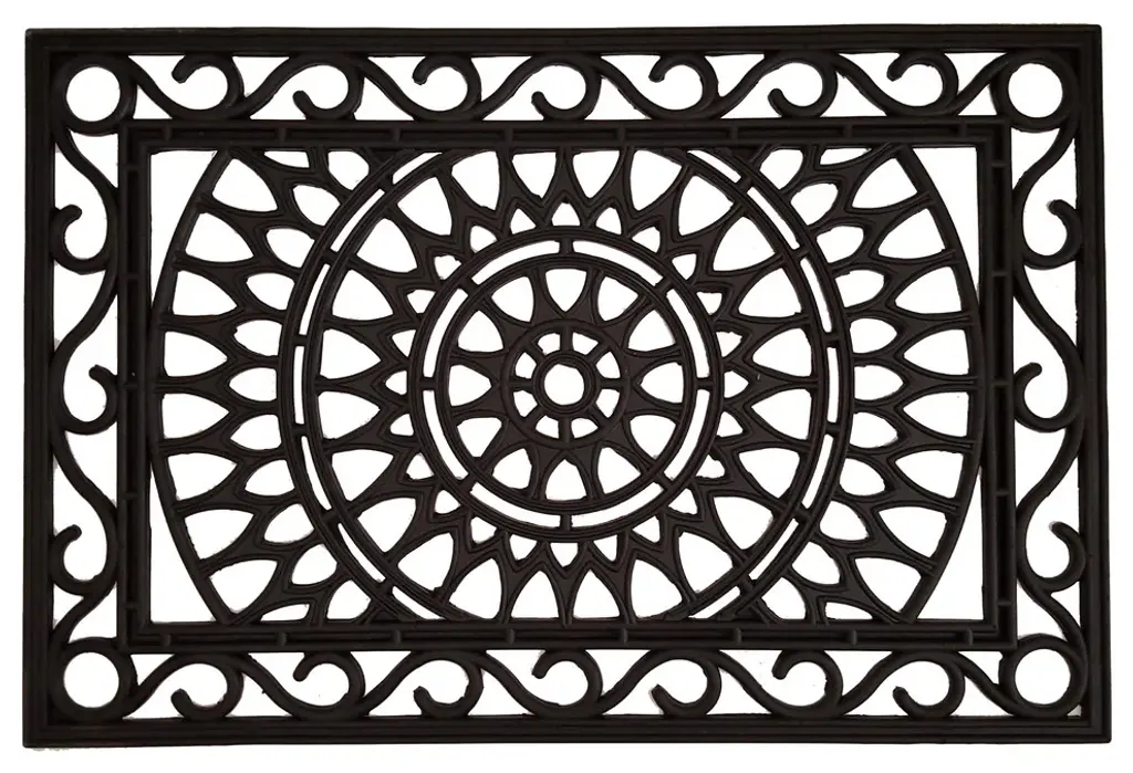 Over-sized to provide more coverage, this beautiful doormat is made of 100% rubber and is impervious to the elements of weather. Detailed scroll that emulates wrought iron, this heavy-duty mat makes a gorgeous addition to any porch or patio area. Hose clean.