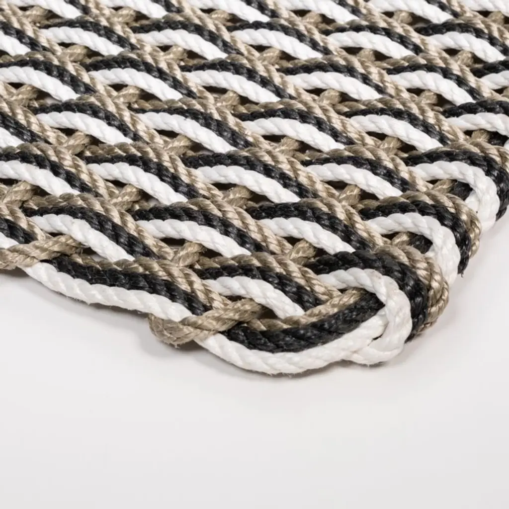 Handwoven out of handmade rope in Maine, this striped doormat weathers all seasons and conditions. The mat brings home the durability of rugged, fishing-grade nautical rope to your front door. Crafted with a chunky basketweave of pearly white, beige and dark grey ropes, the doormat looks classic and sophisticated yet offers exceptional performance by effectively removing dirt from muddy shoes, repelling water and resisting mold and mildew.The Rope Co. of Maine quality doormats and baskets that add lasting function and style to your home. Made with heritage and heart, the products are inspired by the region's local stories and natural landscapes.