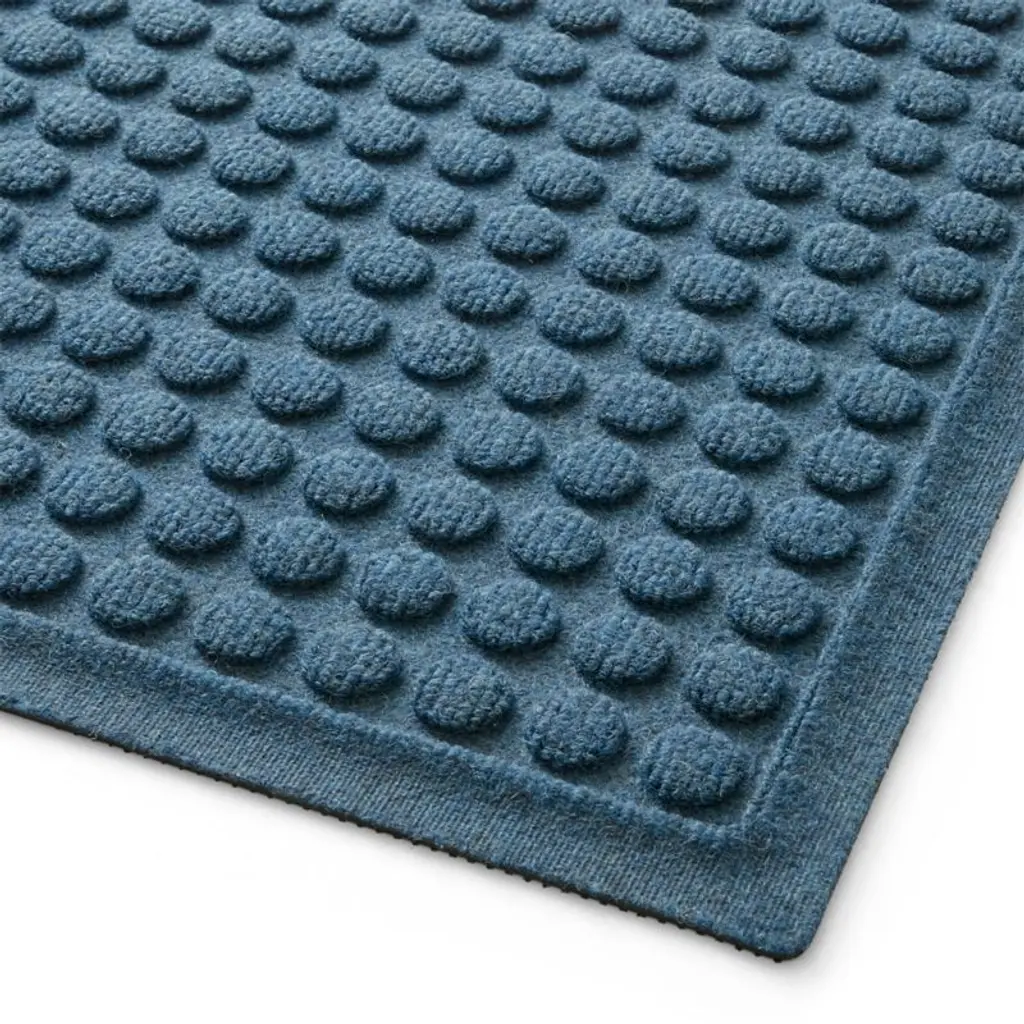 This absorbent "thirsty" mat in a great shade of blue lives up to its name, indoors or out. Unique construction wicks away moisture, trapping it in the pile for quick evaporation before floors, doorways or mudrooms get slick and dirty. Featuring a fun carved dot design, this long-lasting mat is finished with secure, non-skid rubber backing, keeps a low profile under opening and closing doors, and won't fade, crack, mold or mildew.