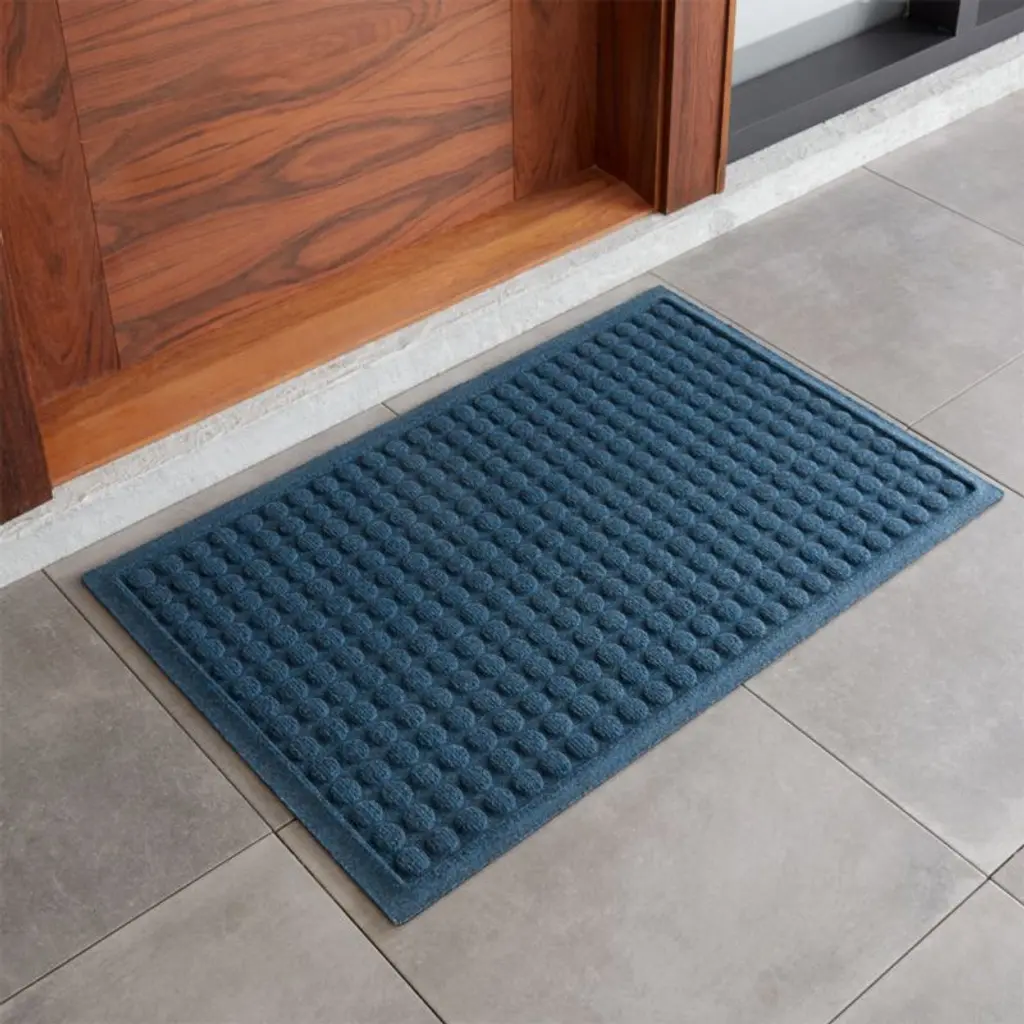 This absorbent "thirsty" mat in a great shade of blue lives up to its name, indoors or out. Unique construction wicks away moisture, trapping it in the pile for quick evaporation before floors, doorways or mudrooms get slick and dirty. Featuring a fun carved dot design, this long-lasting mat is finished with secure, non-skid rubber backing, keeps a low profile under opening and closing doors, and won't fade, crack, mold or mildew.