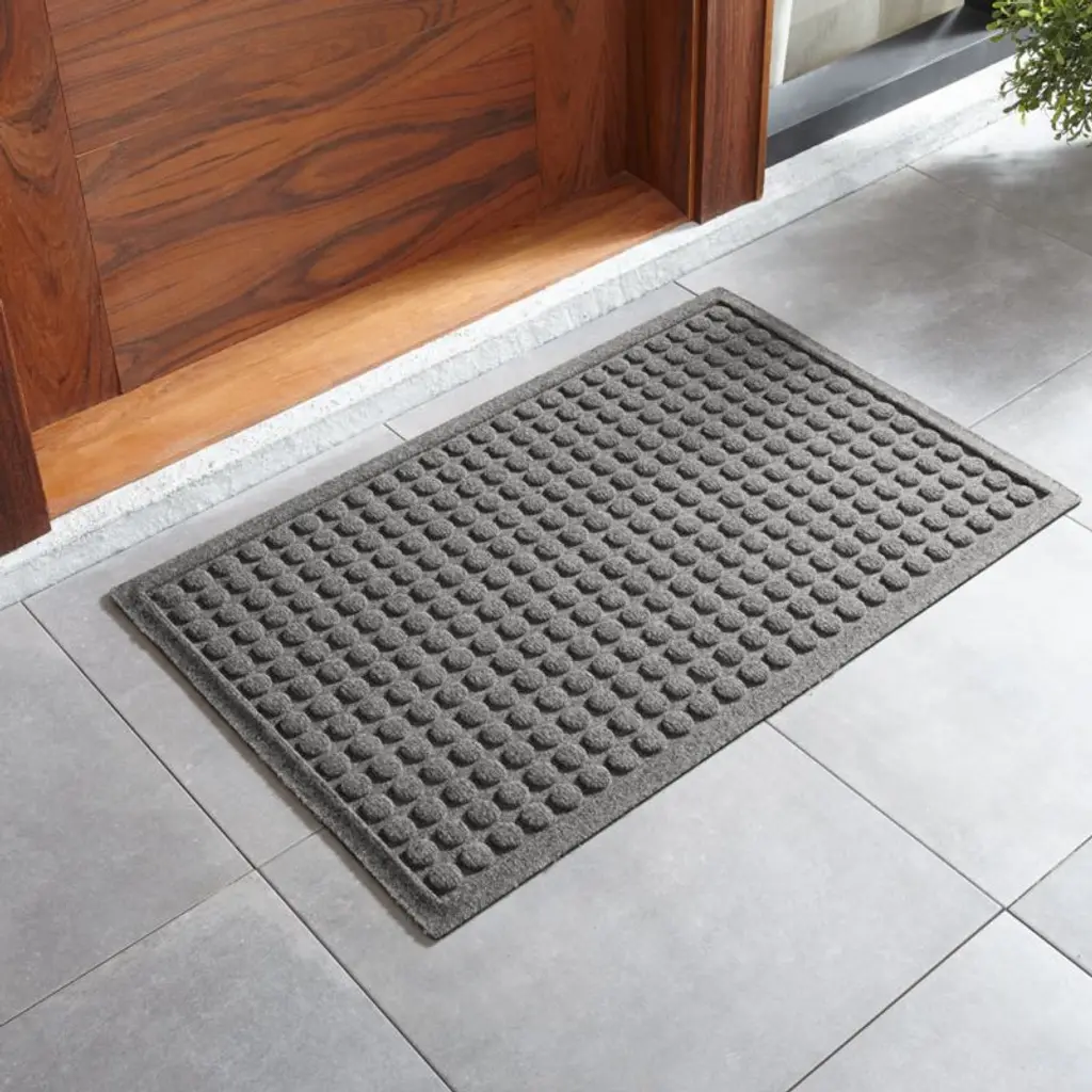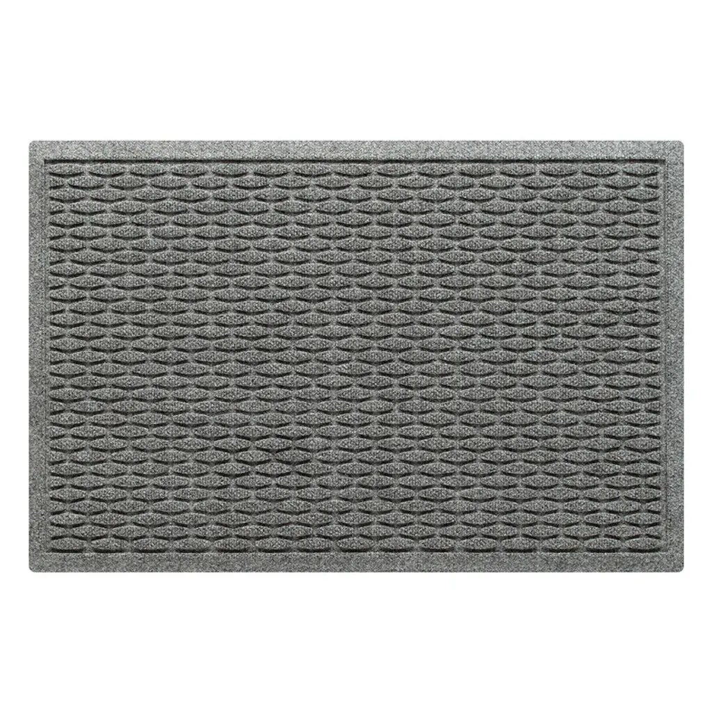 This absorbent "thirsty" mat in a great shade of light grey lives up to its name, indoors or out. Unique construction wicks away moisture, trapping it in the pile for quick evaporation before floors, doorways or mudrooms get slick and dirty. Featuring a fun carved dot design, this long-lasting mat is finished with secure, non-skid rubber backing, keeps a low profile under opening and closing doors, and won't fade, crack, mold or mildew.