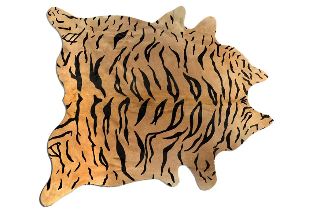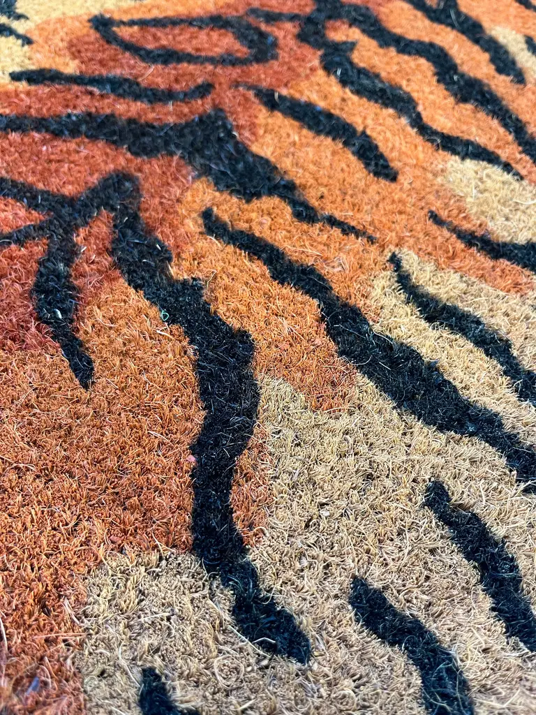 A fun organic animal shaped natural coir fiber doormat with colored tiger style design.