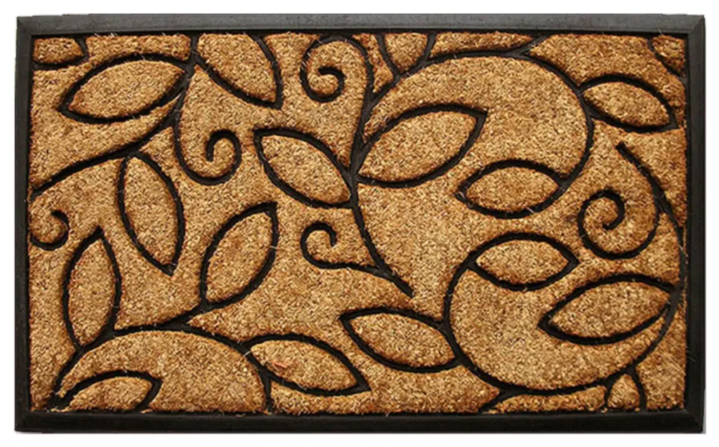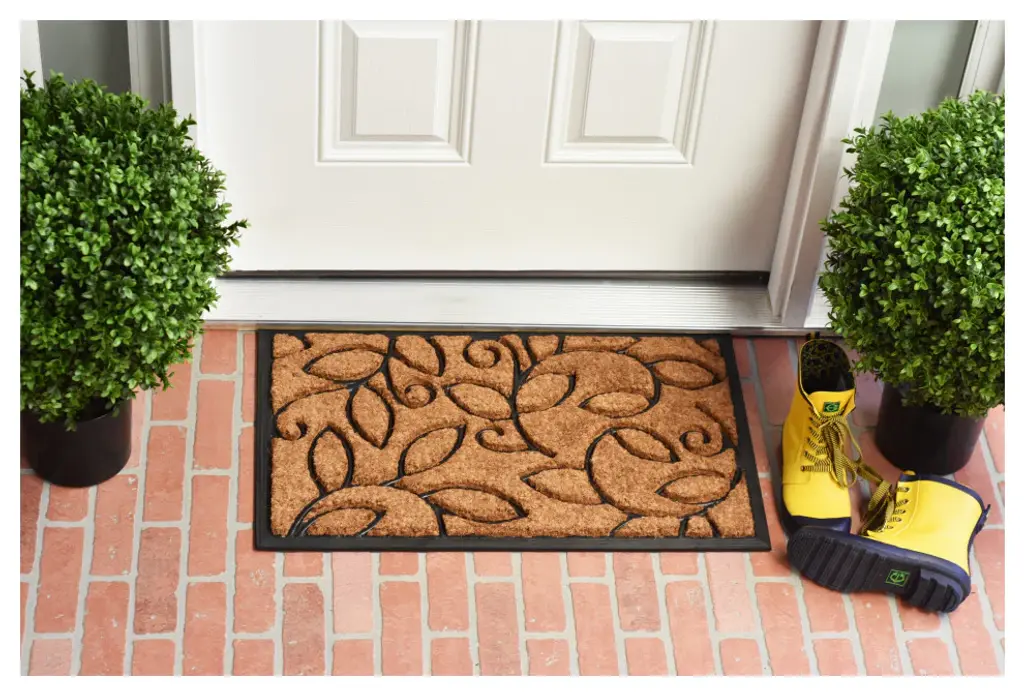 The beautiful combination of coir and rubber in this doormat make a stylish reception for your guests. While the heavy-duty rubber adds weight and elegance, the coir acts as a natural scraper on shoes to keep debris from entering your home. Sweep or hose clean.