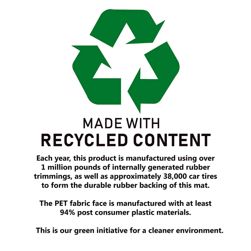 Our dependable, reliable Waterhog Doormats are better than ever! These commercial-grade Cable Weave Waterhogs offer the same high-level of performance, durability and effectiveness you've come to depend on with a more eco-friendly construction. Waterhog Mats now feature a super-durable, PET fabric face made from 100% recycled post-consumer plastic bottles. Depending upon the size, each Waterhog can contain 10-30 recycled bottles that otherwise may have been destined for a landfill. The bi-level surface grabs onto and soaks up moisture, dirt, leaves and more to keep floors clean and dry. Plus, the unique water dam design holds up to 1½ gallons of water per square yard. Super-durable Waterhog Mats are anti-static, quick-drying and they won't fade or rot. Just vacuum or hose down to clean - easy! The hefty rubber backing has 20% recycled content and stays in place. Certified Slip-Resistant by the NFSI (National Floor Safety Institute). Exceeds requirements for FF2-70-Standard for surface flammability of small carpets. Sizes are approximate. Made in USA.