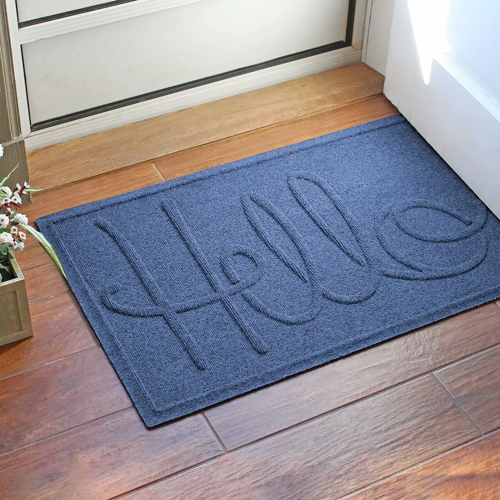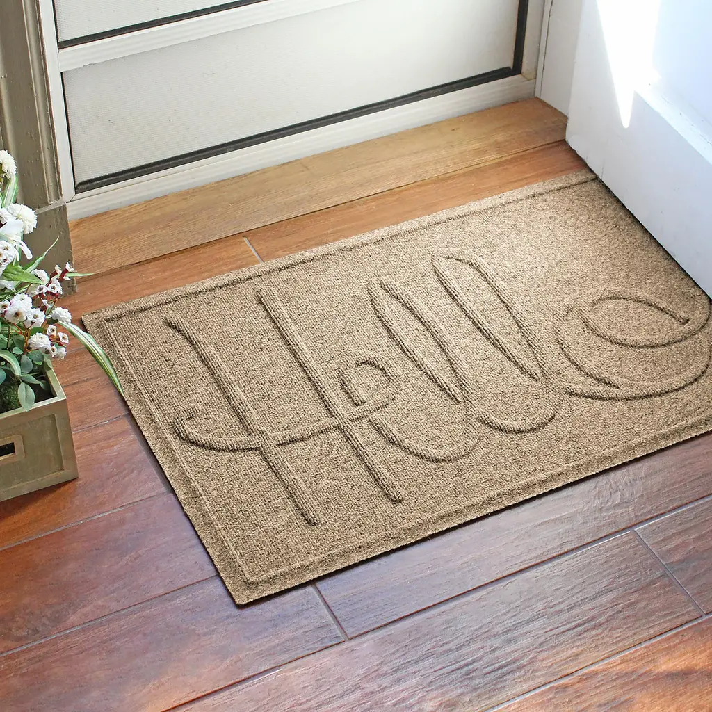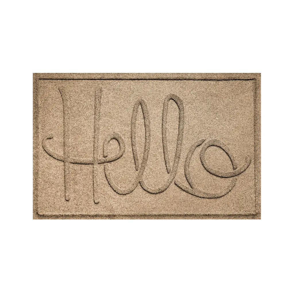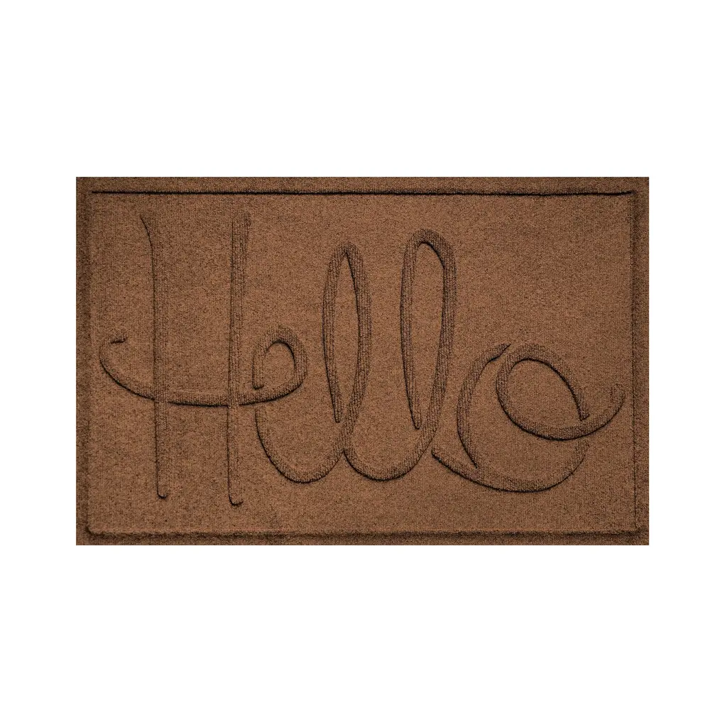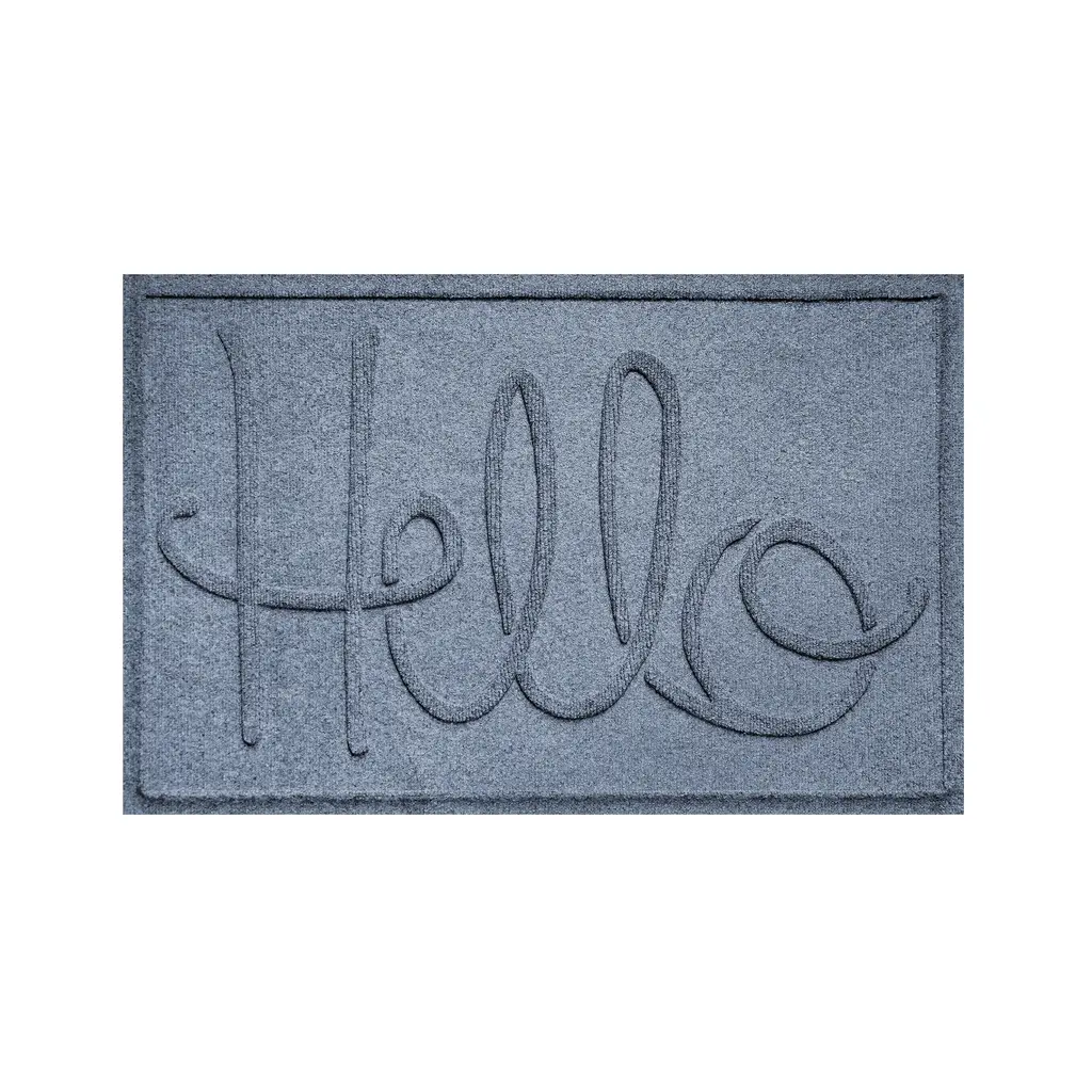 Our dependable, reliable Hello Doormat combines practical use with great design. Commercial-grade Waterhog rugs offer high-level of performance, durability and effectiveness along with eco-friendly construction. The numerous color options and the welcoming script message of greeting ensure that this mat will blend with just about any decorative style. Waterhog Mats feature a super-durable, PET fabric face made from 100% recycled post-consumer plastic bottles. Each Waterhog door mat can contain 10 or more recycled bottles that otherwise may have been destined for a landfill. The bi-level surface grabs onto and soaks up moisture, dirt, leaves and more to keep floors clean and dry. Plus, the unique water dam design holds up to 1½ gallons of water per square yard. Super-durable Waterhogs are anti-static, quick-drying and they won't fade or rot. Just vacuum or hose down to clean - easy! The hefty rubber backing has 20% recycled content and stays in place. Certified Slip-Resistant by the NFSI (National Floor Safety Institute). Exceeds requirements for FF2-70-Standard for surface flammability of small carpets. Sizes are approximate. Made in USA.