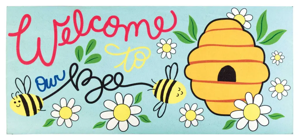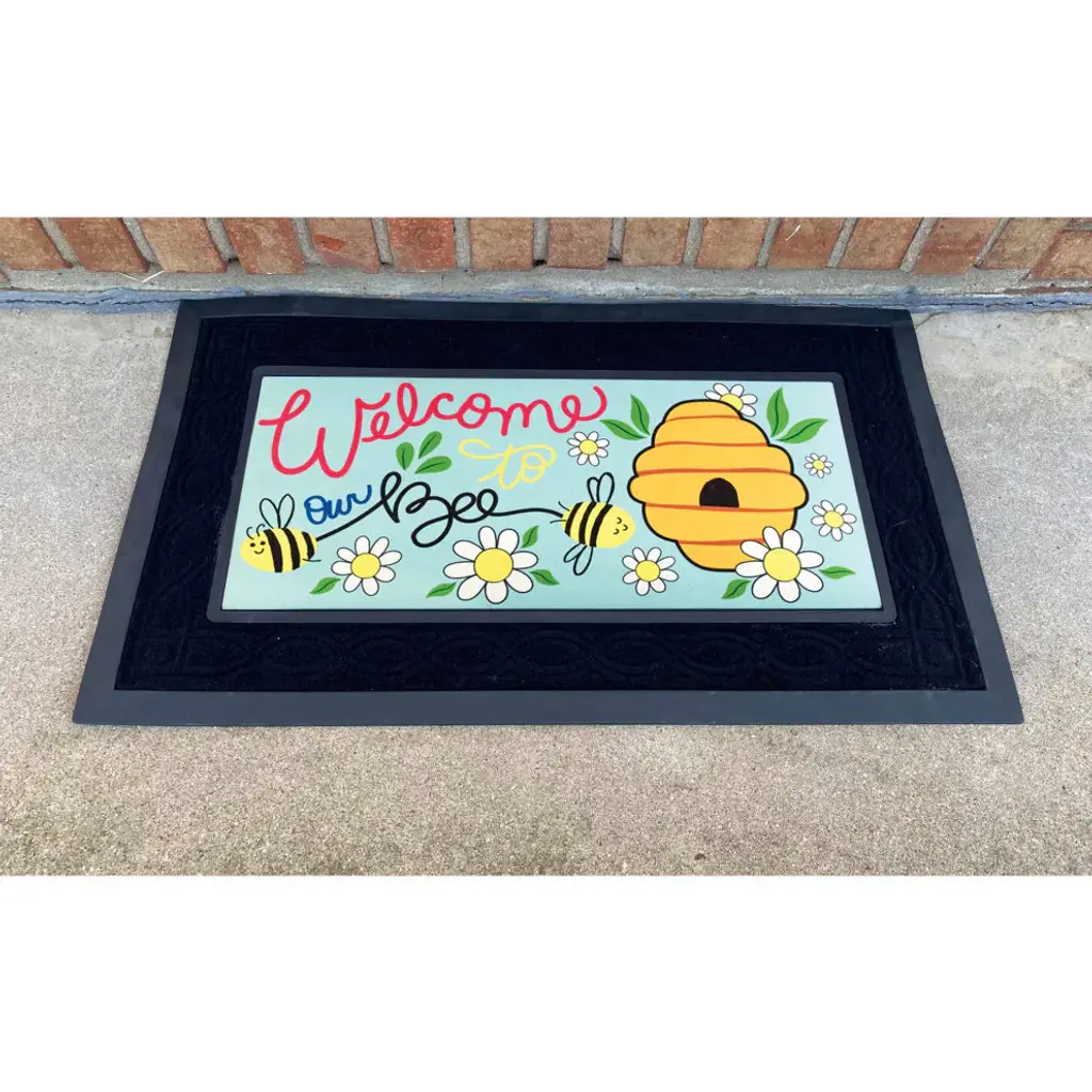 Welcome To Our Bee Hive. Attractive and inspiring, this doormat insert fits perfectly into our doormat base to create a look you will love. Made with mildew-resistant polyethylene terephthalate fibers, it helps to quickly clean and dry shoes. Rubber backing holds insert firmly in the base. Size of insert is approximately 22x10. Insert only - doormat base tray sold separately, SKU# 20018.