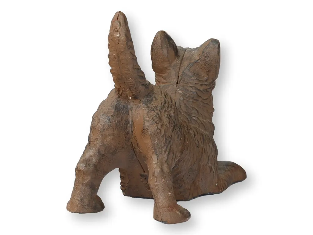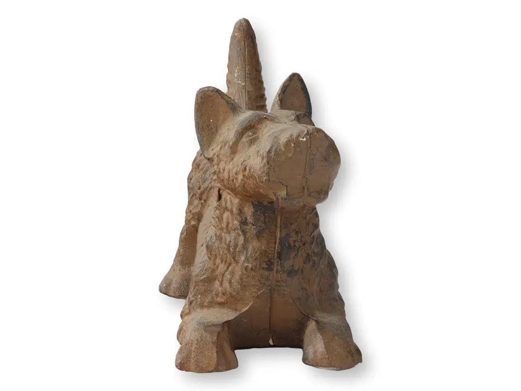 A charming midcentury cast iron doorstop in the shape of a Scottish Terrier, featuring a detailed fur texture and unusual playful stance. Sturdy and functional, this piece has no maker�������s marks but showcases quality craftsmanship. Perfect for cottage, farmhouse, or vintage-inspired décor.