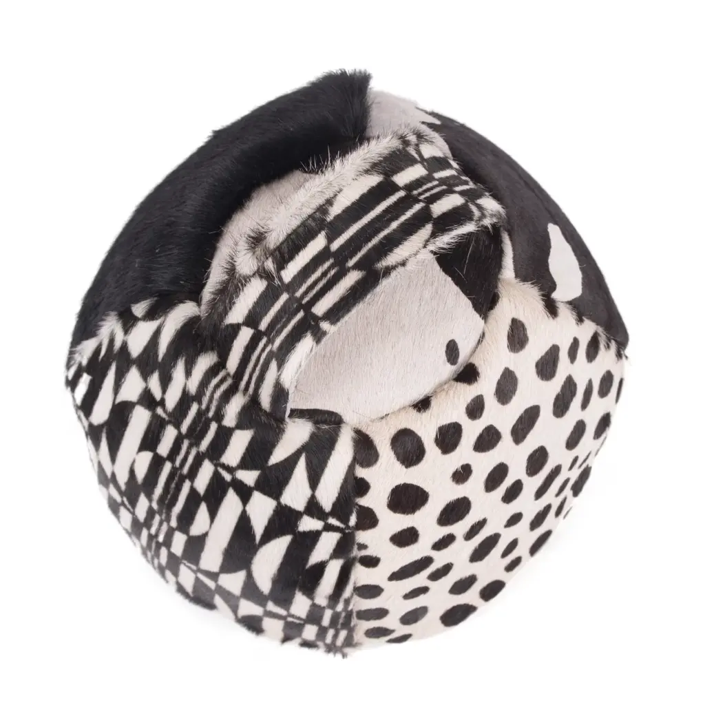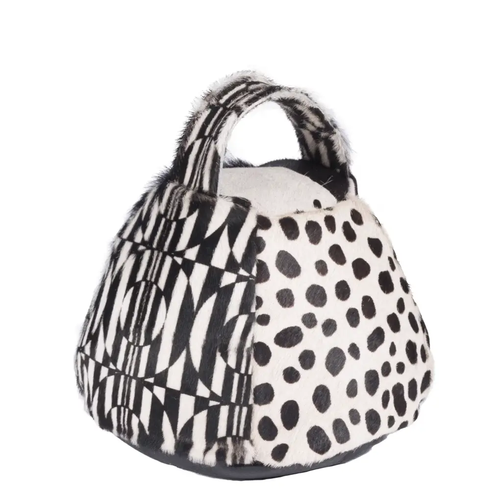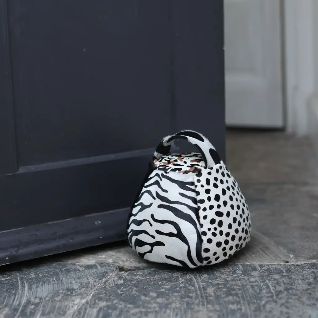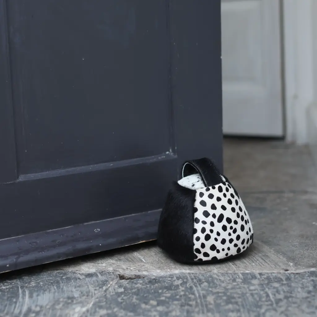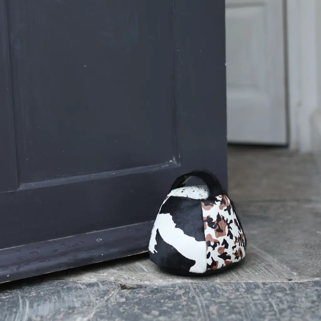 Crafted with meticulous attention to detail by our skilled team from a huge variety of the cowhides we stock, the combinations are glorious, we tastefully select the myriad colours within a palette, so you can be sure there are no two cowhide doorstops alike. These cowhide doorstops undergo a careful process. First, they are filled with our sheepskin waste for padding, ensuring sustainable use of resources. To provide the weight, a combination of sand and gravel is added, bagged and securely enclosed with a strong Velcro closure.The leather bases feature upholstery-grade robust leather, guaranteeing durability and allowing these doorstops to be conveniently moved around any surface without concern for damage.