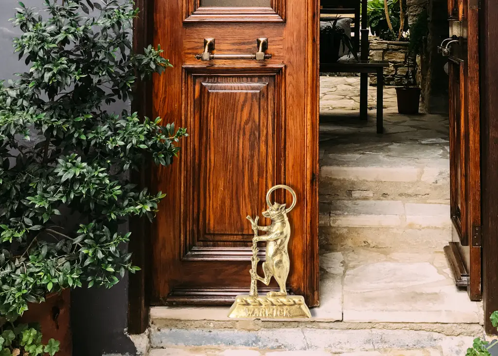 English Brass Warwick Bear Doorstop. This weighty piece is inspired by Warwickshire's ancient emblem—the bear and ragged staff, symbols of the Earls of Warwick. Meticulously crafted in brass, it's not just functional but a nod to England's rich history, particularly the Beauchamp family's legacy. A blend of utility and timeless heritage, it's destined to be both a conversation starter and a guardian of your doors. It has been polished to a high luster, maintain with mild brass polish.
