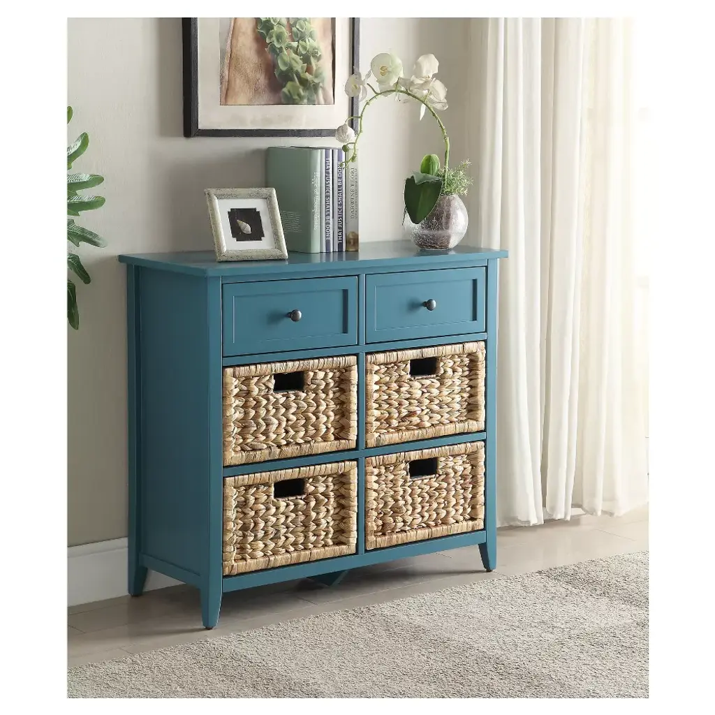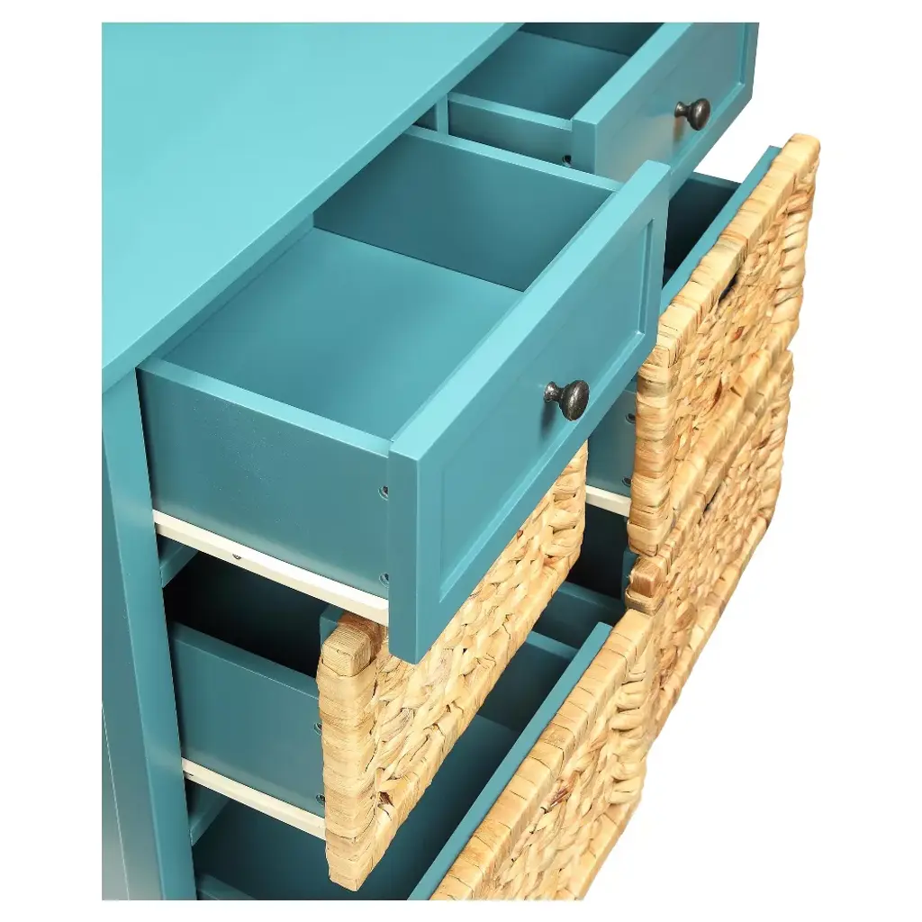 If you’re running short on storage space, keep your items organized and accessible with this stylish Teal Chest from Acme Furniture. This six-drawer chest features two traditional drawers and four woven straw drawers with cutout handles. Use the traditional drawers for papers, office supplies or odds and ends, and the basket drawers for linens, clothing and lightweight items.