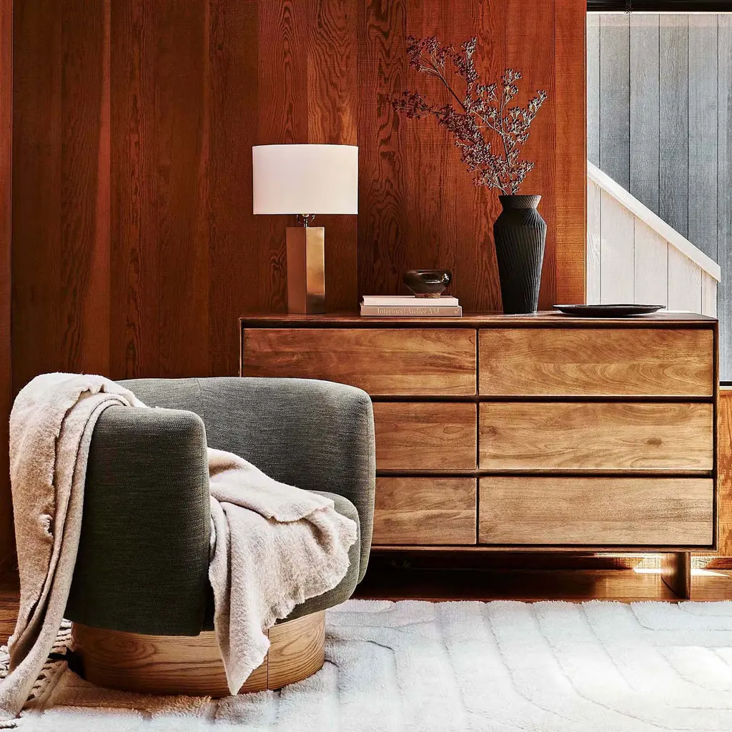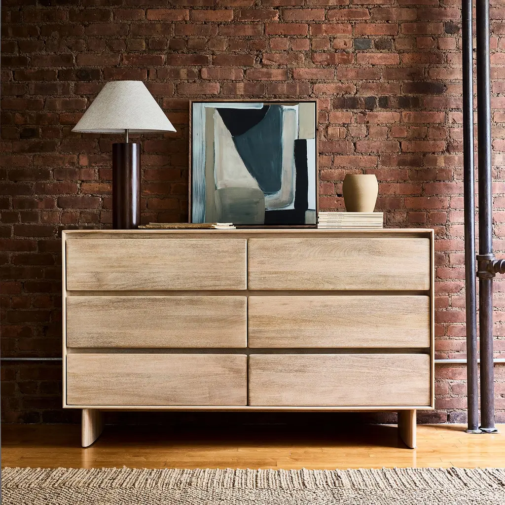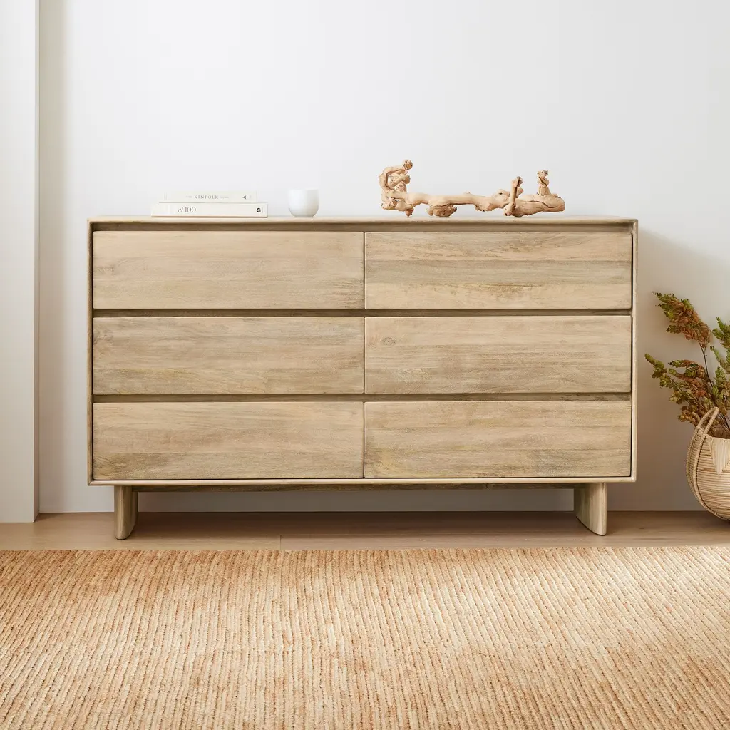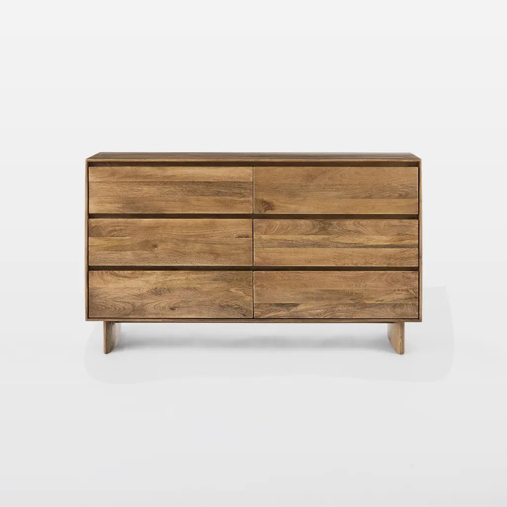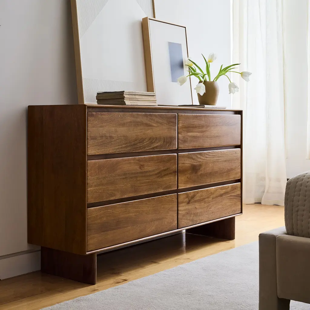 It adds rustic warmth to your bedroom setup. Crafted from solid, sustainably sourced wood. Six spacious drawers help you keep organized. Contract Grade, so you know it's built to last.
