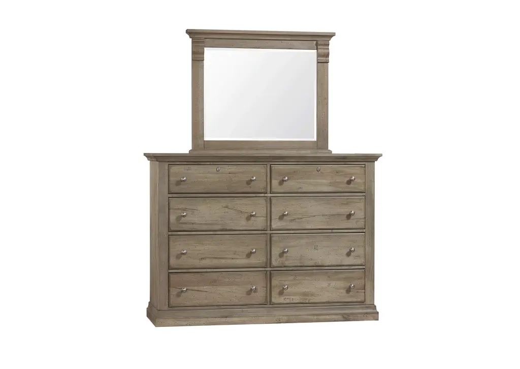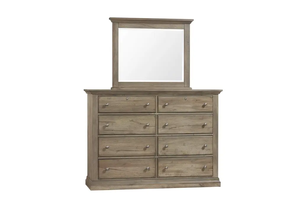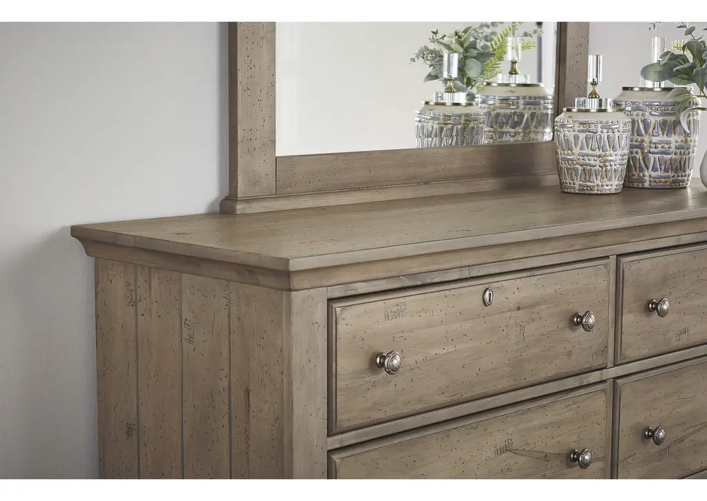 Add versatile and stylish storage to your bedroom with this eight drawer dresser. 2 inch solid maple tops with planked end panels that display a patchwork of stunning grey streaks; wormholes; and graining. Bleached grey tones are reminiscent of sunbaked driftwood. Oval key escutcheon plate on the top drawers with a vintage nickel drawer pull. Weight 222.000 lbs. (99.9kgs.)
