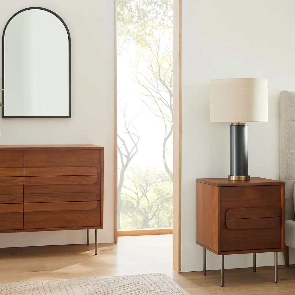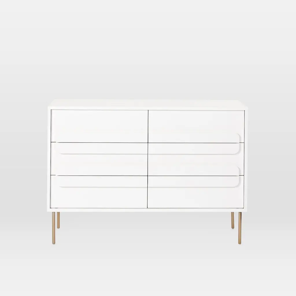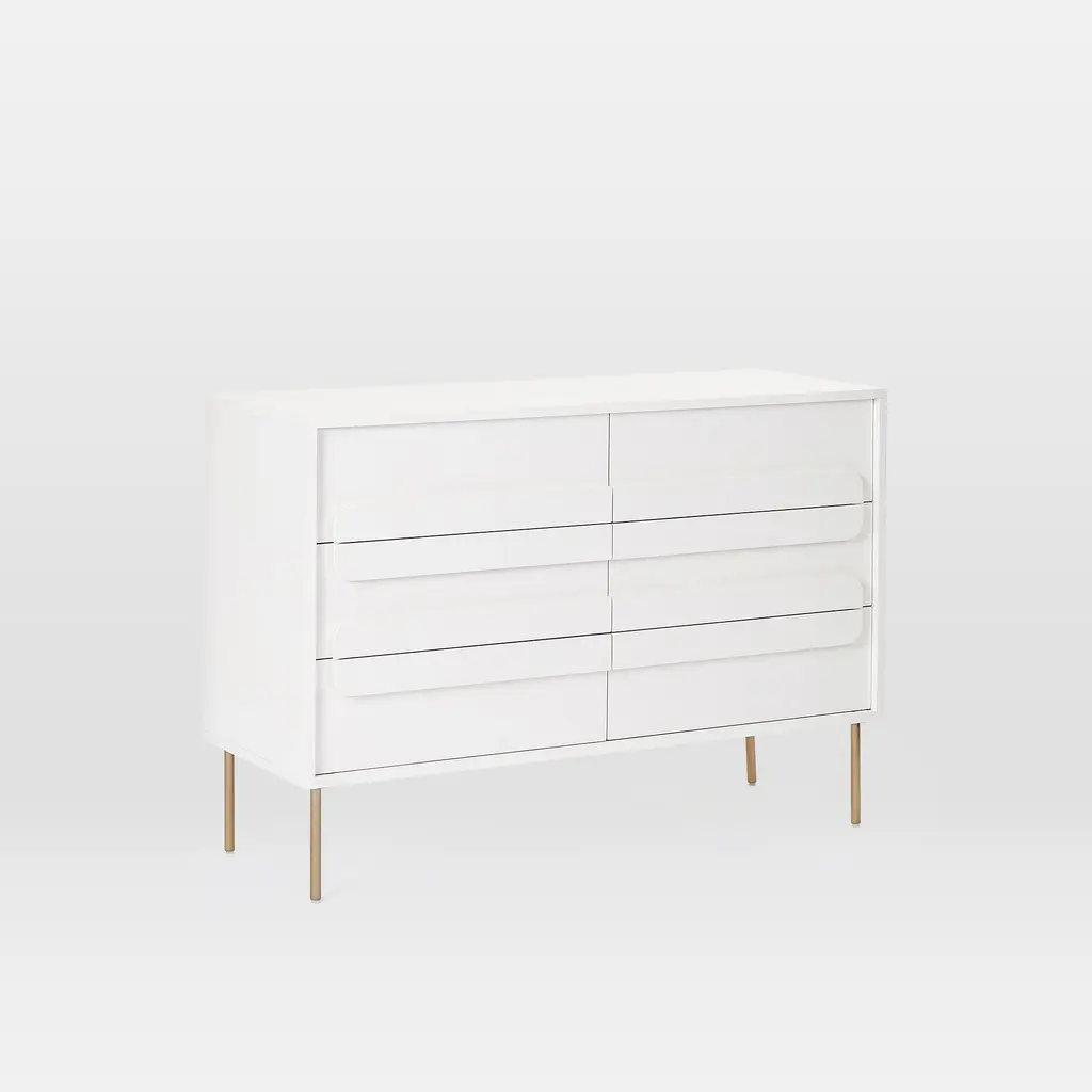 Elongated pulls draw inspiration from ‘70s design. Six drawers provide out-of-sight storage. Set atop lofty legs, it instantly elevates your space. Made with sustainably sourced wood & Fair Trade.