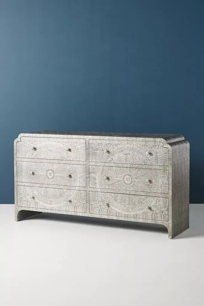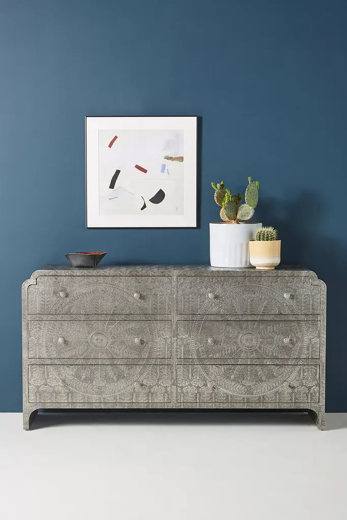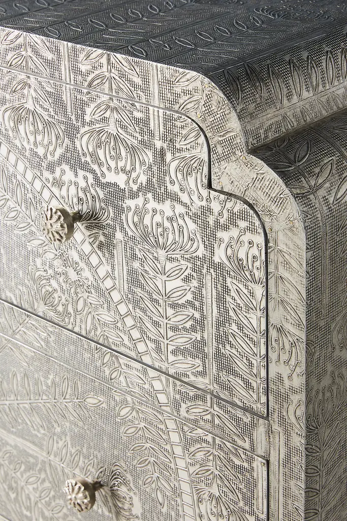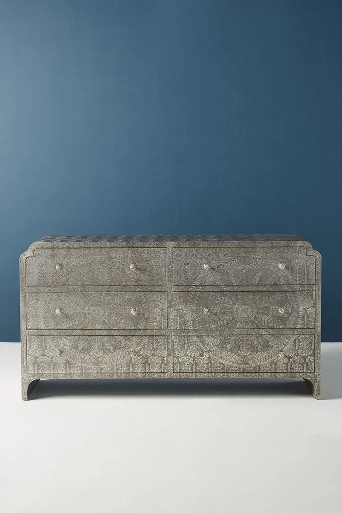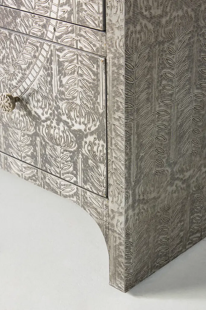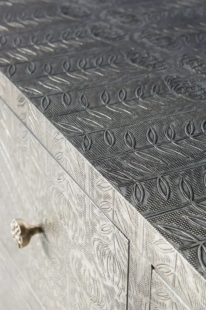 Topped with a luxurious surface of hand-embossed metal, this elegant dresser's rustic shine is sure to make a statement in your bedroom. For ordering assistance and more, please contact us. For aesthetic advice and tips to help decorate your space, enjoy our complimentary home styling services.