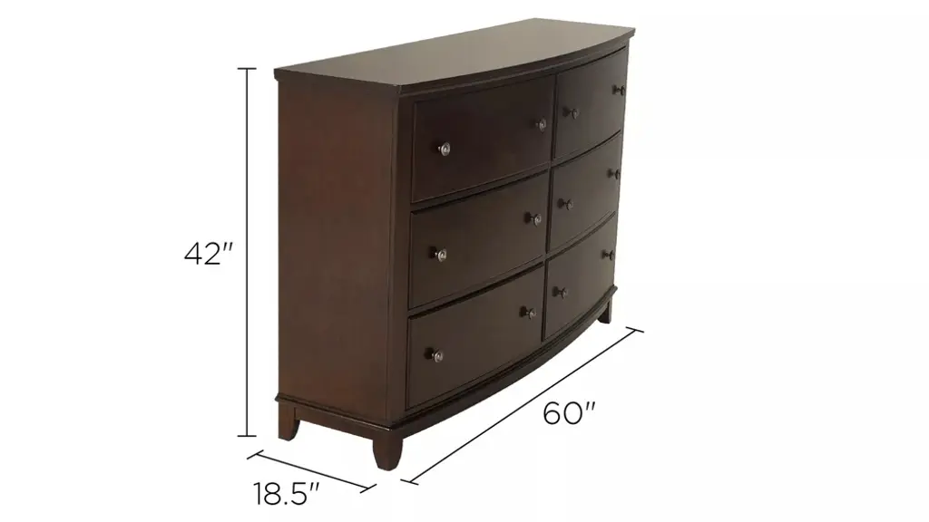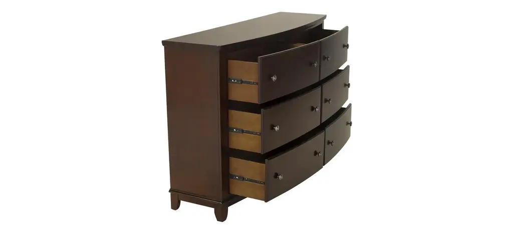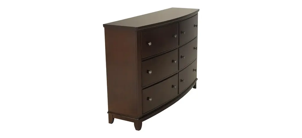 The gentle curves of the Kylie bedroom dresser are what set it apart. From the bowed drawer fronts to the boot heel feet, each shapely detail is a graceful accent. The smooth merlot finish and round black nickel-finished drawer knobs enhance the simple clean lines of this appealing bedroom dresser.