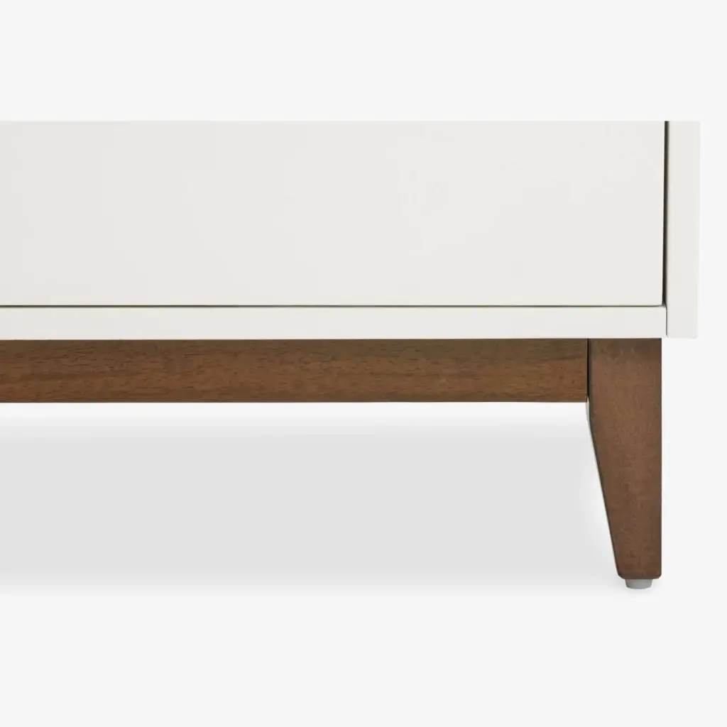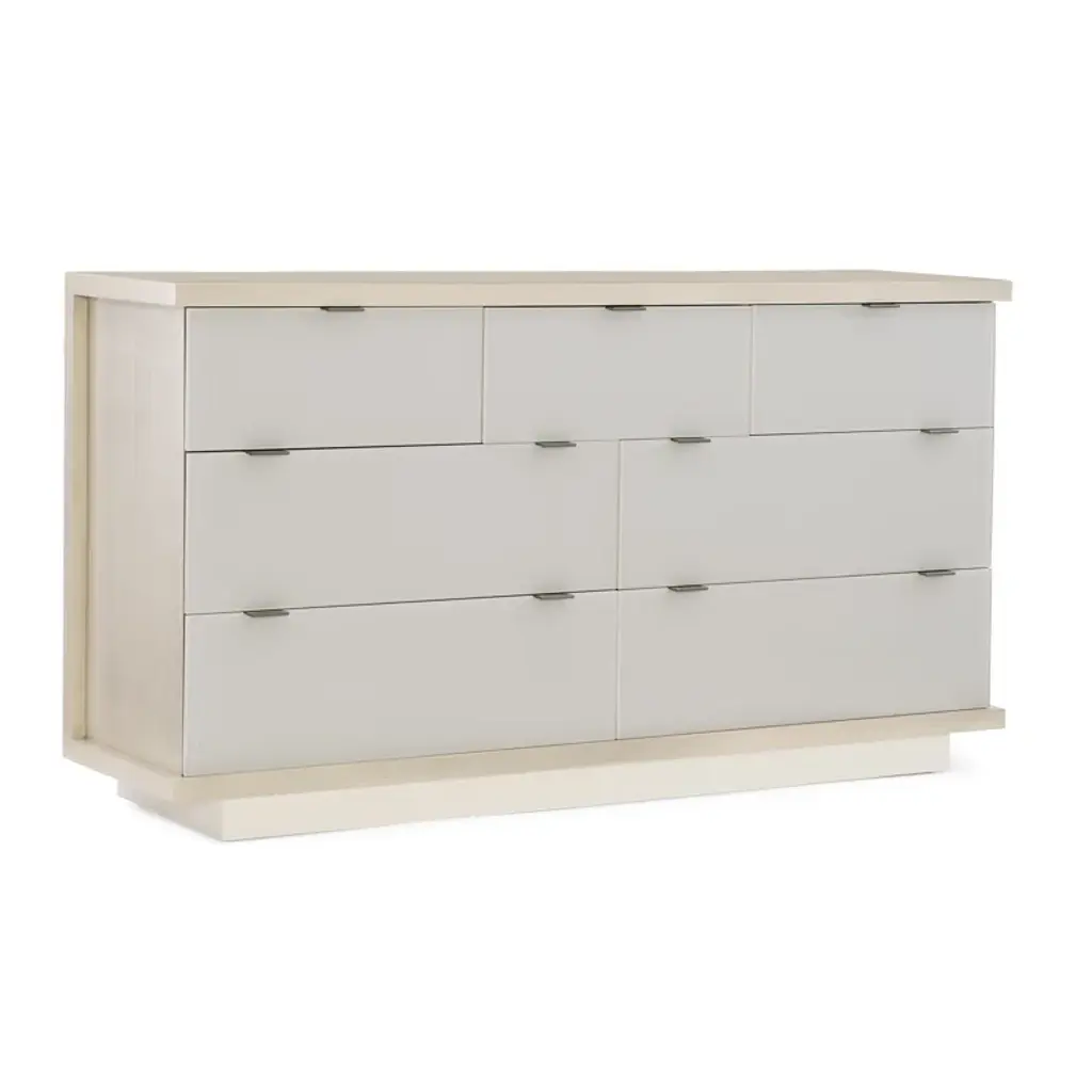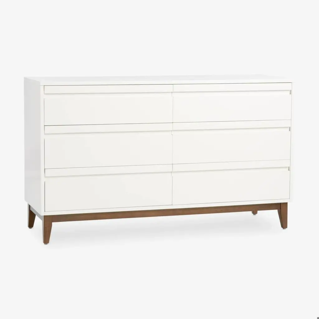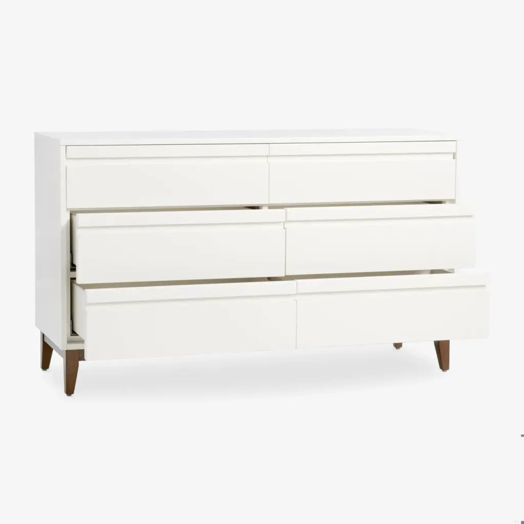 The Laramie dresser offers ample storage, perfect for clothes and linens. This crisp design features clean lines, modern tapered peg legs, and handle-free drawers which add to the elegant silhouette. Note that this cannot be delivered to walkups.