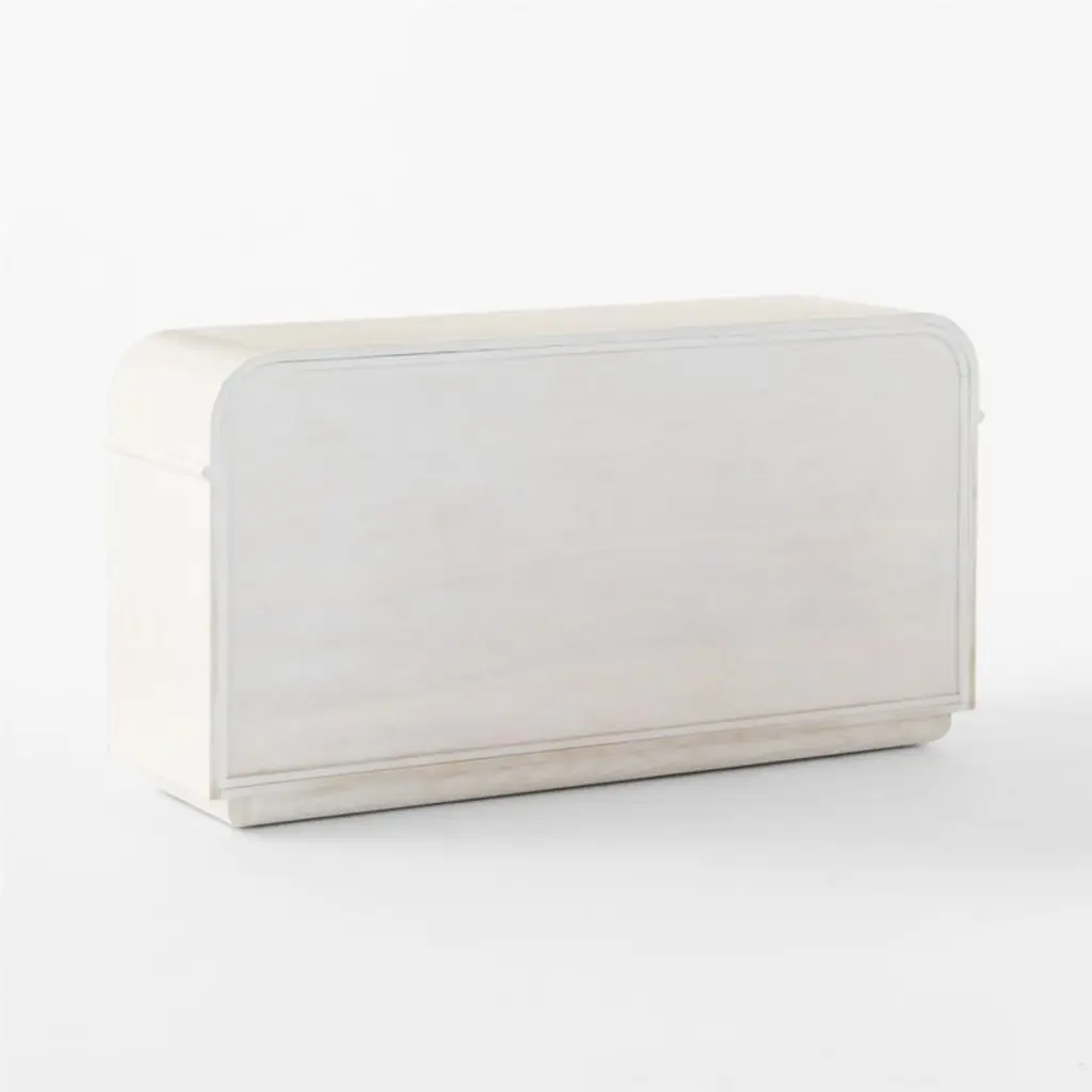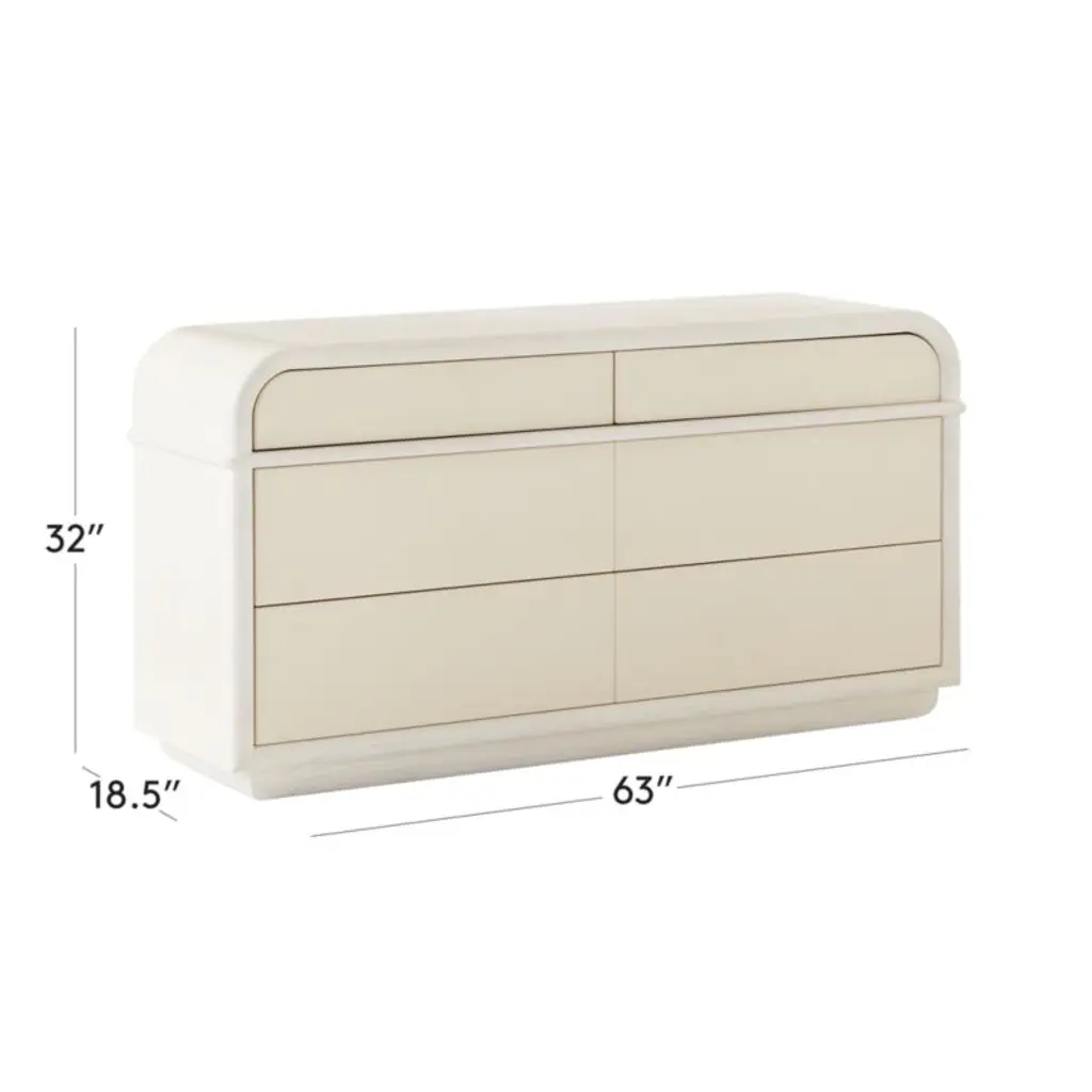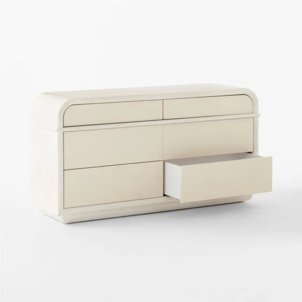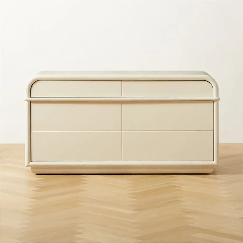 White wood dresser by Brett Beldock alludes to the '80s with a curved silhouette, but its ivory nappa leather drawer fronts are pure modern luxury. Made with mindi wood, its push-to-open drawers on glides reveal abundant storage within. CB2 exclusive.
