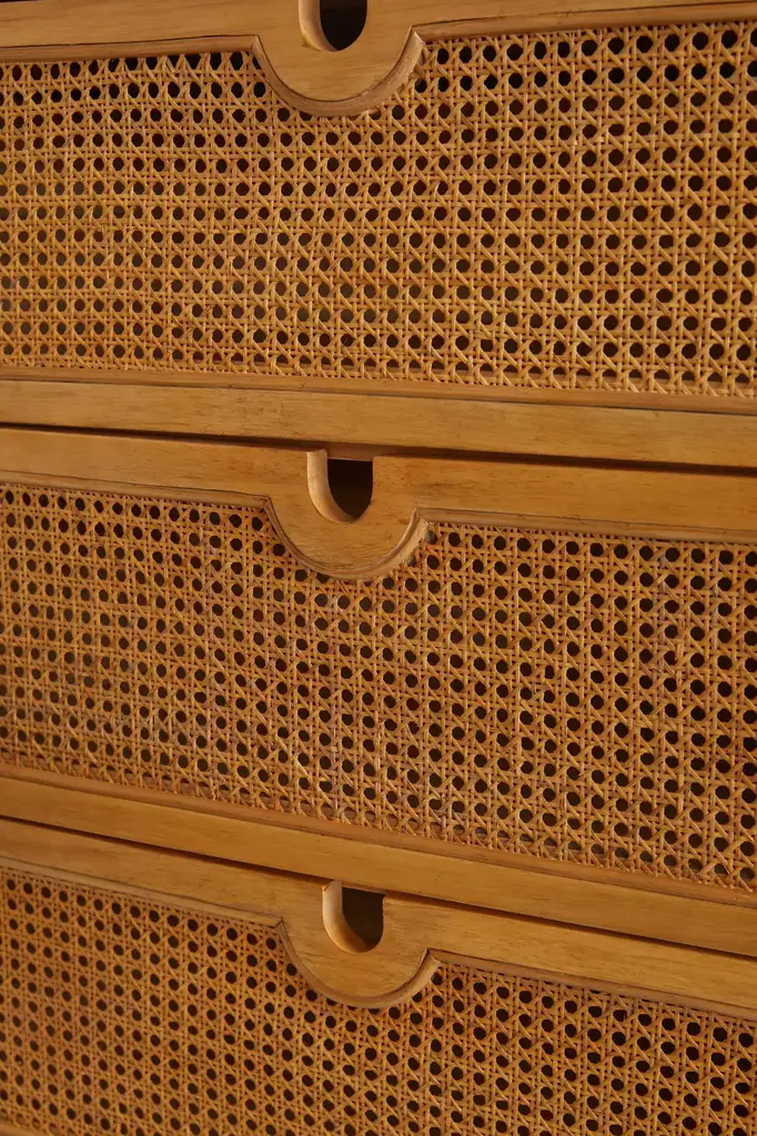 With a minimally bohemian look, our Marte dresser features a 6-drawer construction with rattan detailing. Featuring three rows of two drawers each with wooden framing and woven rattan drawers, complete with cutout pulls. Set on tapered-out removable legs. Available exclusively at Urban Outfitters.