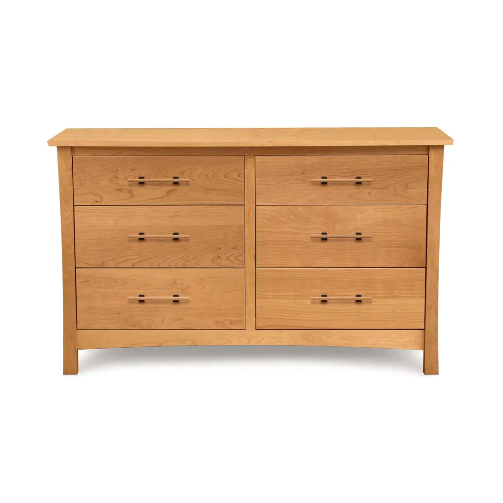 Copeland's luxurious, cherry wood, Monterey 6 Drawer Dresser fuses American Arts & Crafts style with modern Japanese and Asian design. The luxury Monterey Furniture Collection is handmade in Vermont using eco-friendly, sustainably harvested cherry wood.Construction details include natural cherry wood frame and panel structural design, solid cherry wood top, 1/4" top-grade cherry veneer panels integrated into the case sides and back, fully finished drawer boxes with solid wood drawer fronts/sides/backs, easy-grip, wide cherry and walnut drawer pulls, asymmetrical English dovetails and adjustable two glide wooden spring-loaded drawer slides for sturdy, smooth operation.Base price represents dresser in natural cherry Shown in natural cherry Matching furniture available in our Monterey Furniture CollectionNatural variations in solid wood and hand applied finishes make each piece unique. Slight grain and finish irregularities tell you that the furniture has been crafted from solid wood and are considered hallmarks of quality.