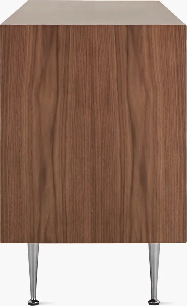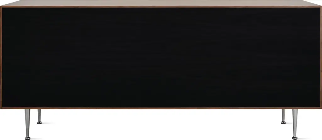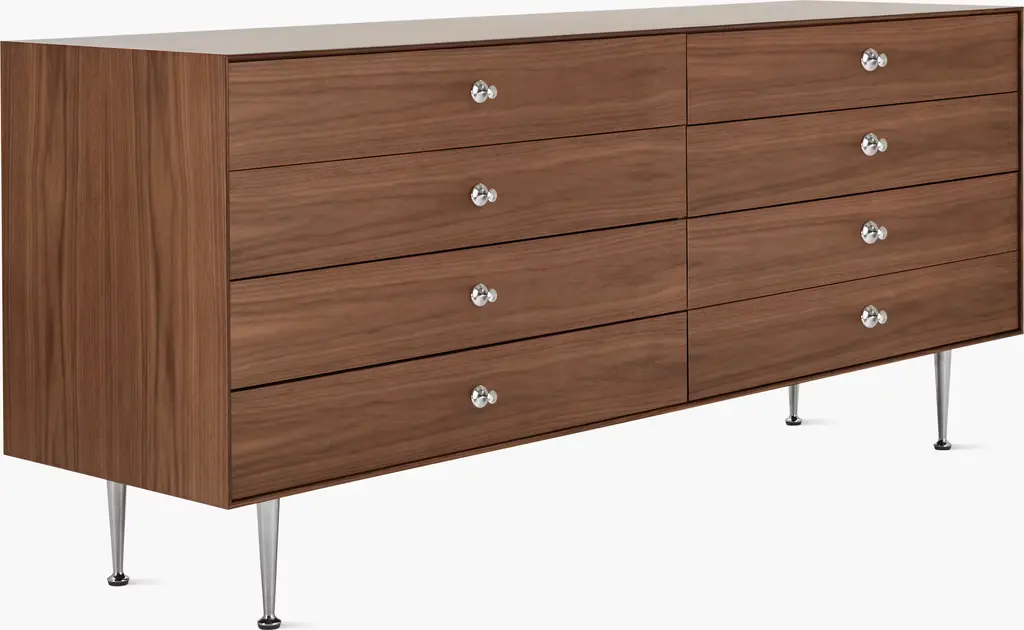 George Nelson's Thin Edge Collection (1952) was first called the Rosewood Case Series. Manufactured today with environmentally sustainable veneers and 85% recycled materials, Thin Edge leverages the latest manufacturing technologies without compromising the design's original look and feel. This is the authentic Thin Edge Double Dresser by Herman Miller.
