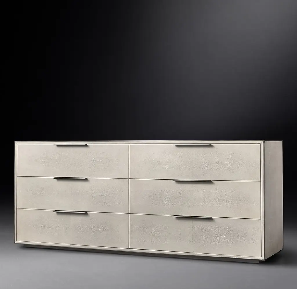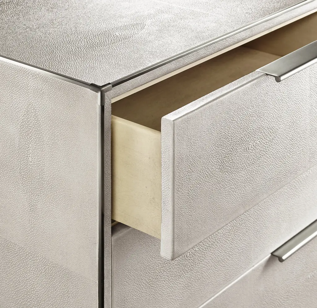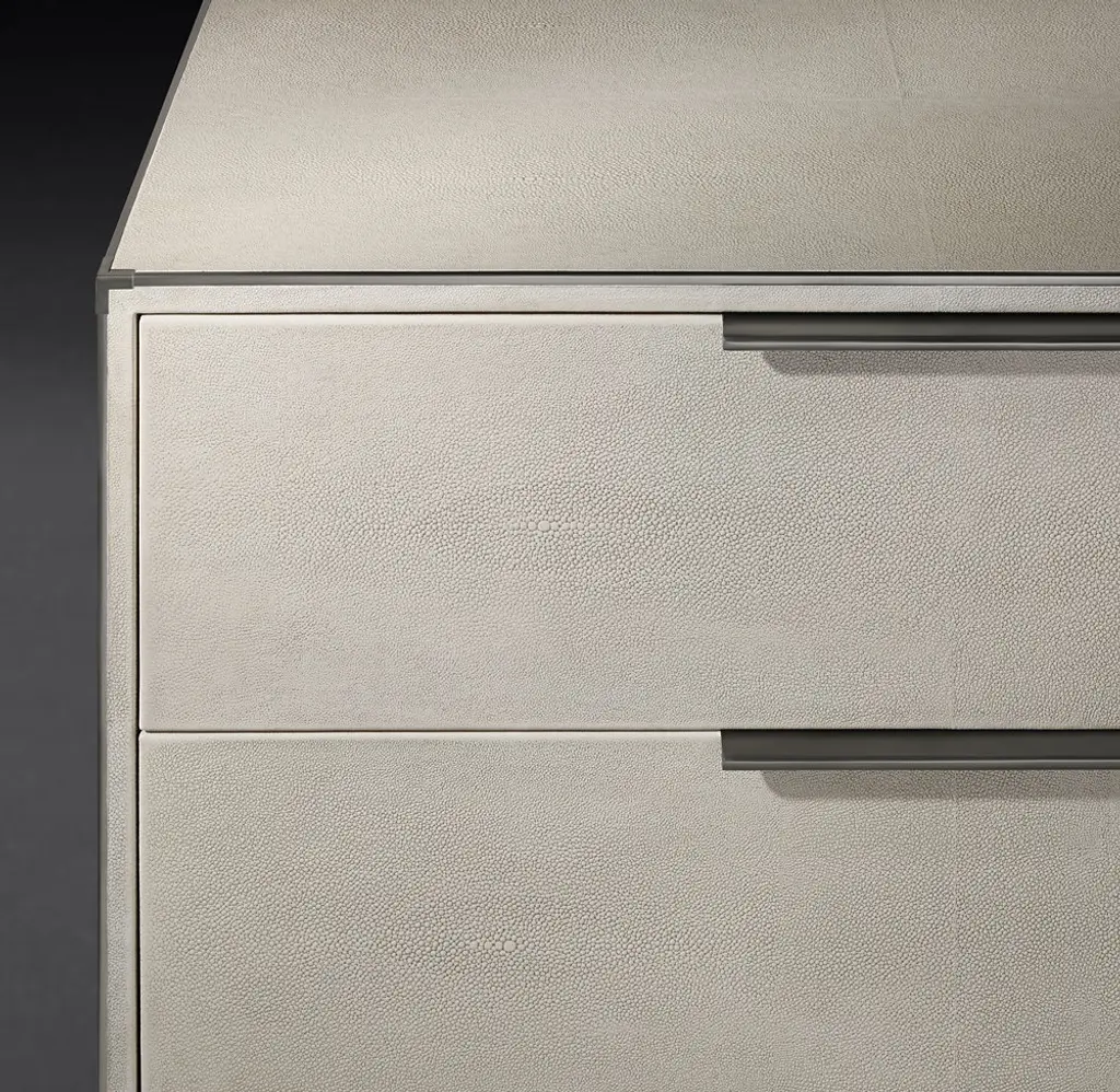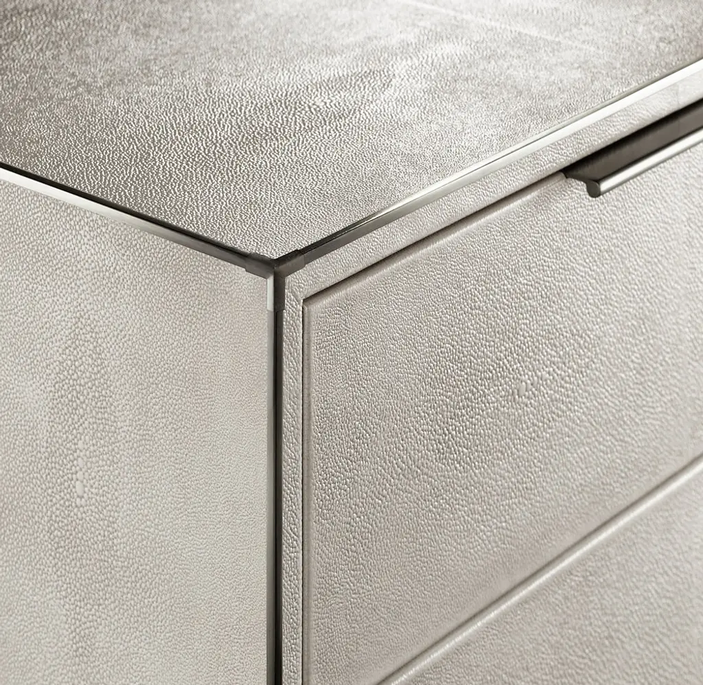A 1970s interpretation of French Art Deco design, our bedroom collection from the Van Thiels celebrates the marriage of two eras. With elegant materials and a refined form, it's clad in rich shagreen-embossed leather with metal trim detail. SHOP THE ENTIRE COLLECTION