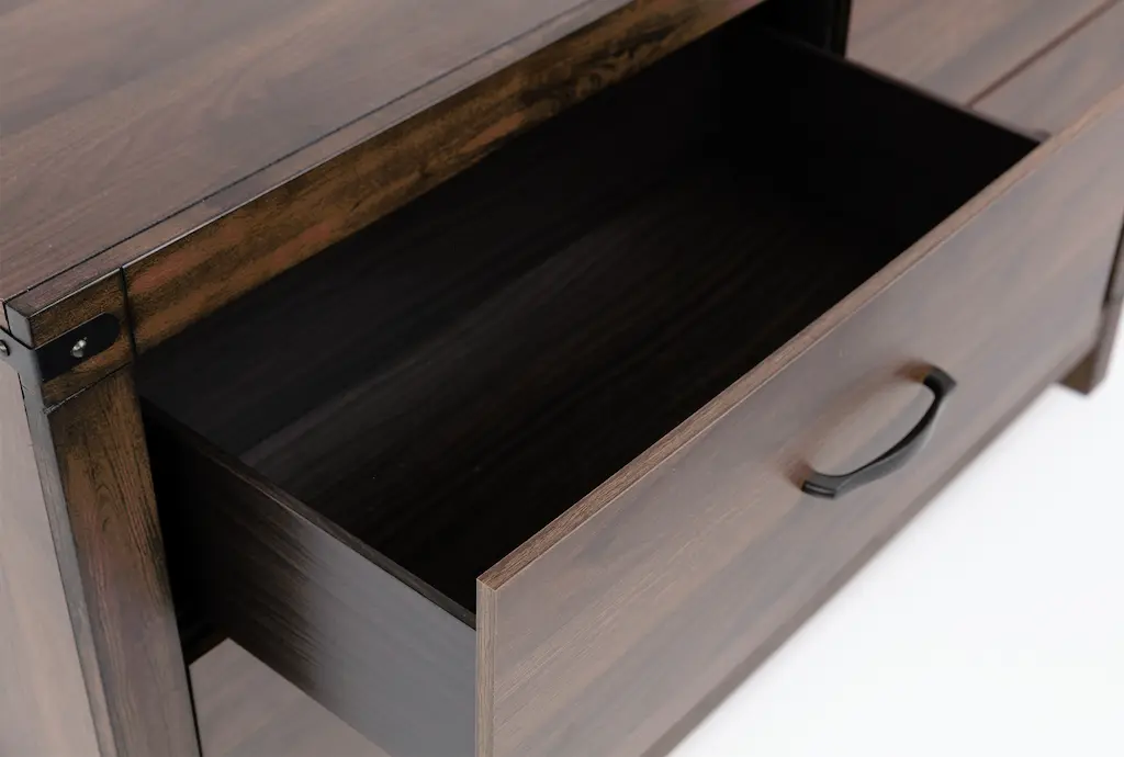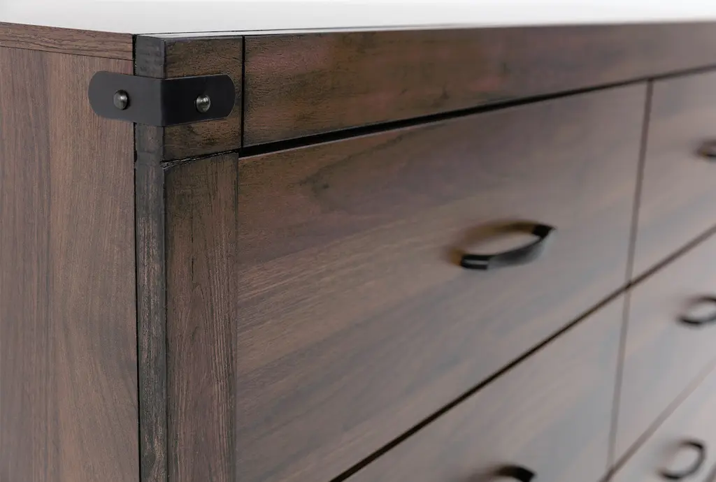 Introducing the Willow Creek II Brown Wood 6-Drawer Dresser to elevate your bedroom space with traditional style. This dresser, finished in Columbian Walnut, offers a small yet substantial storage solution. Its melamine veneer and solid rubberwood construction ensure durability and easy maintenance.
