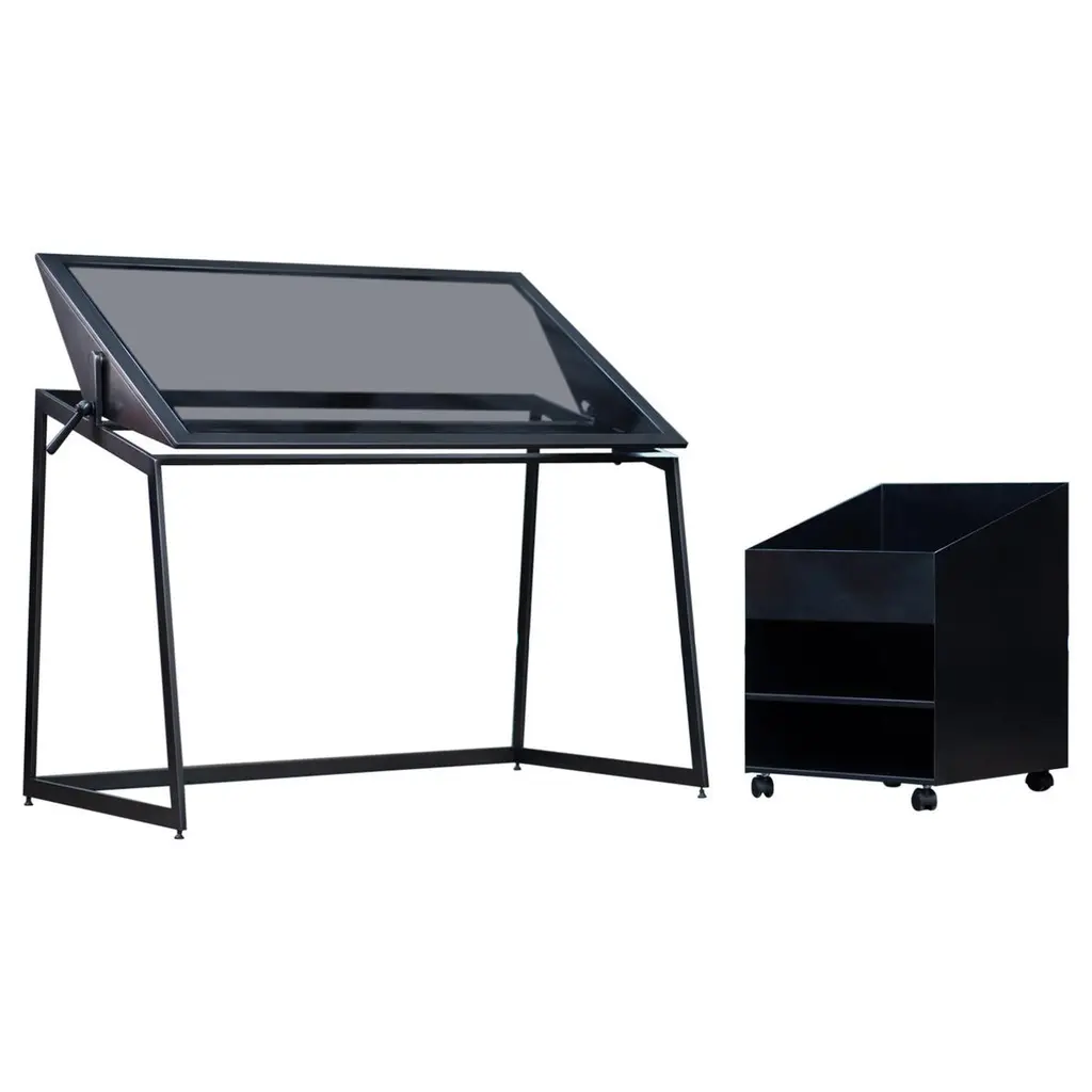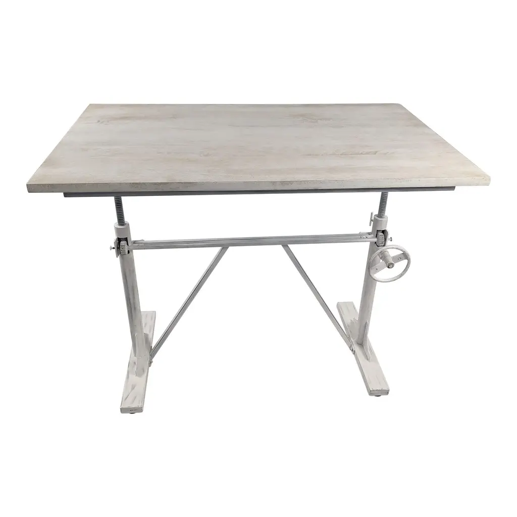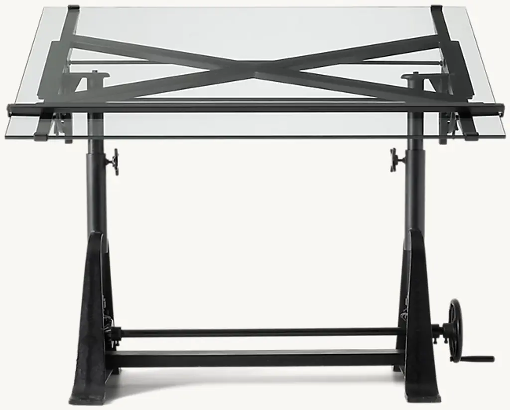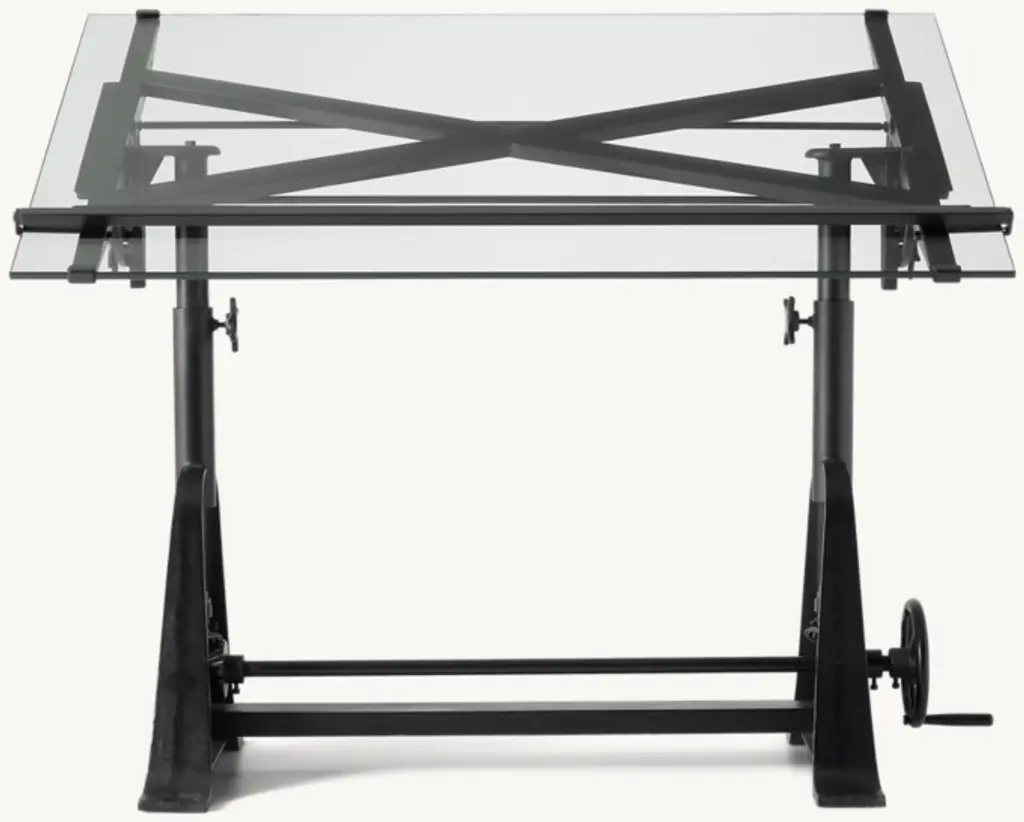 Like those of the early 20th century, our drafting table is crafted of cast iron topped with a broad glass work surface that lifts, lowers and tilts to suit the worker or the task at hand. The substantial, bell-curved trestle base offers excellent stability through the full range of settings.