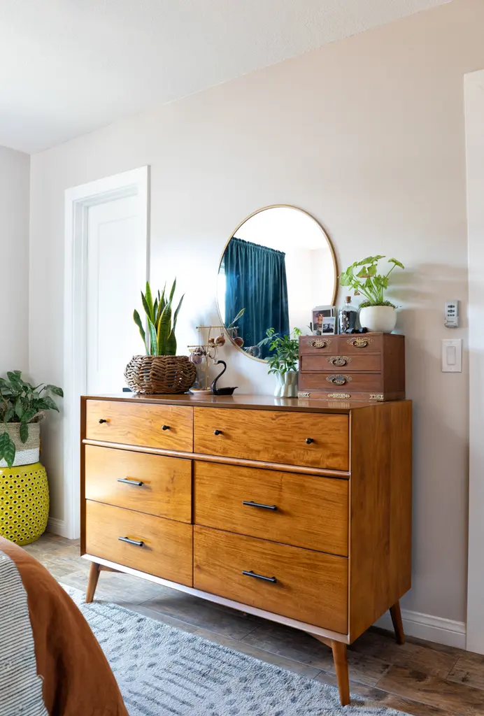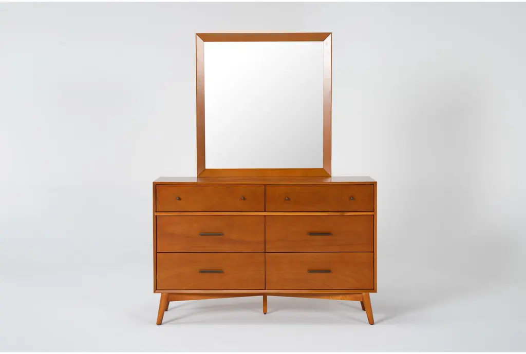 The Alton Cherry II Brown Wood 6-Drawer Tall Dresser with Mirror is a stunning addition to any bedroom. Its mid-century modern design and cherry finish bring a touch of retro charm to your space. The dresser is constructed from okoume veneers and solid rubberwood, ensuring durability and a timeless look.