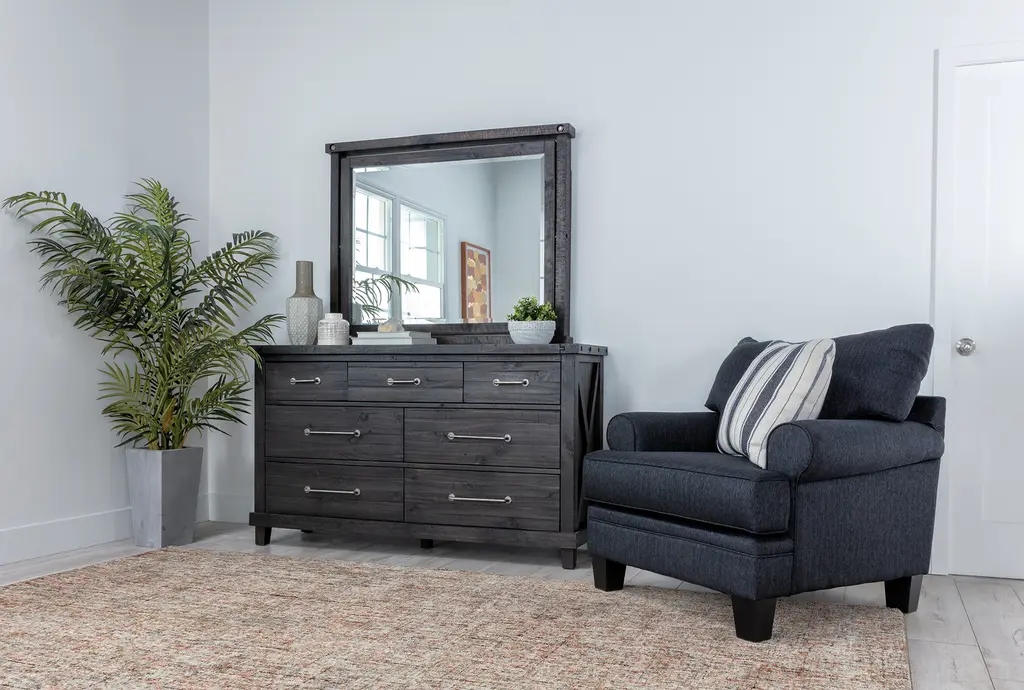 The Jaxon Espresso II Black Brown Wood 7-Drawer Tall Dresser with Mirror is a functional and stylish addition to your bedroom. Its industrial design and solid wood construction provide durability and a timeless look. Ample storage space is available with its 7 spacious drawers and an included mirror for added convenience.