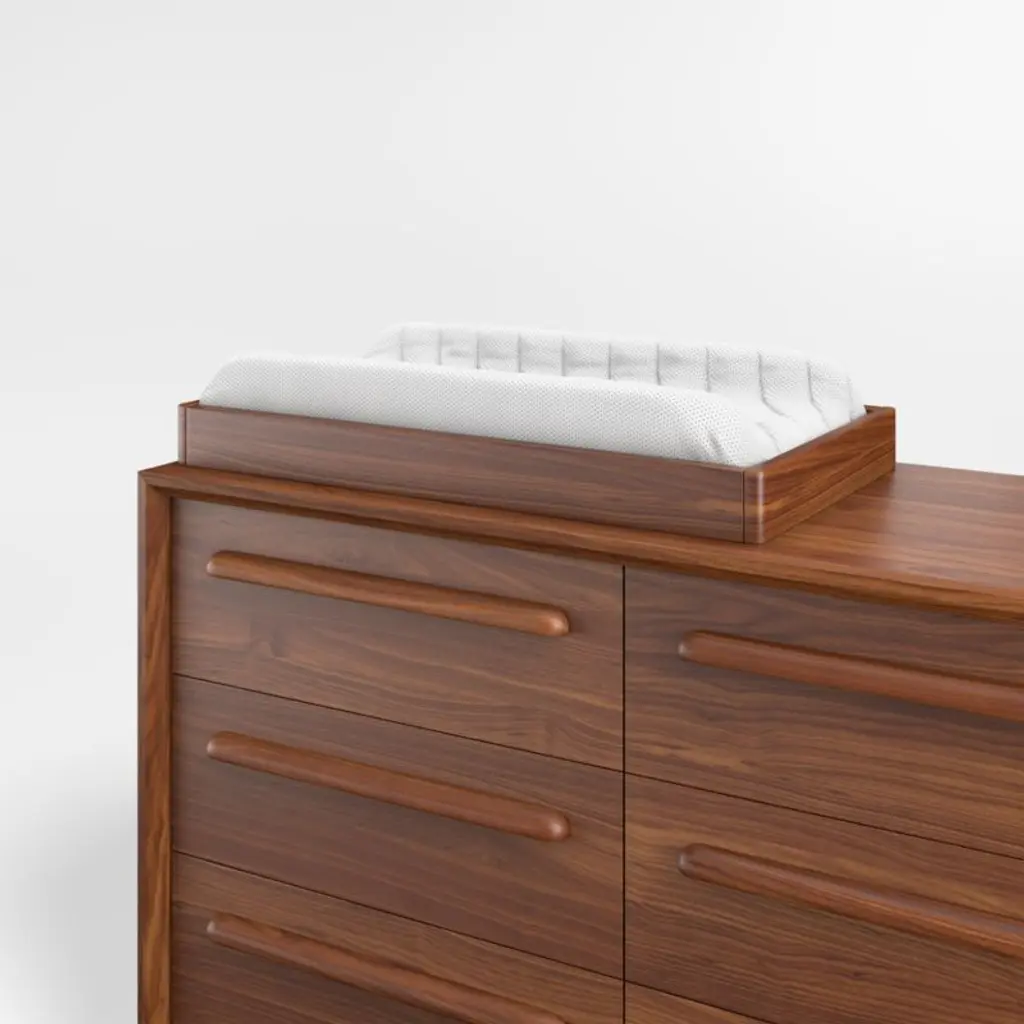 Turn our Tatum Mid-Century Wide Dresser into a stylish mid-century-inspired changing table for your nursery. Expertly crafted in solid poplar and walnut veneer, it features a natural walnut finish to highlight the gorgeous grain pattern.