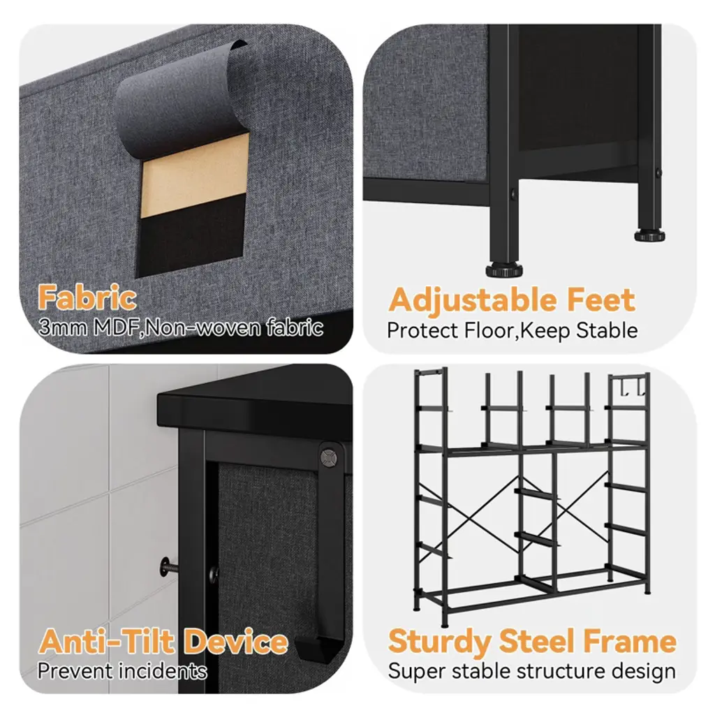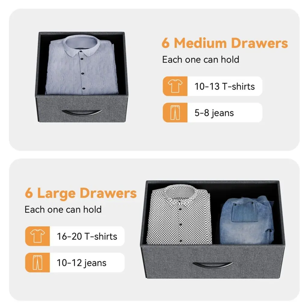 The fabric dresser for bedroom Designed with 10 individually collapsible drawers, including 6 drawers for small items, 2 drawers with 2 compartments for medium size items and 6 large size drawers for Large size items. The fabric dresser for the bedroom offers endless organizational possibilities.