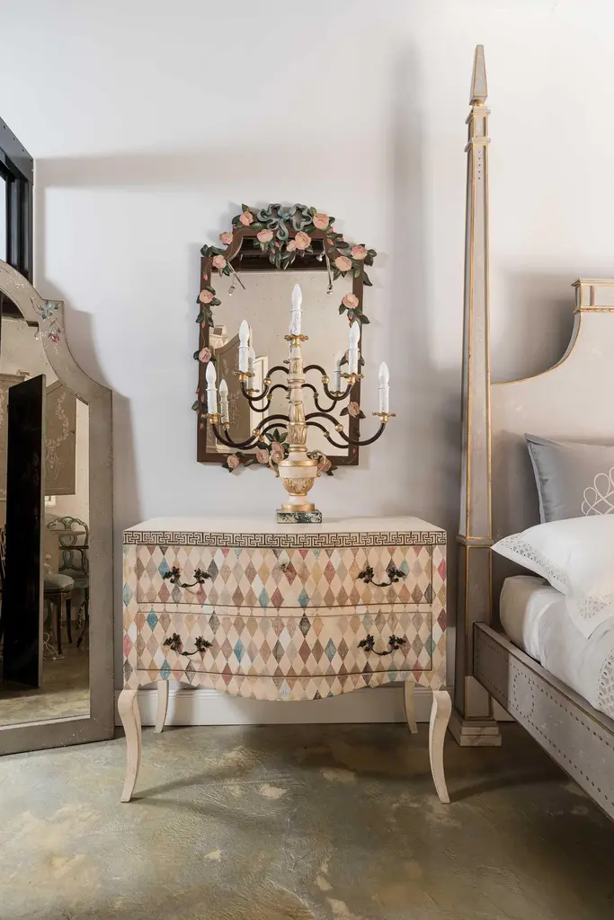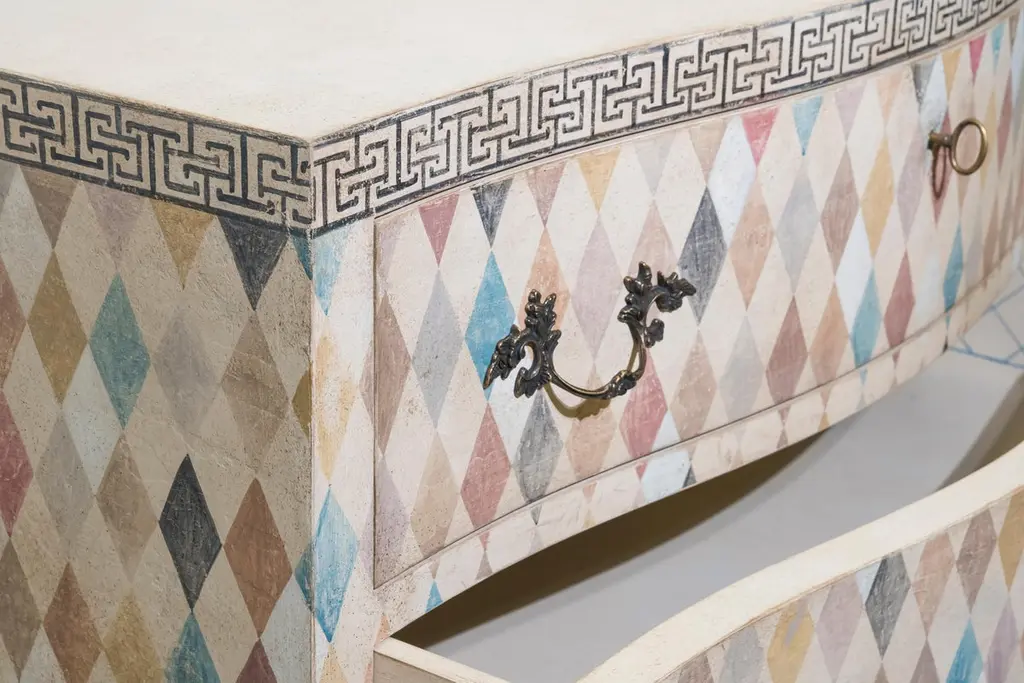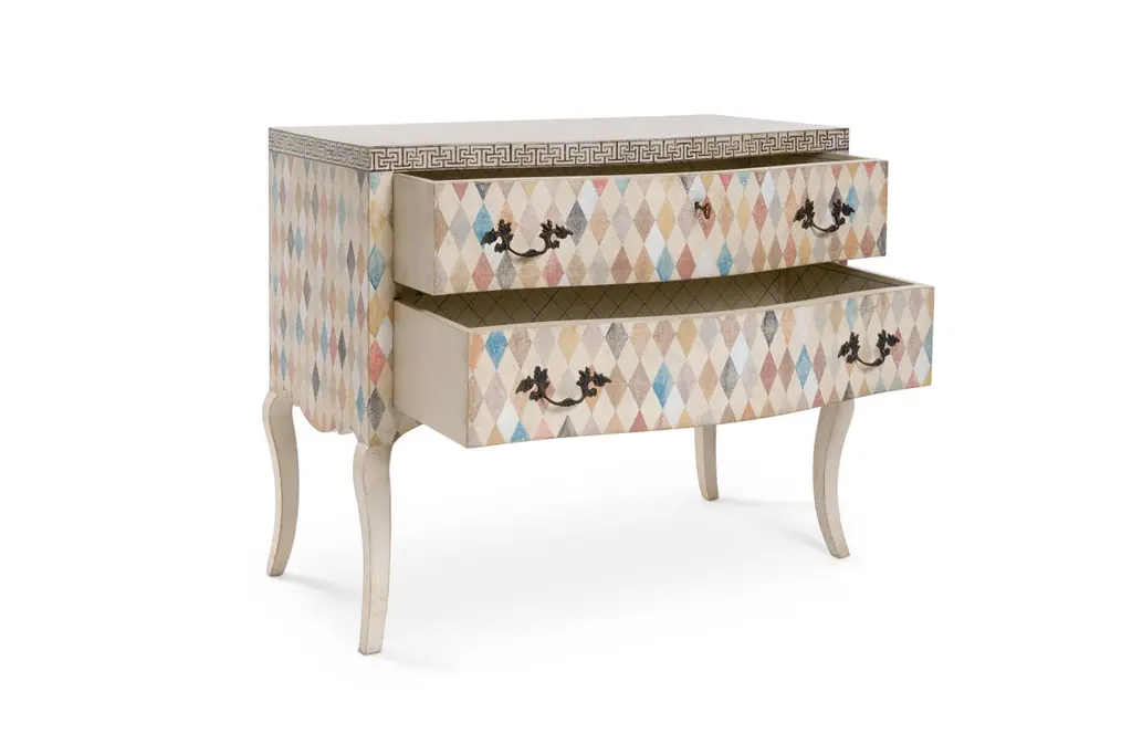 From our hand-painted Furniture Collection, we are pleased to introduce you to our Serenissima chest with Harlequin inspired decors.Harlequin, the most discriminating character from the Italian commedia dell'arte, is the main inspiration behind this brand new decoration which has already become one of our strong point. Of course, the color palette can be entirely customized in order to match all surroundings and personal taste.Each piece from our Collections is entirely hand-painted on every side of the Furniture by using the very best 18th Century Craftsmanship Venetian Techniques, passed down through the generations of artists from our land. We are passionate about decorating also the inside of every drawers, in this case with our "criss-cross" decors, so that even the simple act of opening your chests becomes a moment of graceful beauty.