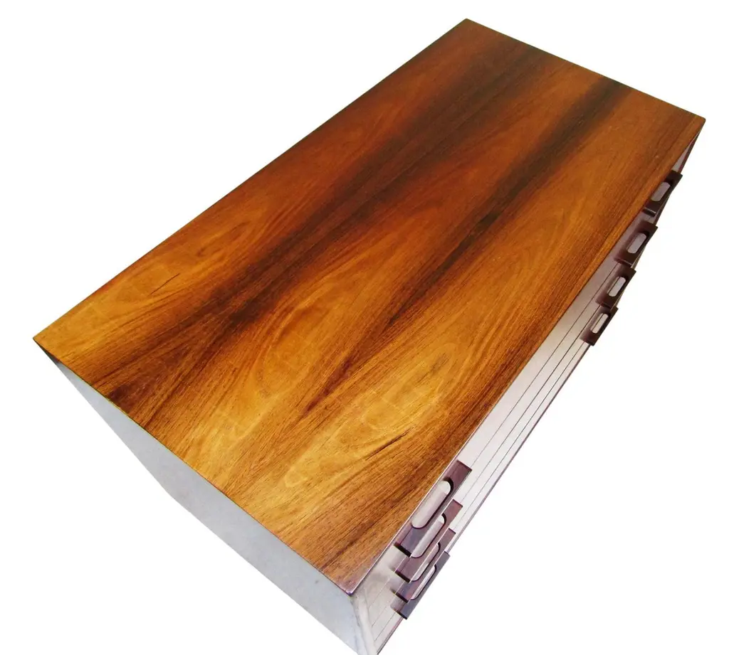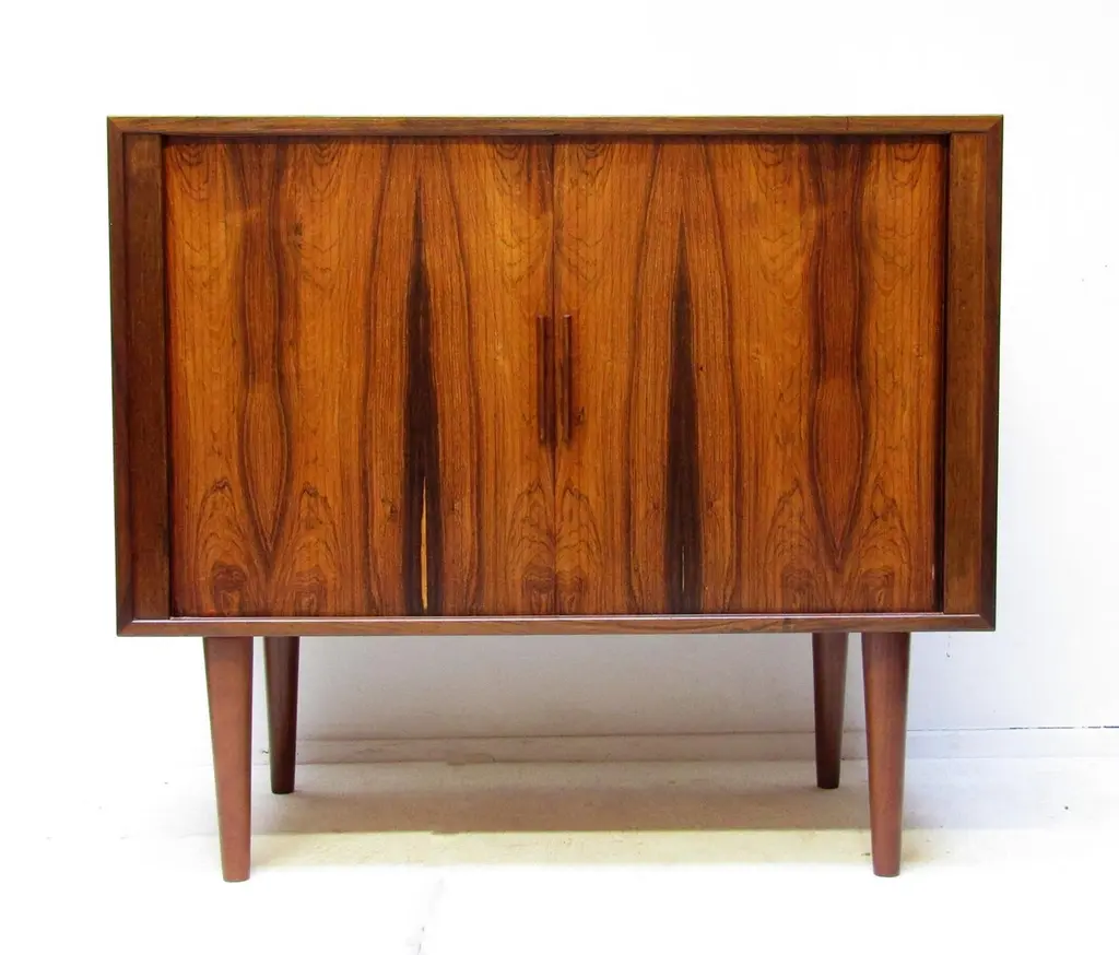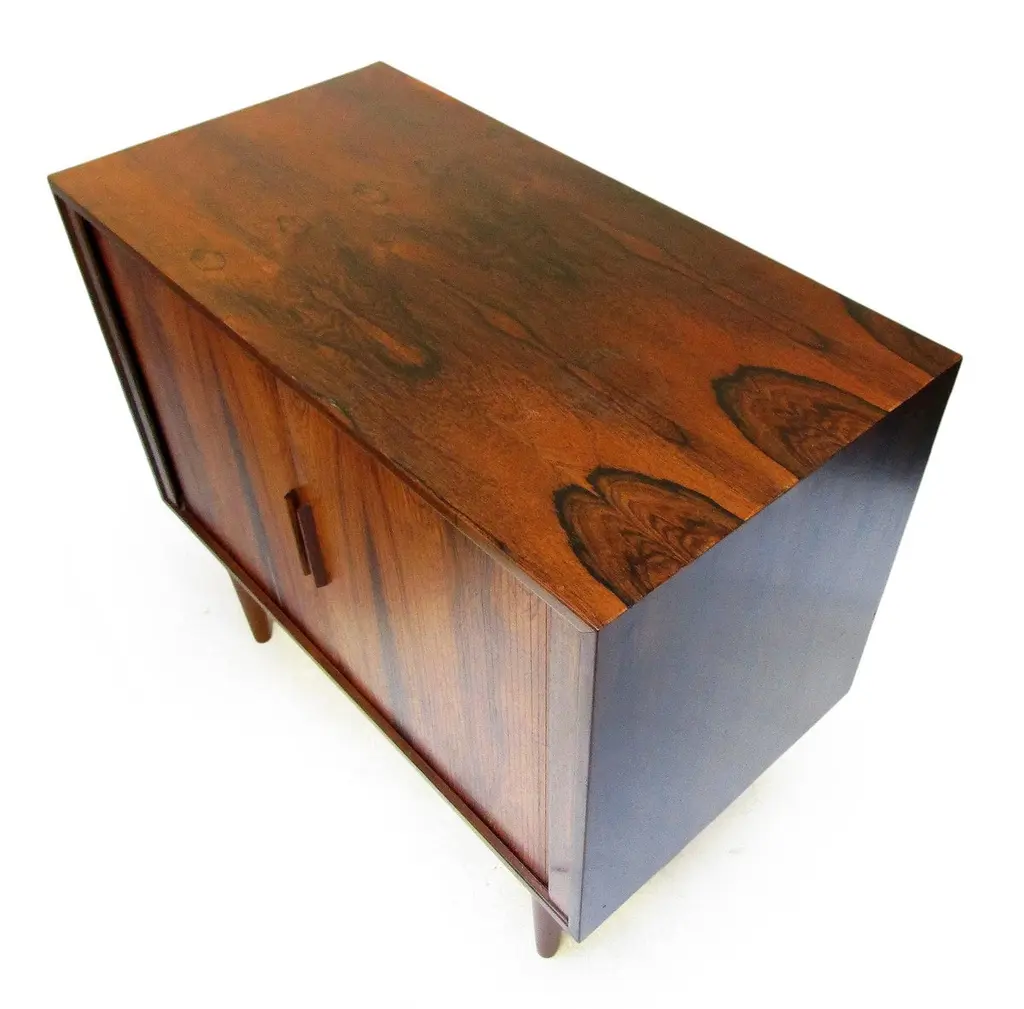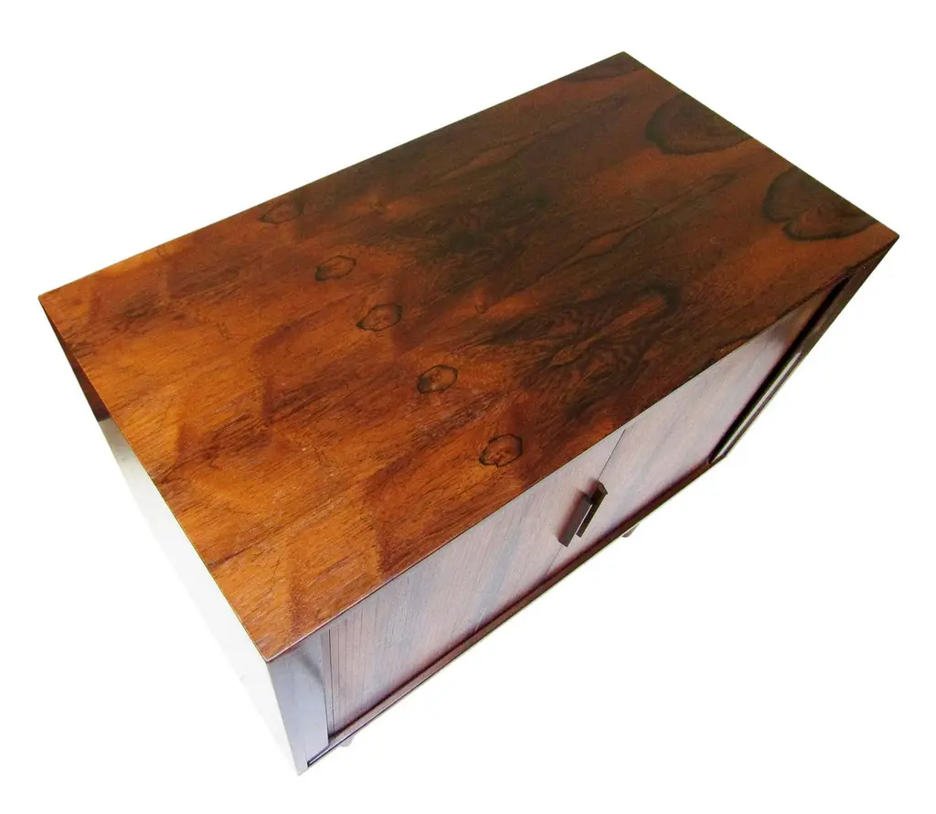 A beautiful chest of drawers and tambour cabinet set by Kai Kristiansen for FM Mobler.Of 1960s vintage, they are veneered in florid Brazilian rosewood.The four drawers and tambour door slide smoothly. The cabinet has one adjustable shelf.They have been fully reconditioned and are ready for use.