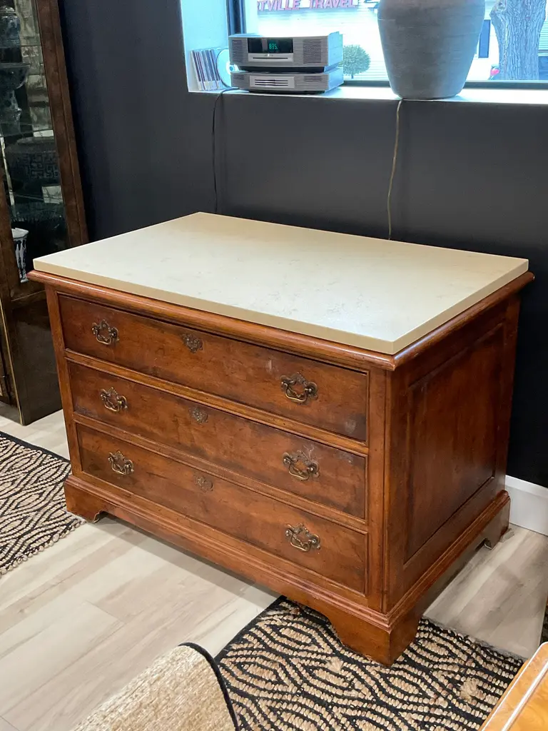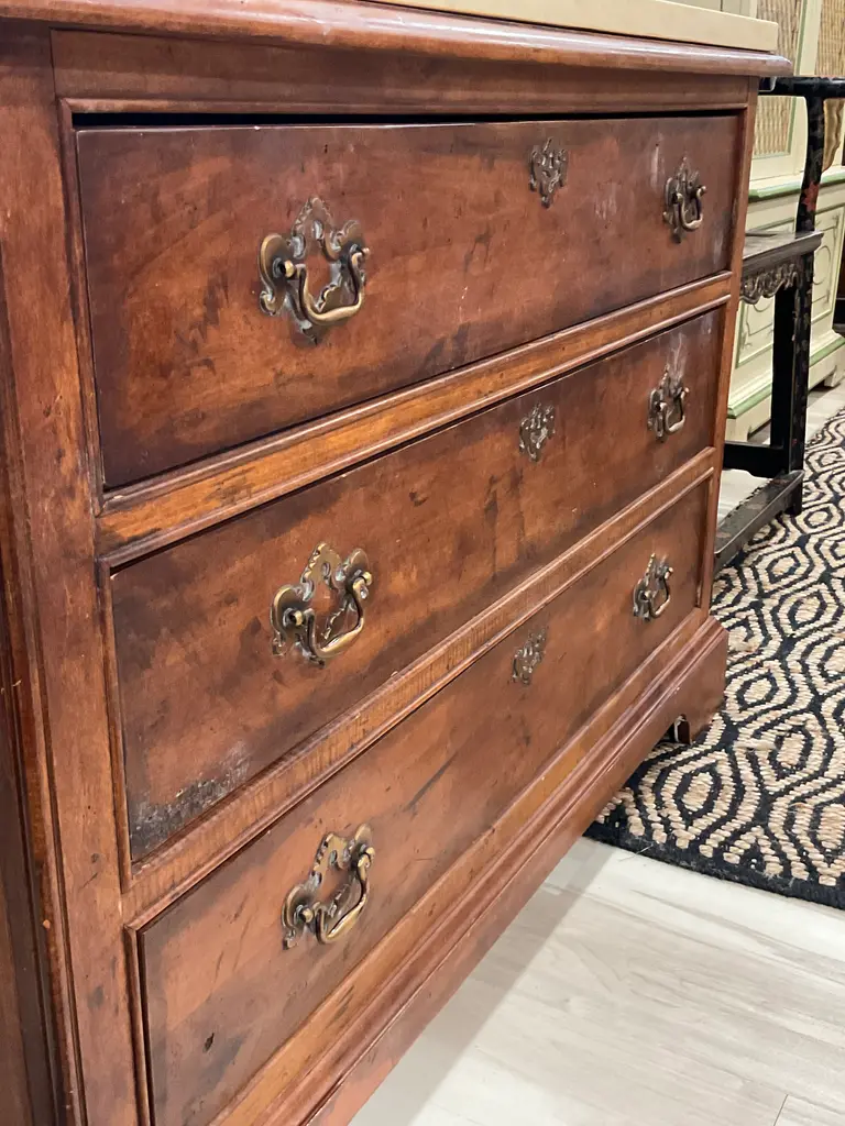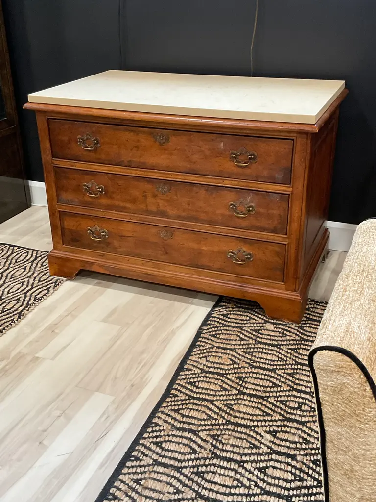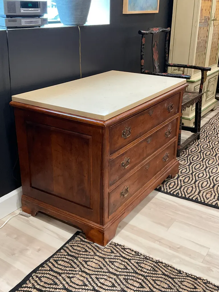 1 of 2 Monumental Chests of Drawers from Century Furniture. Naturally Distressed finish, beautiful hardware and cream stone tops. These are huge and have a heavy European rustic feel. (Italian farmhouse). $6800 each as new in the 1980's. Condition Disclosure: Please understand nearly all of our inventory is comprised of rare to very rare vintage pieces. They are not new and will have some imperfections, it's part of the charm and history of owning a vintage piece. Understand what you're purchasing as not to be new furniture. Use the photos as your guide, they are part of the description. We strive to secure the finest vintage inventory available to us, our criteria is stringent and expectations are high, however these are vintage pieces that have shared a past life.