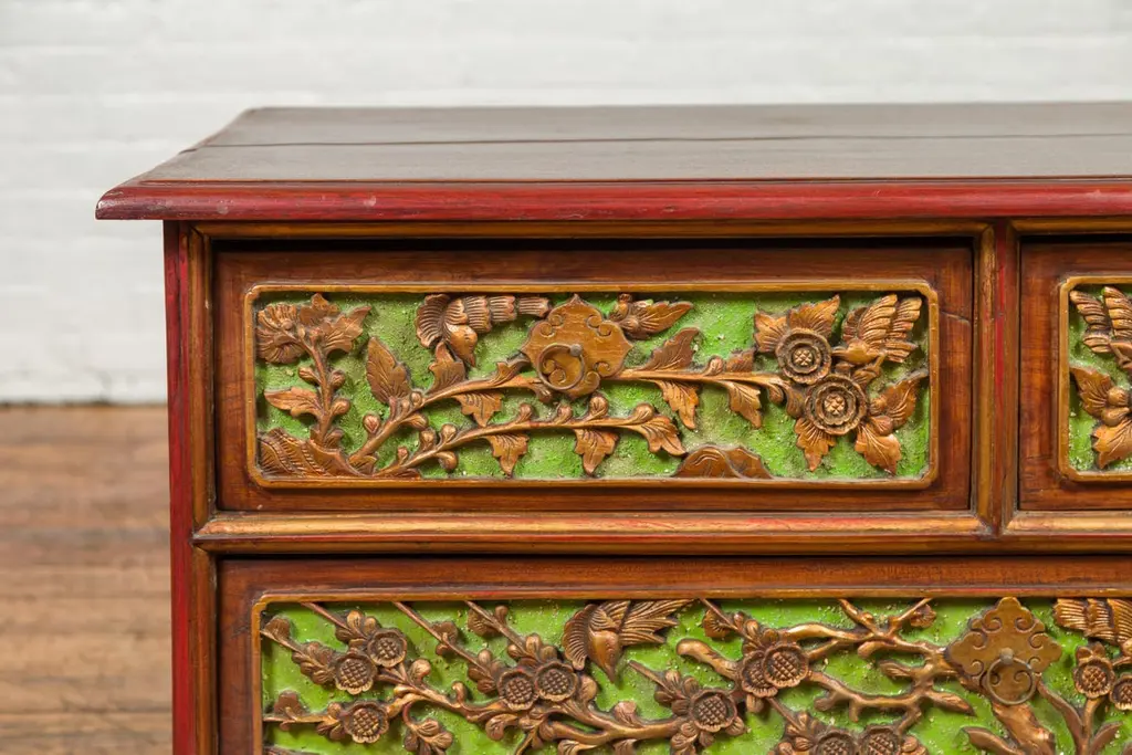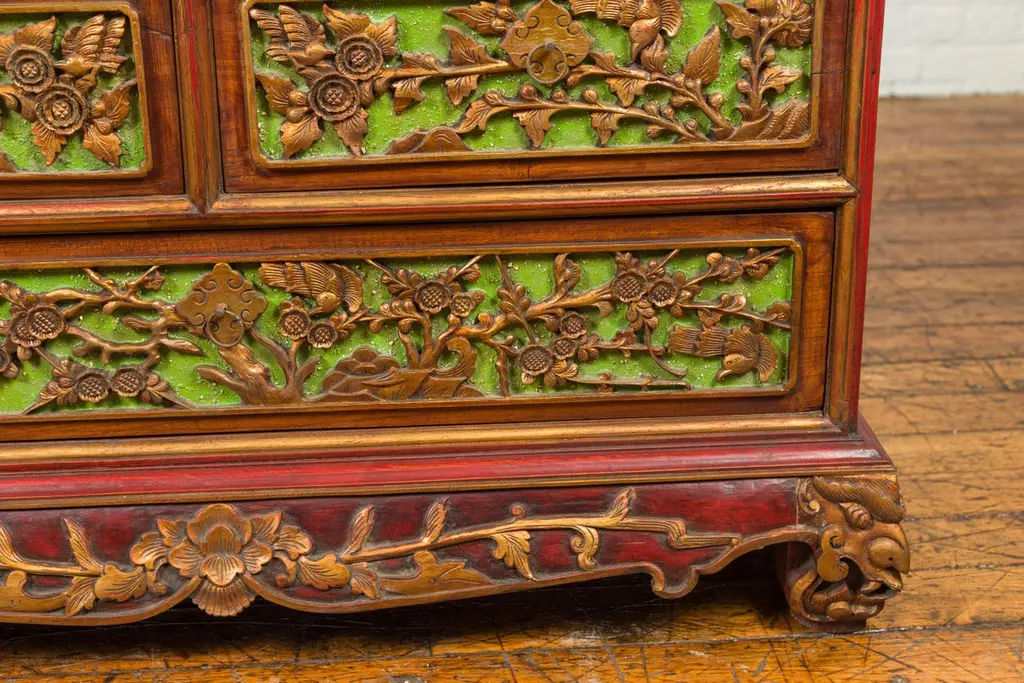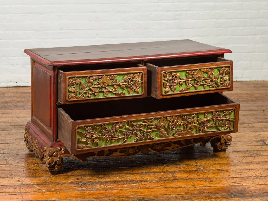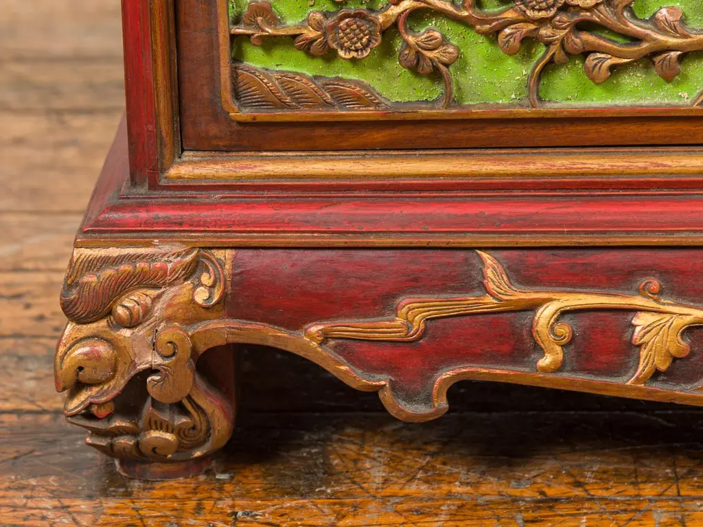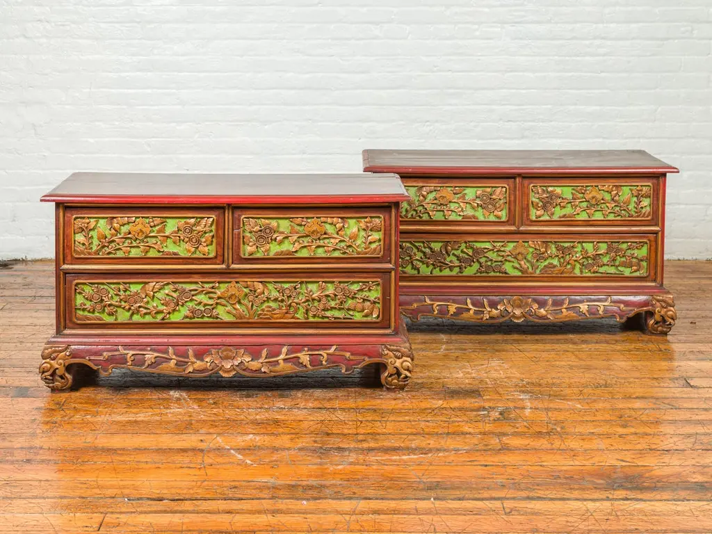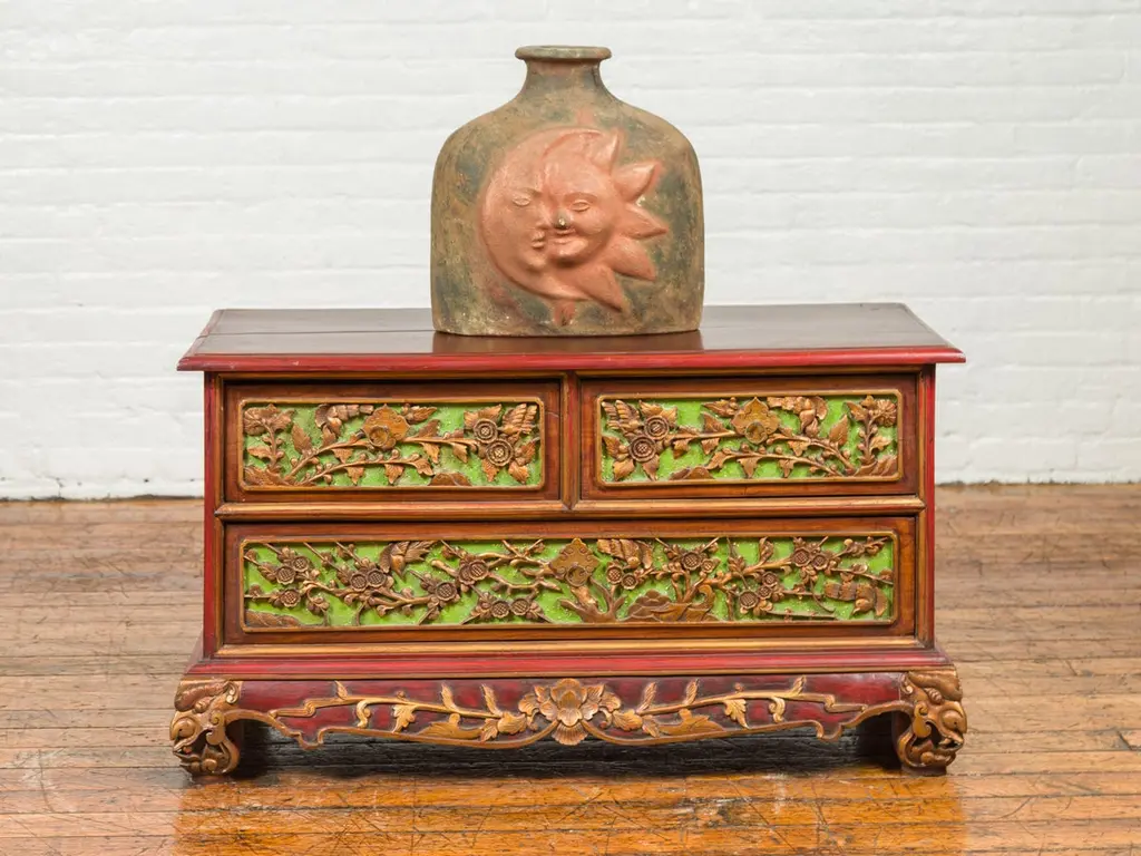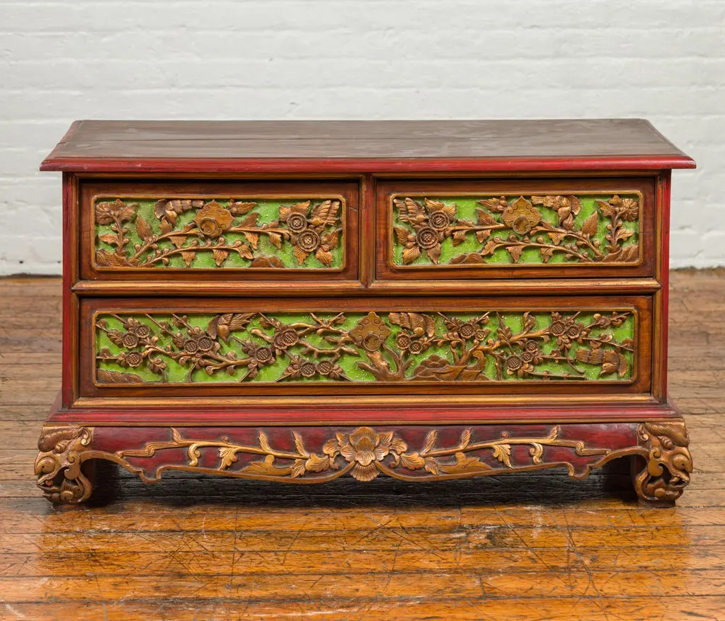 An Indonesian polychrome dresser from Madura with carved drawers and verdigris highlights. We have another dresser available that is very similar and will make for a perfect pair. See item LU863919142832. Immerse yourself in the captivating artistry of this 19th-century Indonesian polychrome dresser from Madura, an island known for its rich cultural heritage off the northeastern coast of Java. This exquisite dresser, with its intricate carved floral motifs and striking green highlights, is a testament to the skilled craftsmanship and vibrant aesthetic of Madurese art.The dresser features a rectangular top with beveled edges, lending a refined touch to its robust structure. Below, three drawers - two smaller ones atop a larger one - showcase gilt carved flowers and foliage, their golden hues vividly contrasting against a green background. This combination of colors - gold, green, brown, and red accents - creates a dynamic and visually stunning palette.The dresser stands on short scrolling feet, each foot carved with mask motifs, adding a mystical and cultural element to the piece. These feet are connected by a skirt that is decorated on three sides, enhancing the dresser's overall ornate appearance.In a modern home, this Madurese dresser can serve as a magnificent focal point in a living room or bedroom. Its rich carvings and colorful polychromy make it an ideal choice for those who appreciate unique, statement furniture pieces. The dresser offers practical storage while adding a touch of 19th-century Indonesian elegance to your space. Accompanied by a similar chest (shown in image 4 and available separately), these dressers can create a harmonious and striking pair in any interior setting. Each chest, priced at $1,600, is not just a piece of furniture but a piece of art, embodying the beauty and history of Madurese craftsmanship.