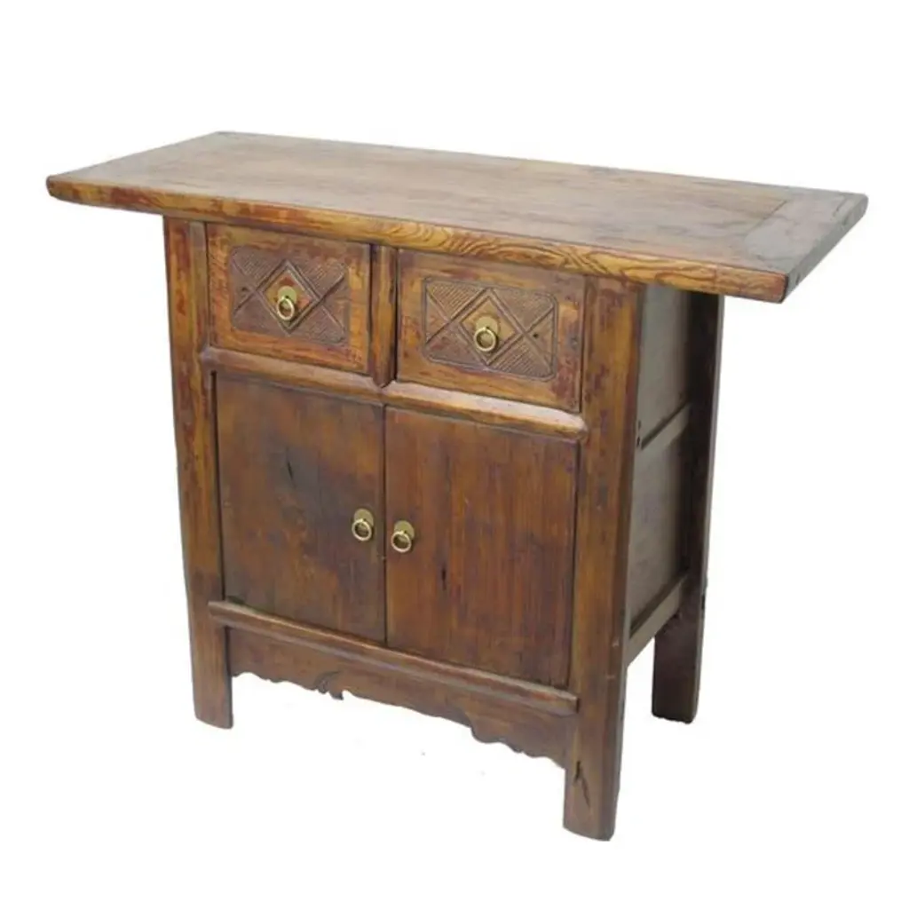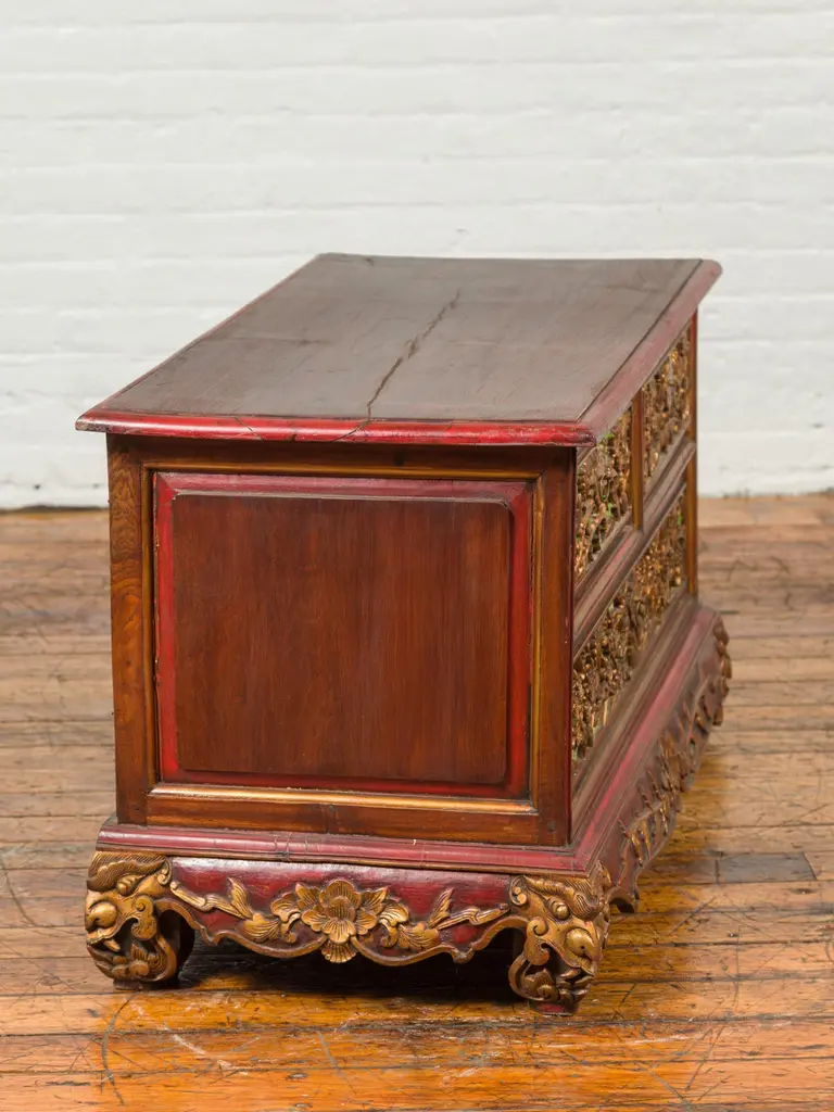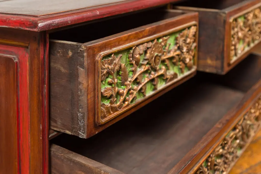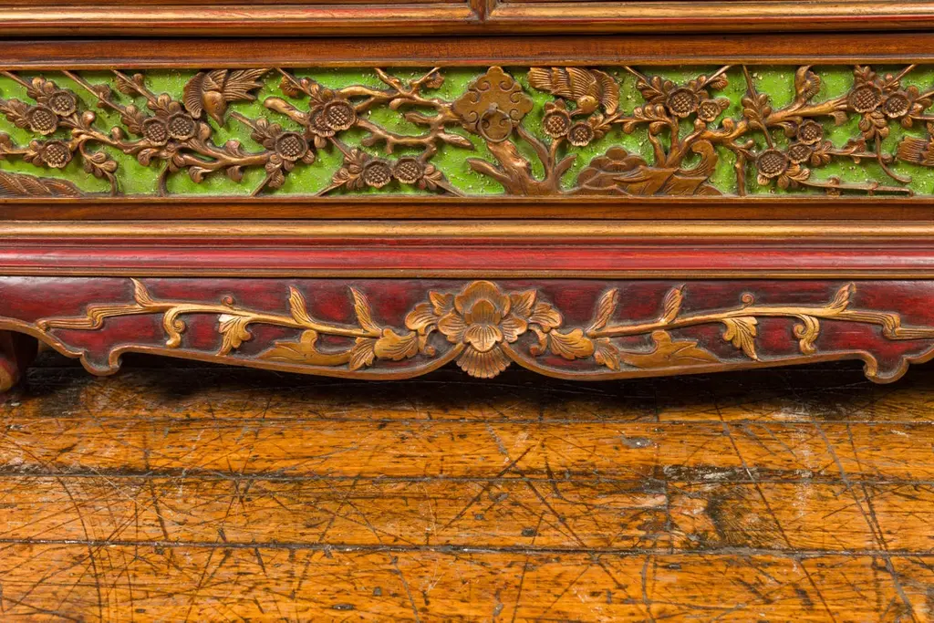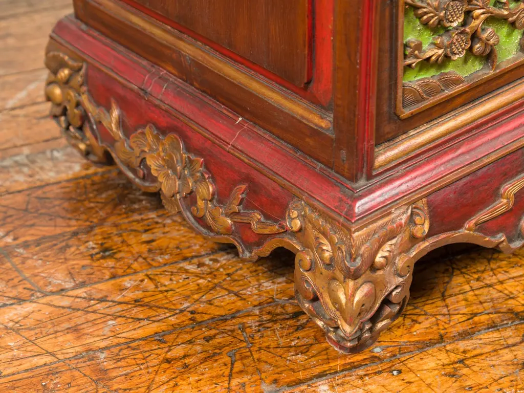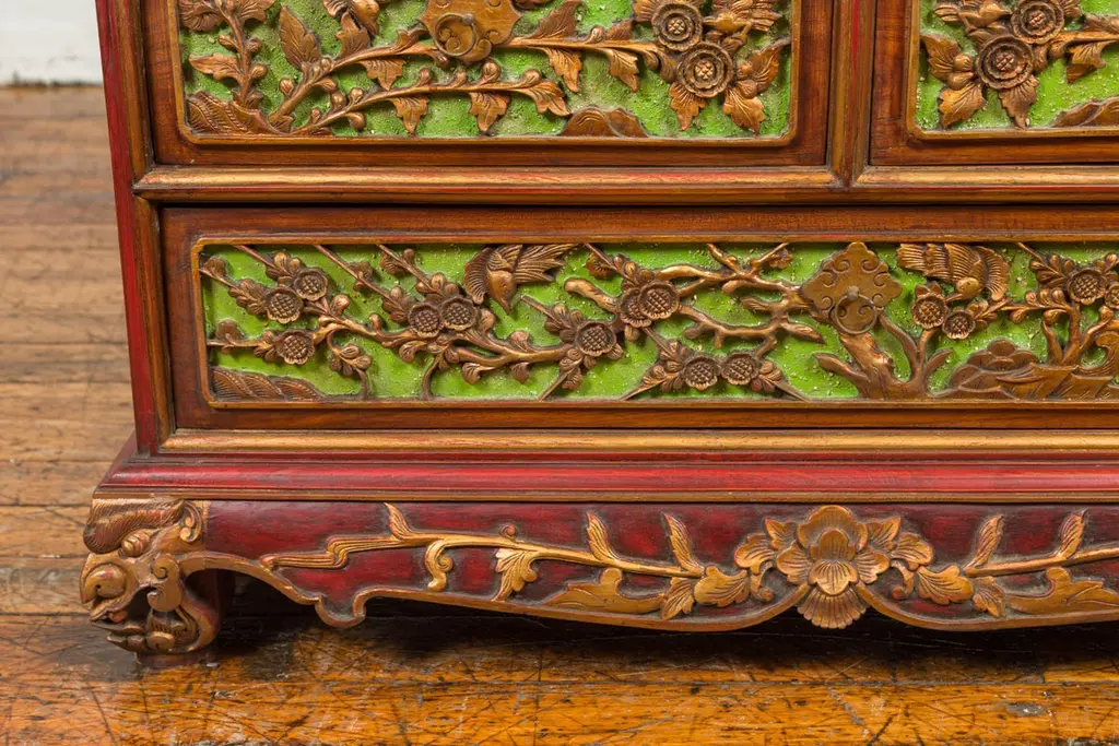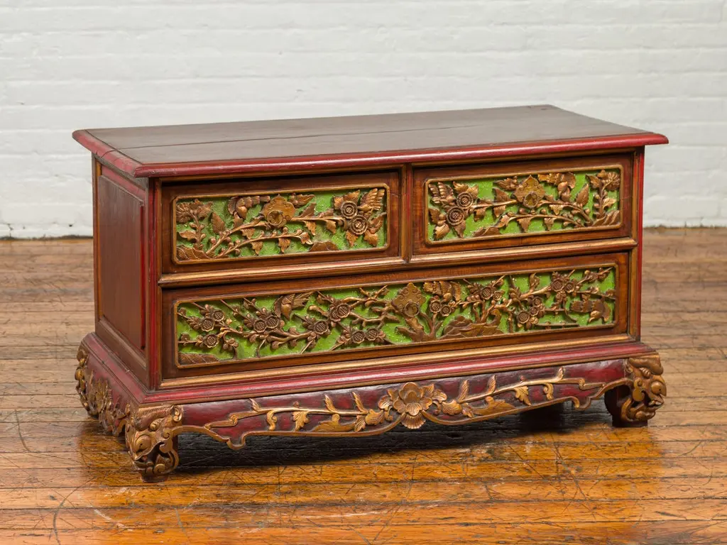An Indonesian polychrome dresser from Madura with carved drawers and verdigris highlights. We have another dresser available that is very similar and will make for a perfect pair. See item LU863919142832. Immerse yourself in the captivating artistry of this 19th-century Indonesian polychrome dresser from Madura, an island known for its rich cultural heritage off the northeastern coast of Java. This exquisite dresser, with its intricate carved floral motifs and striking green highlights, is a testament to the skilled craftsmanship and vibrant aesthetic of Madurese art.The dresser features a rectangular top with beveled edges, lending a refined touch to its robust structure. Below, three drawers - two smaller ones atop a larger one - showcase gilt carved flowers and foliage, their golden hues vividly contrasting against a green background. This combination of colors - gold, green, brown, and red accents - creates a dynamic and visually stunning palette.The dresser stands on short scrolling feet, each foot carved with mask motifs, adding a mystical and cultural element to the piece. These feet are connected by a skirt that is decorated on three sides, enhancing the dresser's overall ornate appearance.In a modern home, this Madurese dresser can serve as a magnificent focal point in a living room or bedroom. Its rich carvings and colorful polychromy make it an ideal choice for those who appreciate unique, statement furniture pieces. The dresser offers practical storage while adding a touch of 19th-century Indonesian elegance to your space. Accompanied by a similar chest (shown in image 4 and available separately), these dressers can create a harmonious and striking pair in any interior setting. Each chest, priced at $1,600, is not just a piece of furniture but a piece of art, embodying the beauty and history of Madurese craftsmanship.